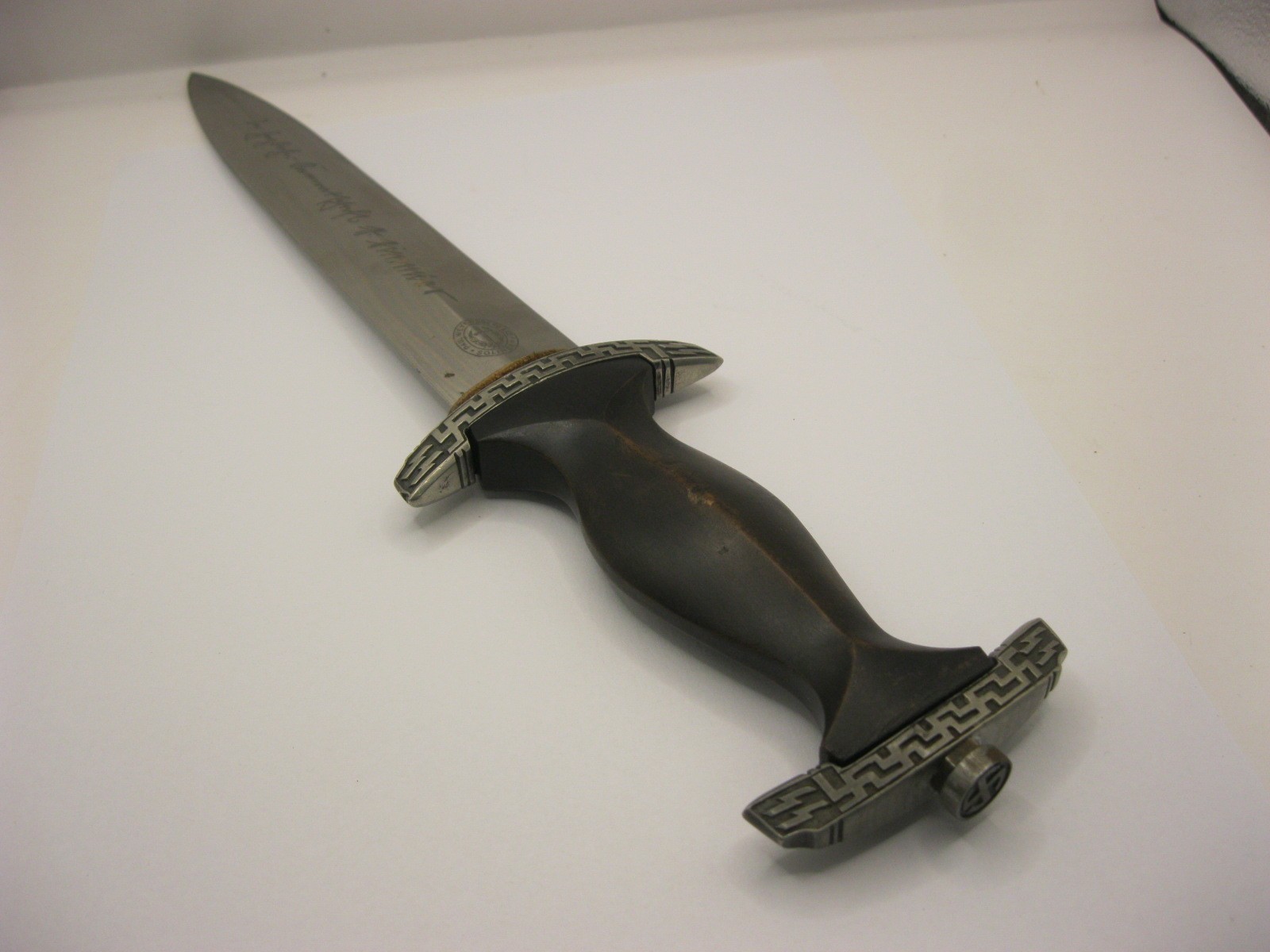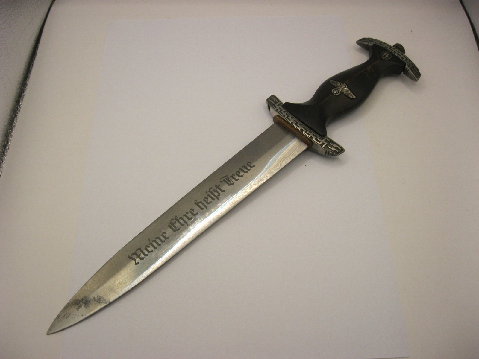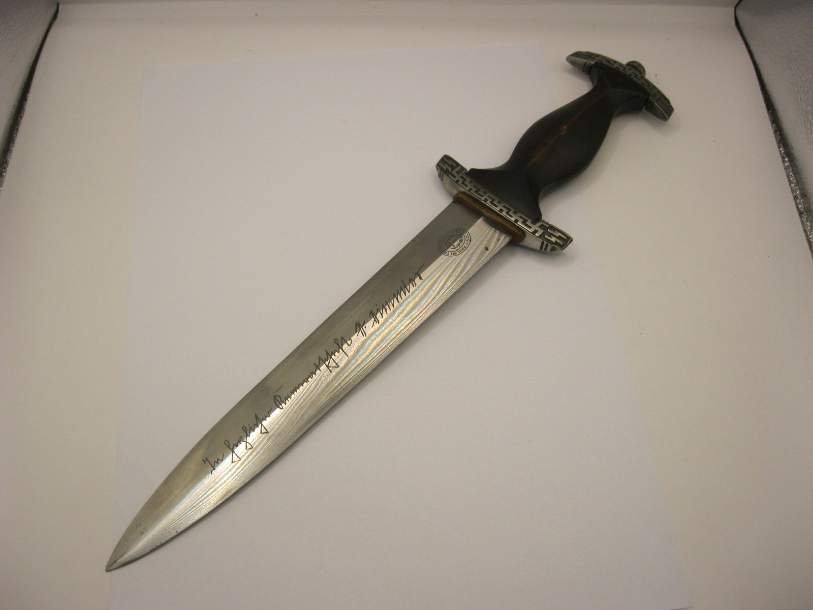 An SS Honour Dagger (SS-Ehrendolch), likely a reproduction, the blade marked for Paul Weyersberg of Solingen and engraved to one side 'Meine Ehre hisst Treue' (My honour is loyalty) and to the other 'In herzlicher Kameradschaft - H Himmler' (In warm cameraderie - H Himmler). In good condition, as pictured - no scabbard. As always, buyers are reminded that it is their responsibility to satisfy themselves as to originality.