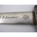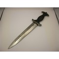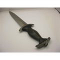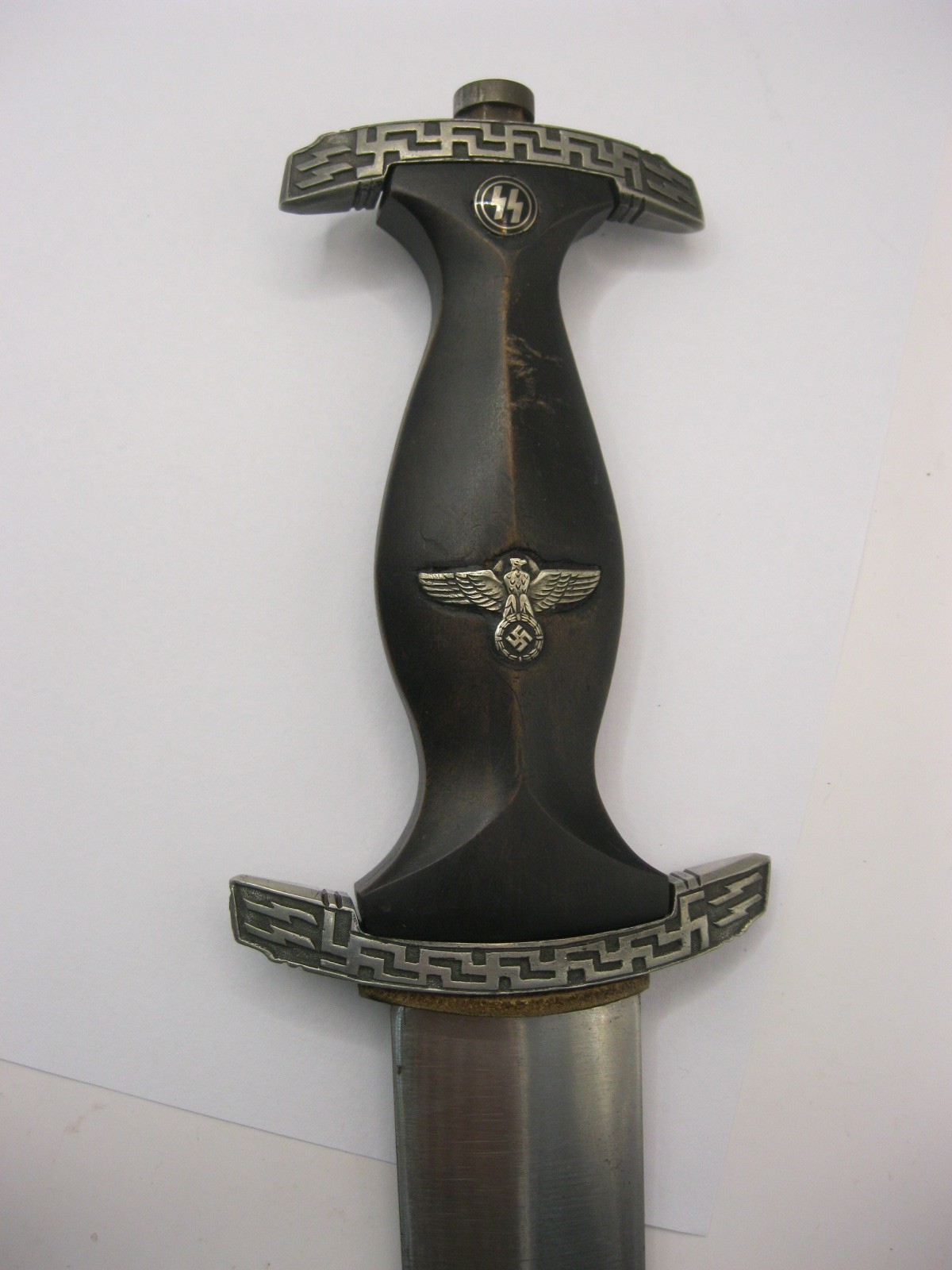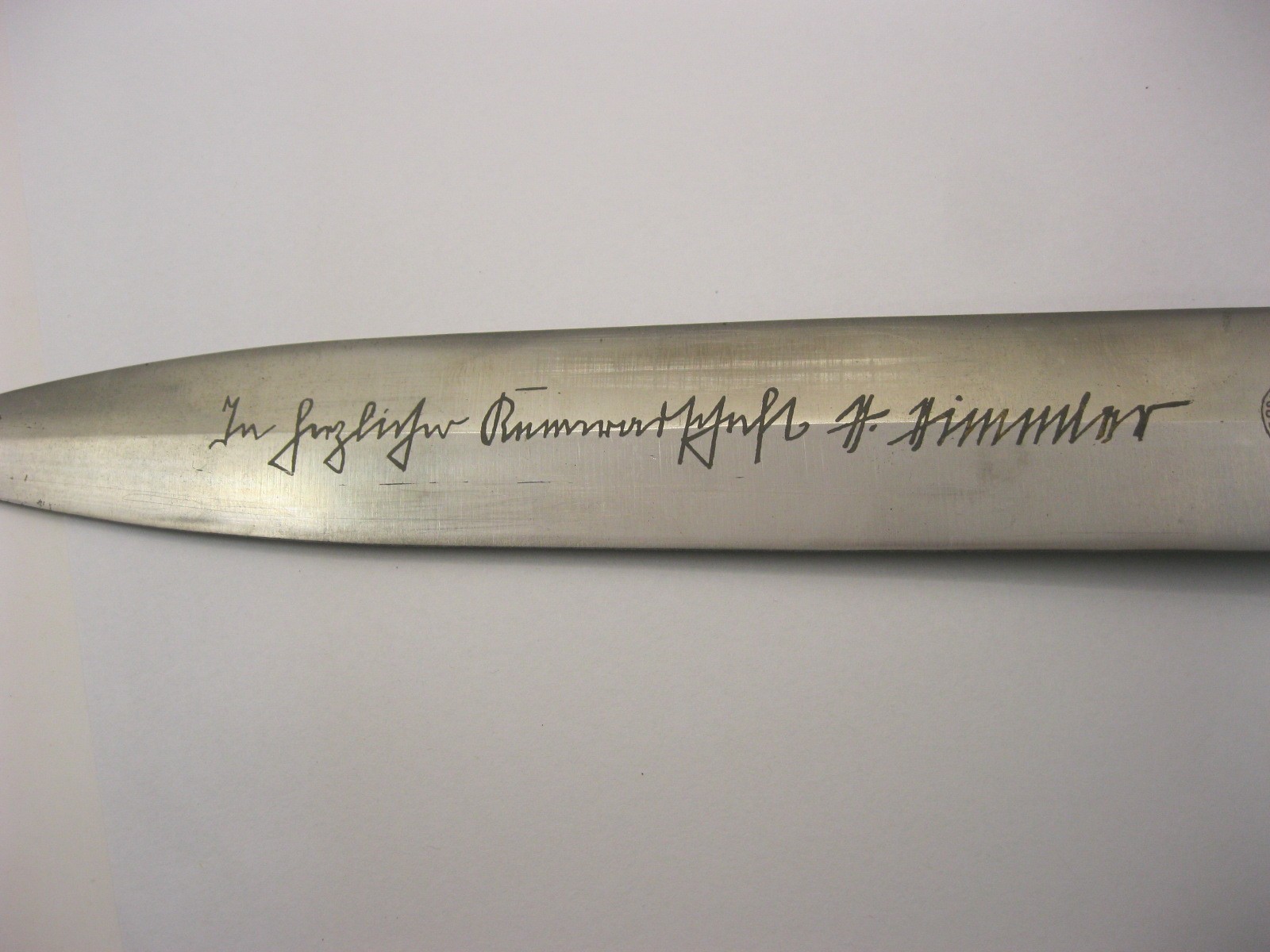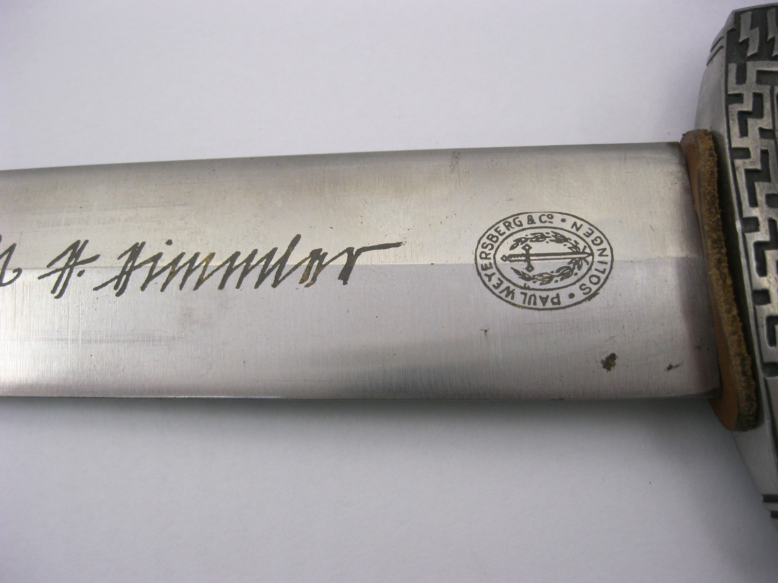 An SS Honour Dagger (SS-Ehrendolch), likely a reproduction, the blade marked for Paul Weyersberg of Solingen and engraved to one side 'Meine Ehre hisst Treue' (My honour is loyalty) and to the other 'In herzlicher Kameradschaft - H Himmler' (In warm cameraderie - H Himmler). In good condition, as pictured - no scabbard. As always, buyers are reminded that it is their responsibility to satisfy themselves as to originality.