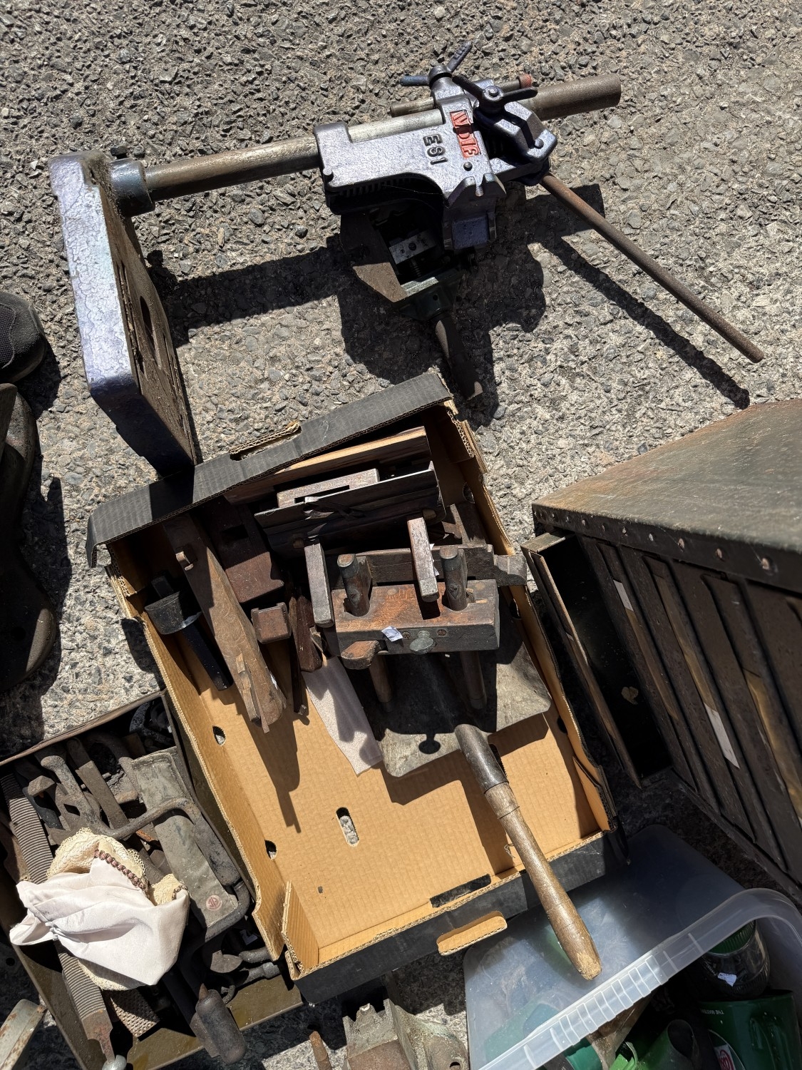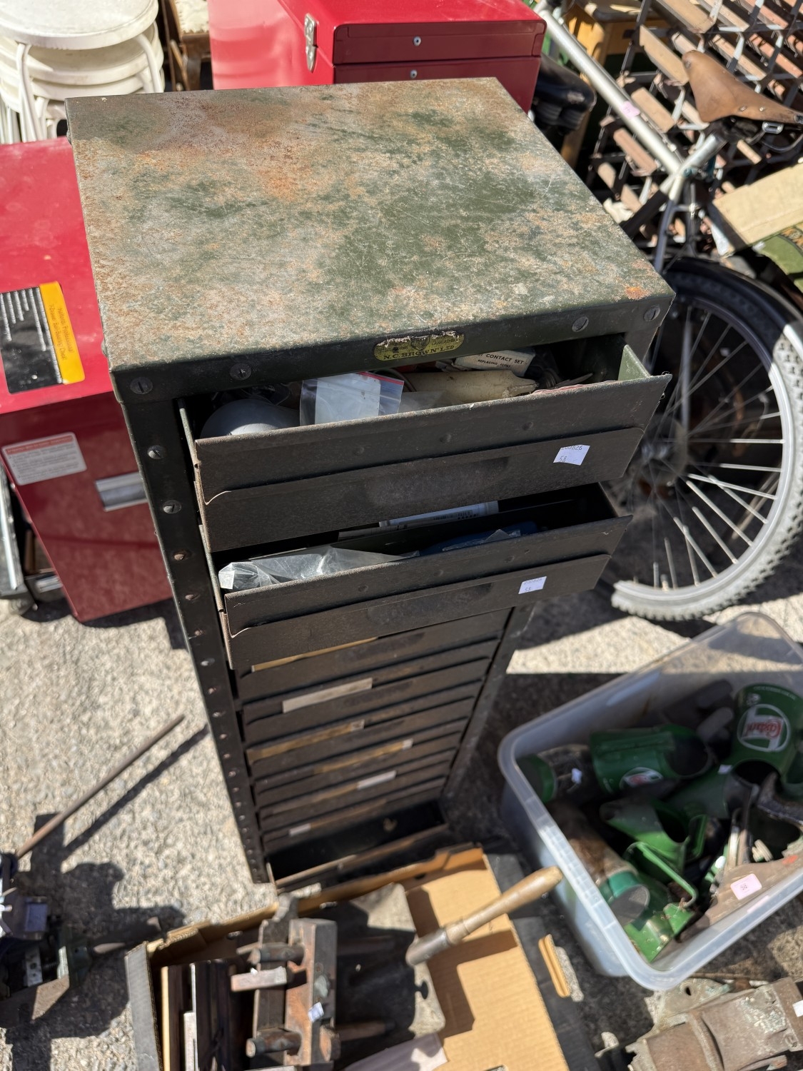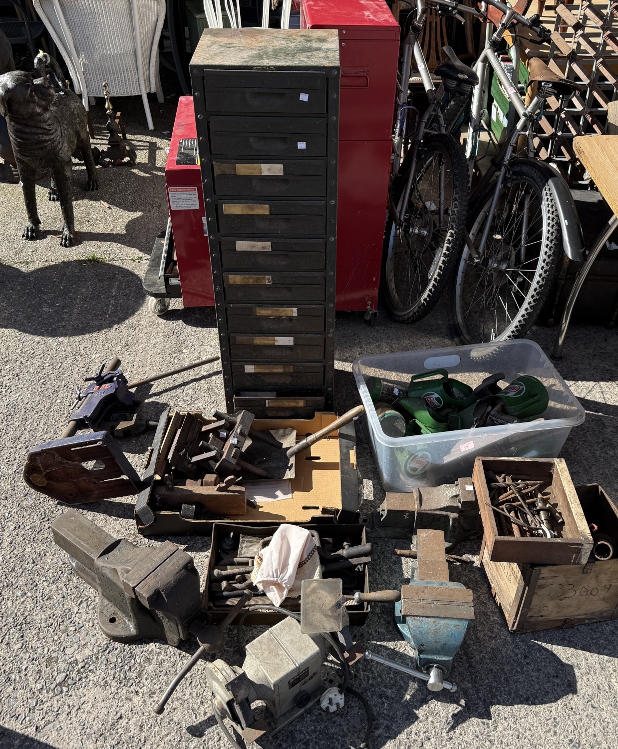 A large selection of vintage tools, planes, with tool cabinet and contents.