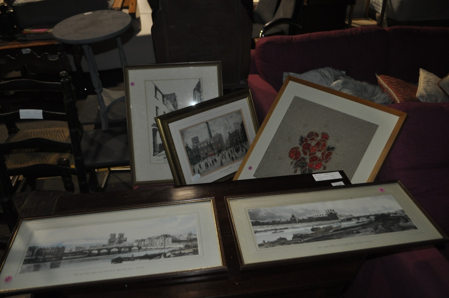 A COLLECTION OF SIX VINTAGE PRINTS AND ARTWORKS INC GILT-FRAMED "COMING HOME FROM THE MILL" L.S. LOWRY PRINT, A BERNARD WILLINGTON PEN STUDY, A DANIEL DERVEAUX SKETCH AND MORE