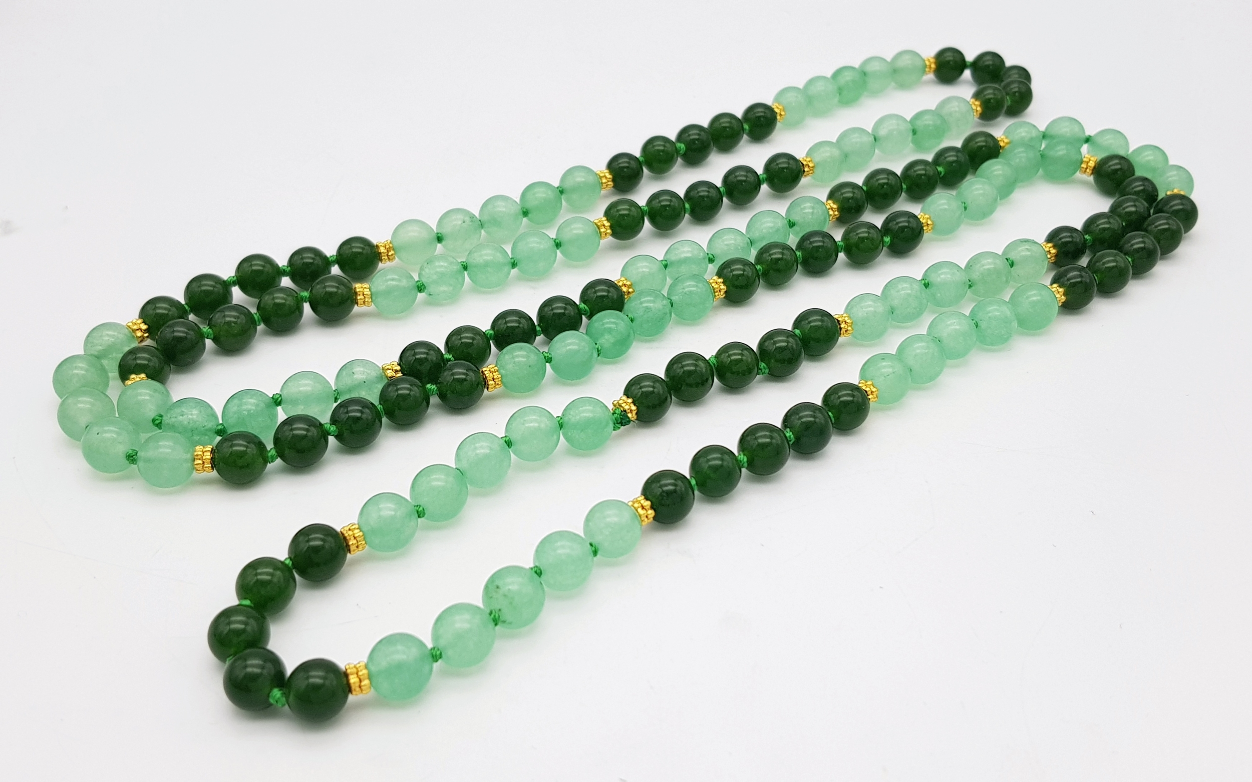A Pale and Dark Green Jade Rope Length Necklace. 8mm jade beads. 130cm length.