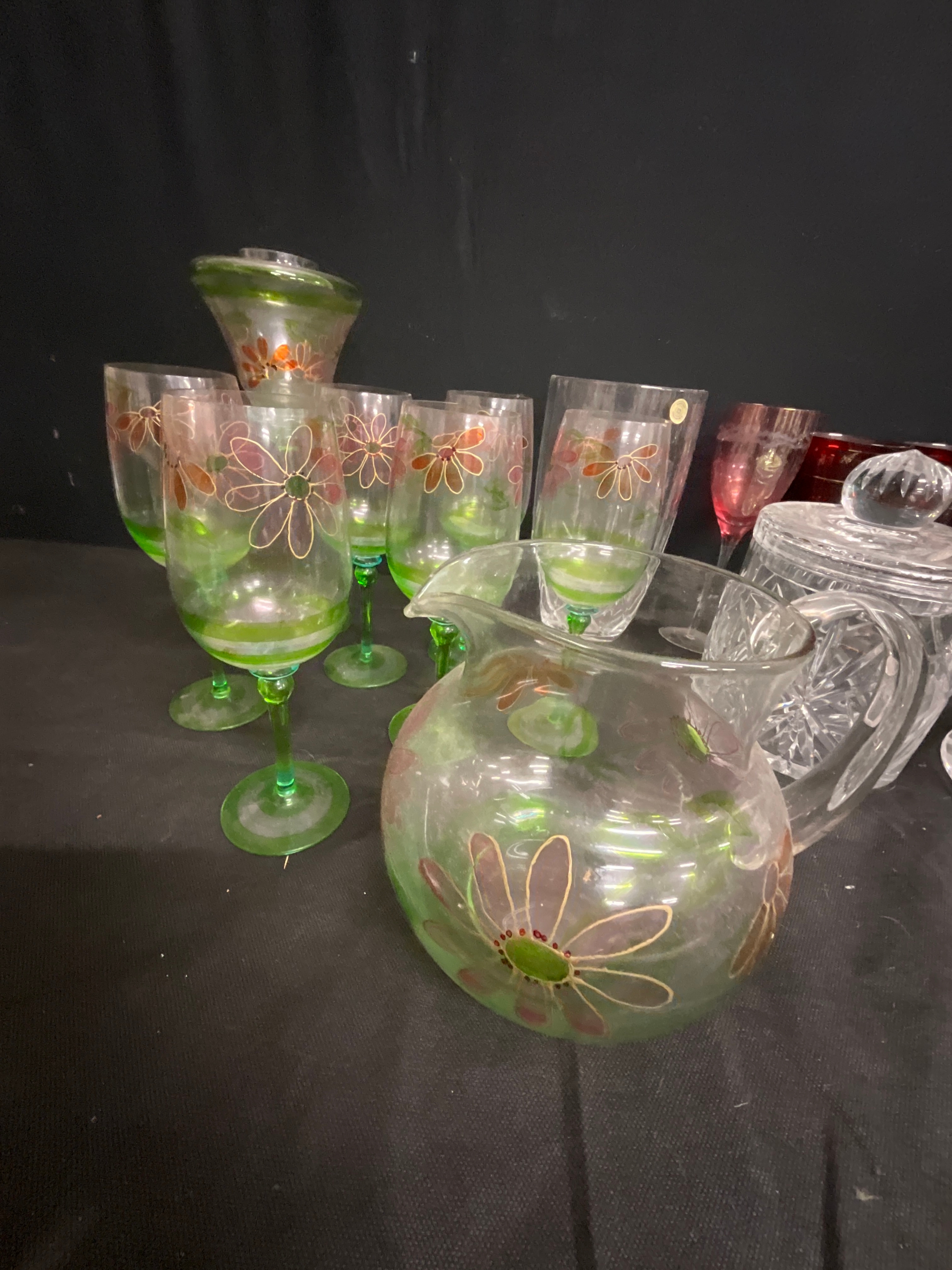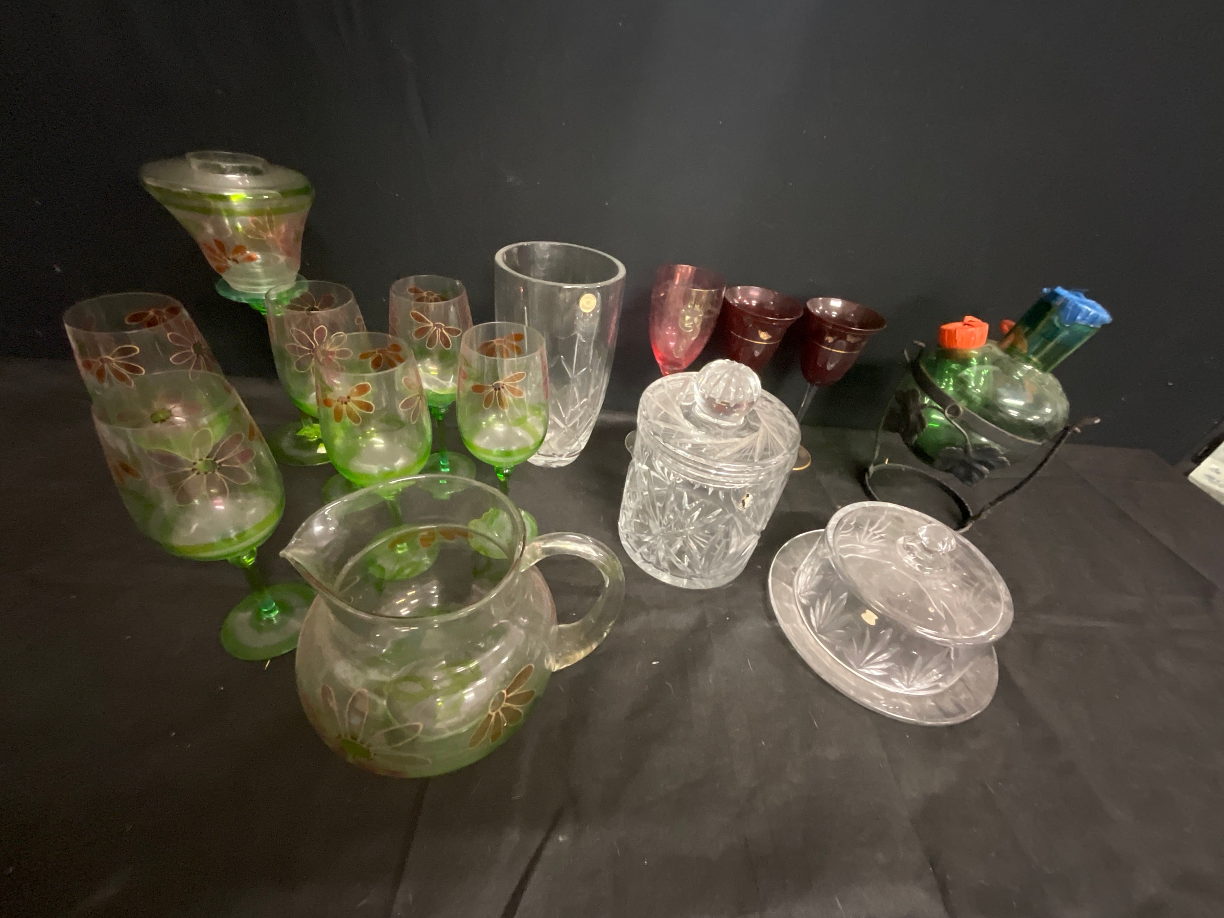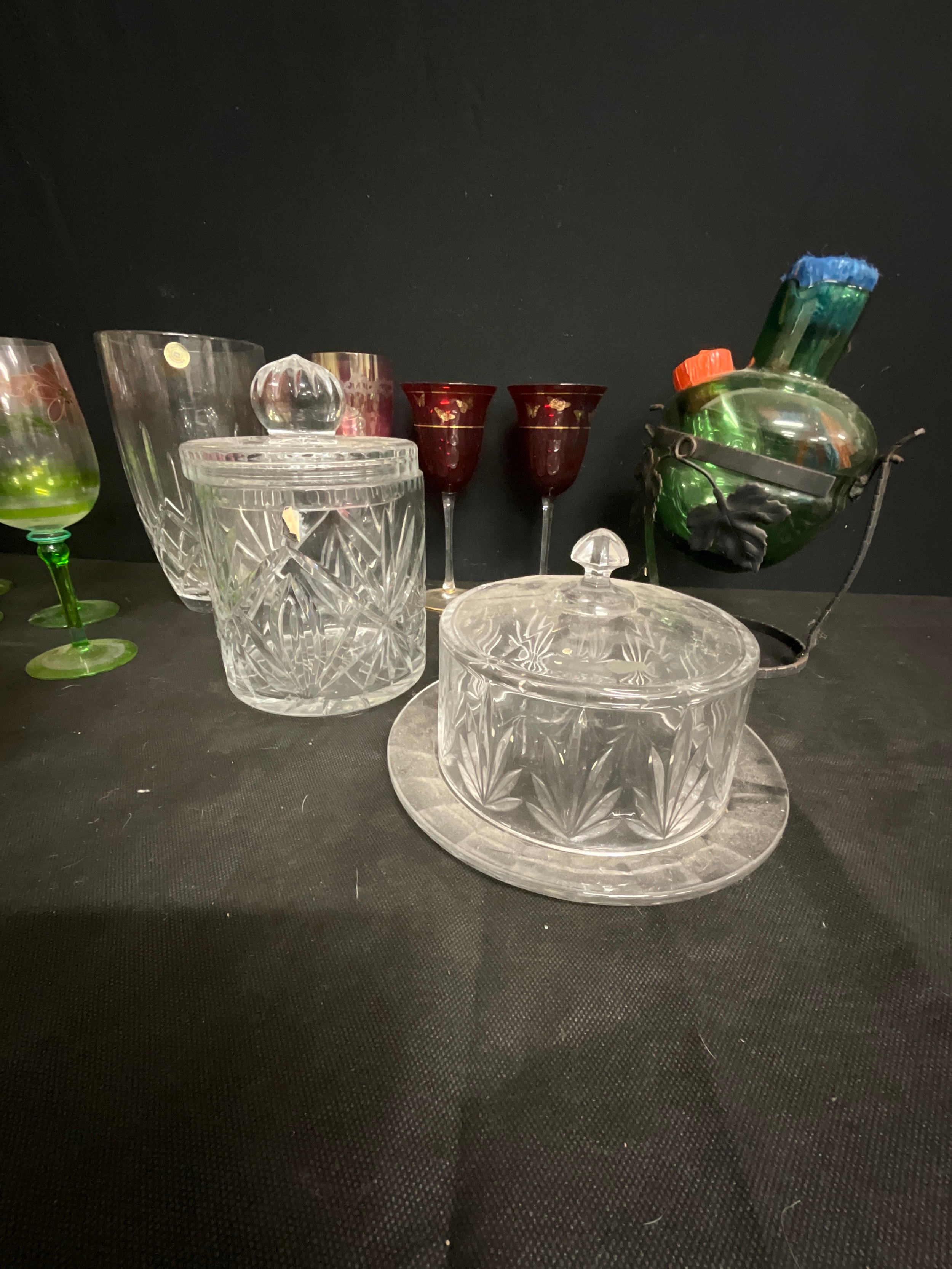 BOX OF GLASSWARE TO INCLUDE JUG AND GLASSES SET CHEESE DISH ETC