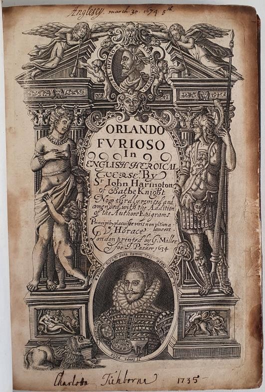 Orlando Furioso in English Heroical Verse by Sir John Harrington of Bath Knight. Now thirdly revised and amended with the Addition of the Author's Epigrams. ARIOSTO, Lodovico Published by Printed by G. Miller for J. Parker, London, 1634. Bookplate of The Rev Mr Lee attached, full calf