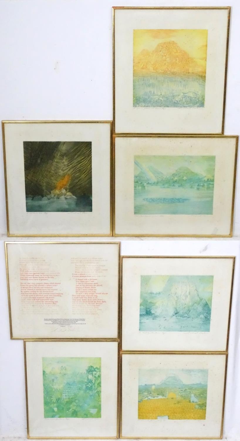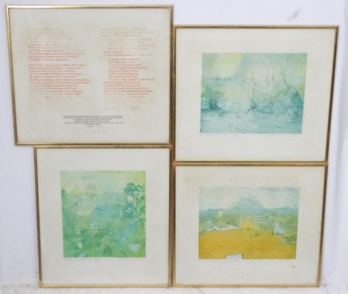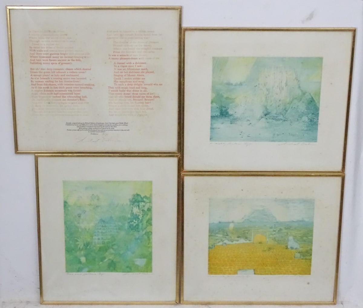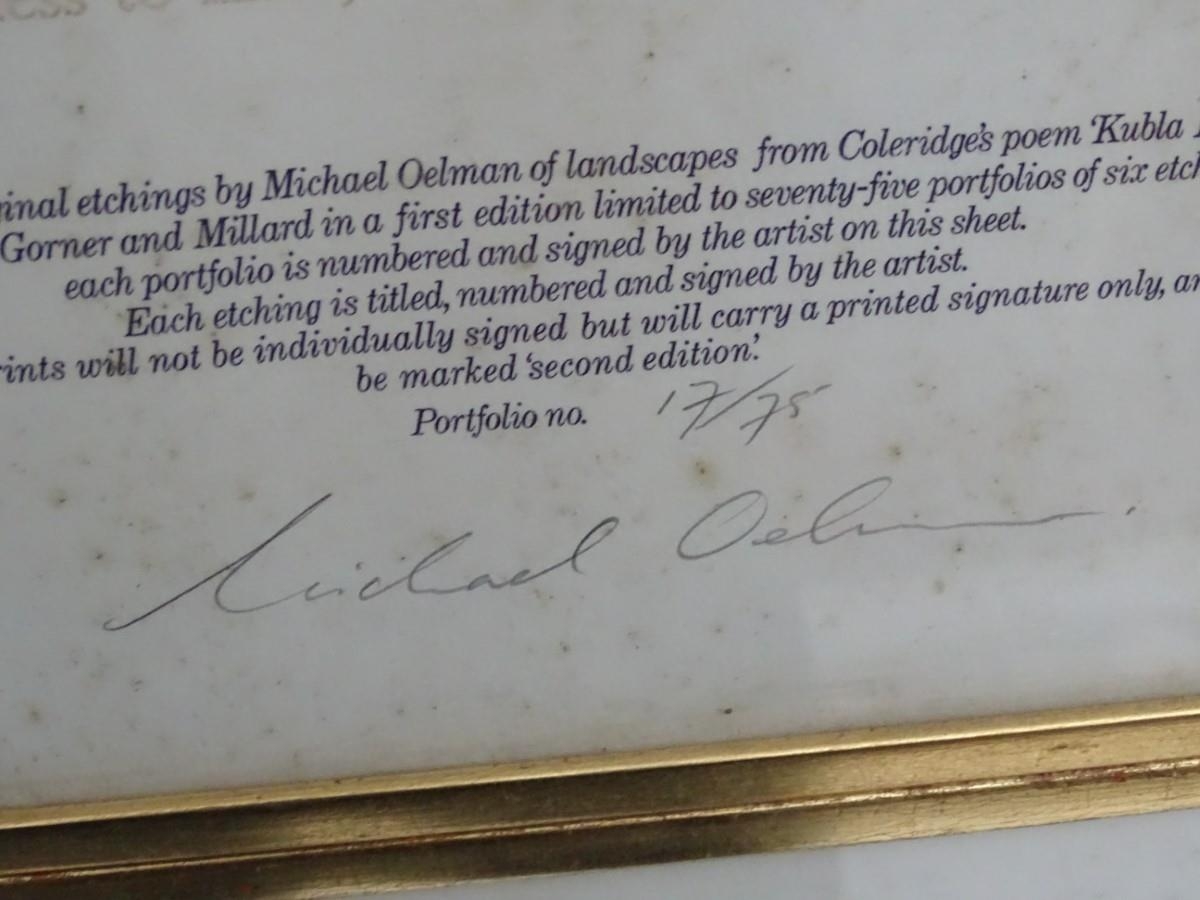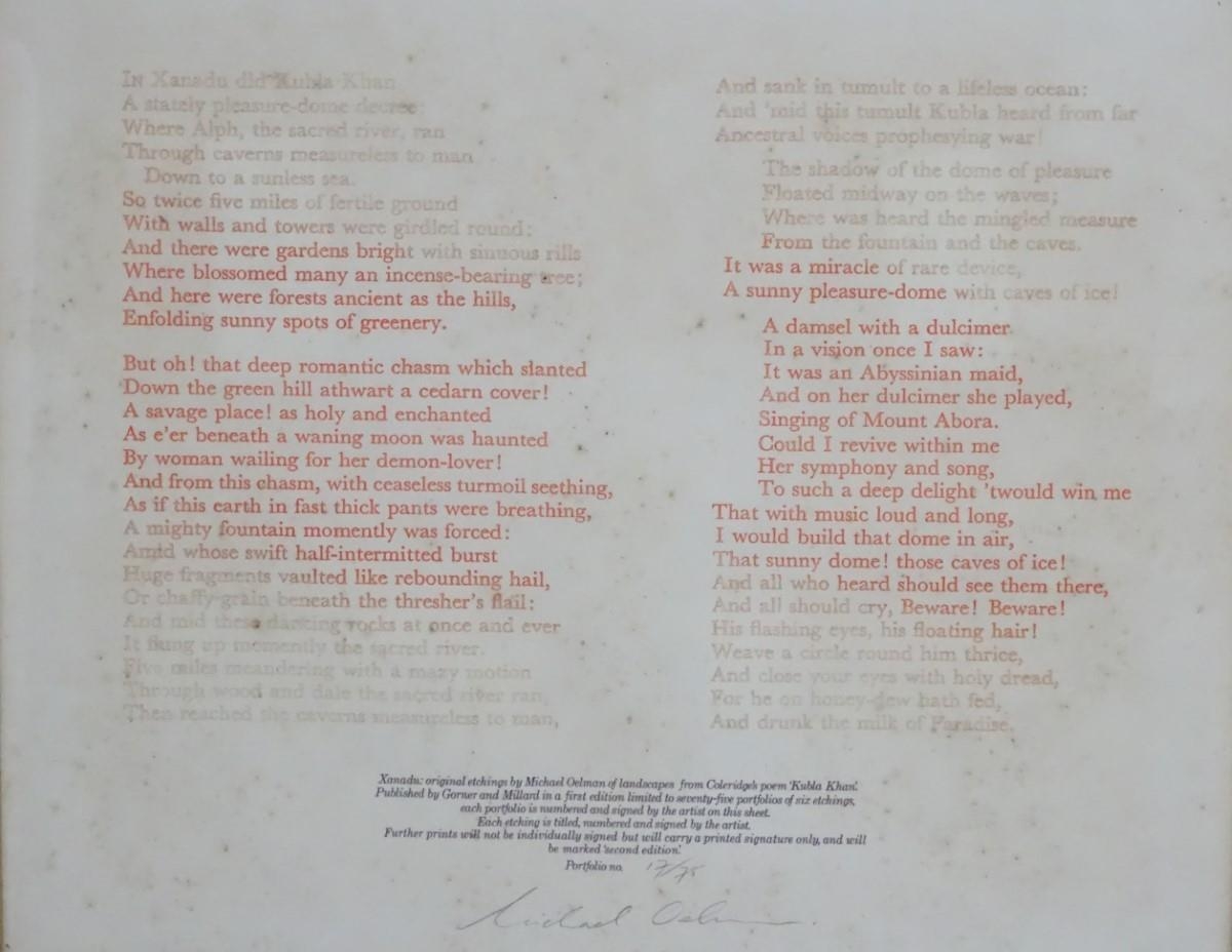 Michael Oelman (1941-), Etchings (7), 'Xanadu', 'A Mighty Fountain', (17/75) 'There Were Gardens', (17/75) 'A Sunless Sea', (17/75) 'A Sunny Pleasure Dome', (17/75) 'Alph, The Sacred River', (17/75) together with the poem 'Kubla Khan' by Samuel Taylor Coleridge, with framed signed proof of the portfolio. Portrait etchings approx. 12 3/4 x 11 3/4'' Landscape etchings approx. 10 3/4 x 13 3/4'' Published by Gorner & Miller in a first edition limited to 75 portfolios of 6 etchings, each titled, numbered and signed by the artist.