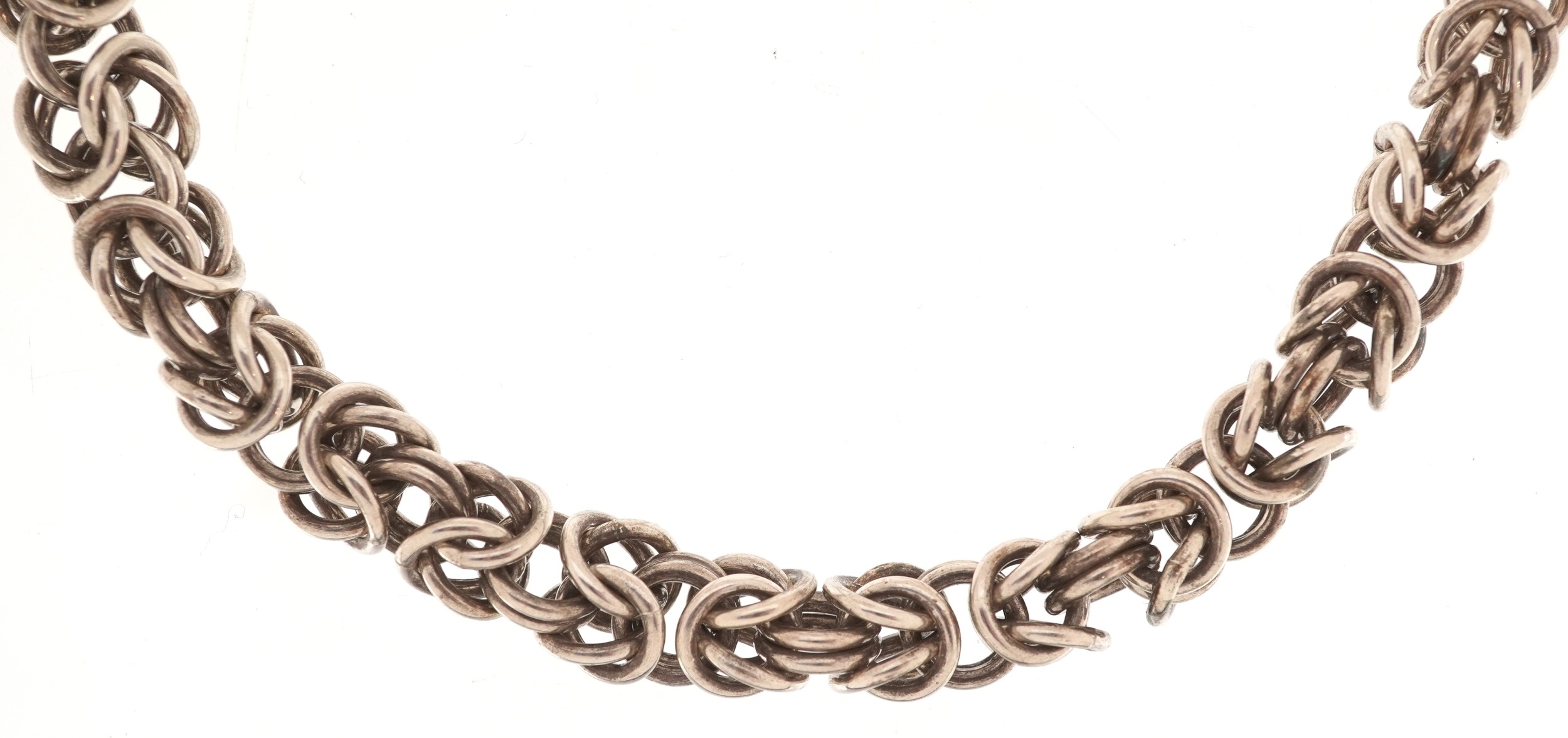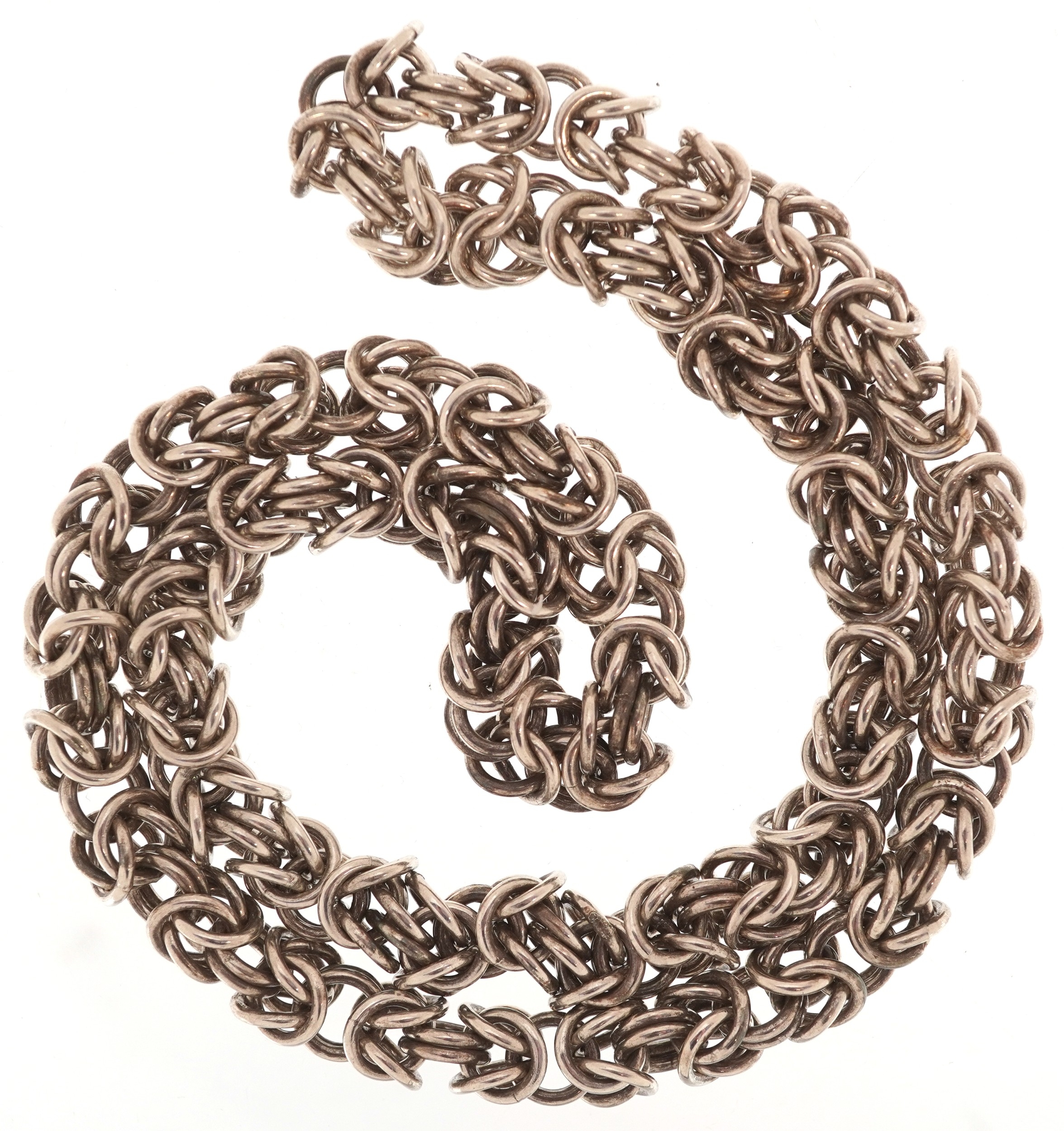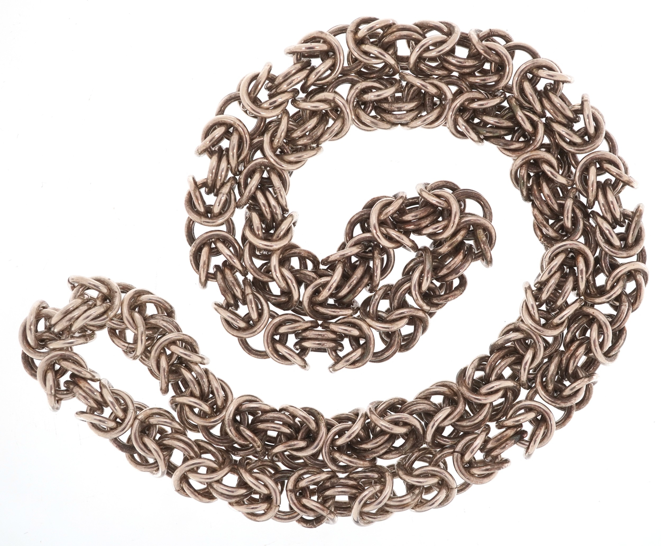 A white metal Byzantine link necklace, 60cm in length, 167.2g.