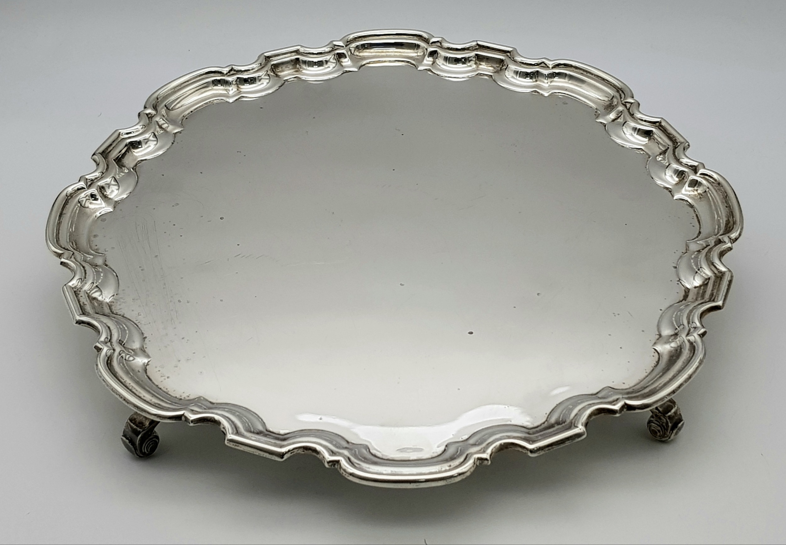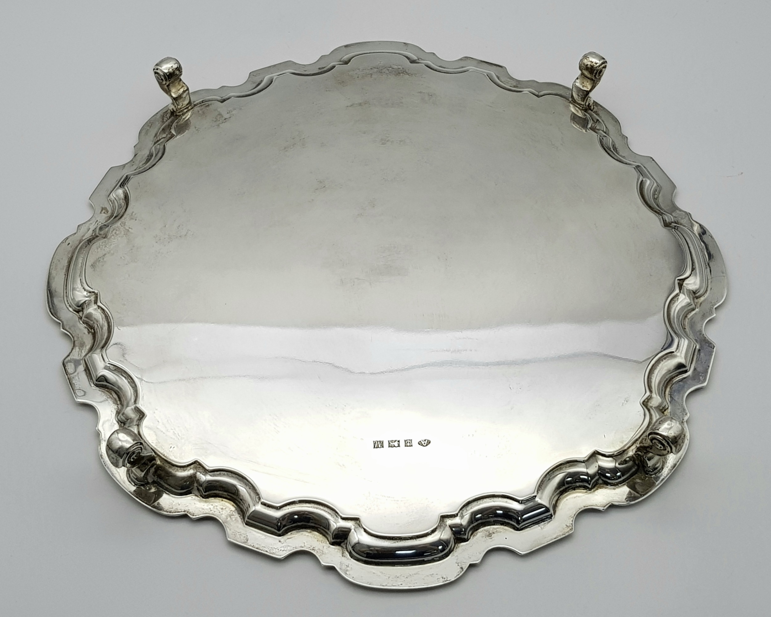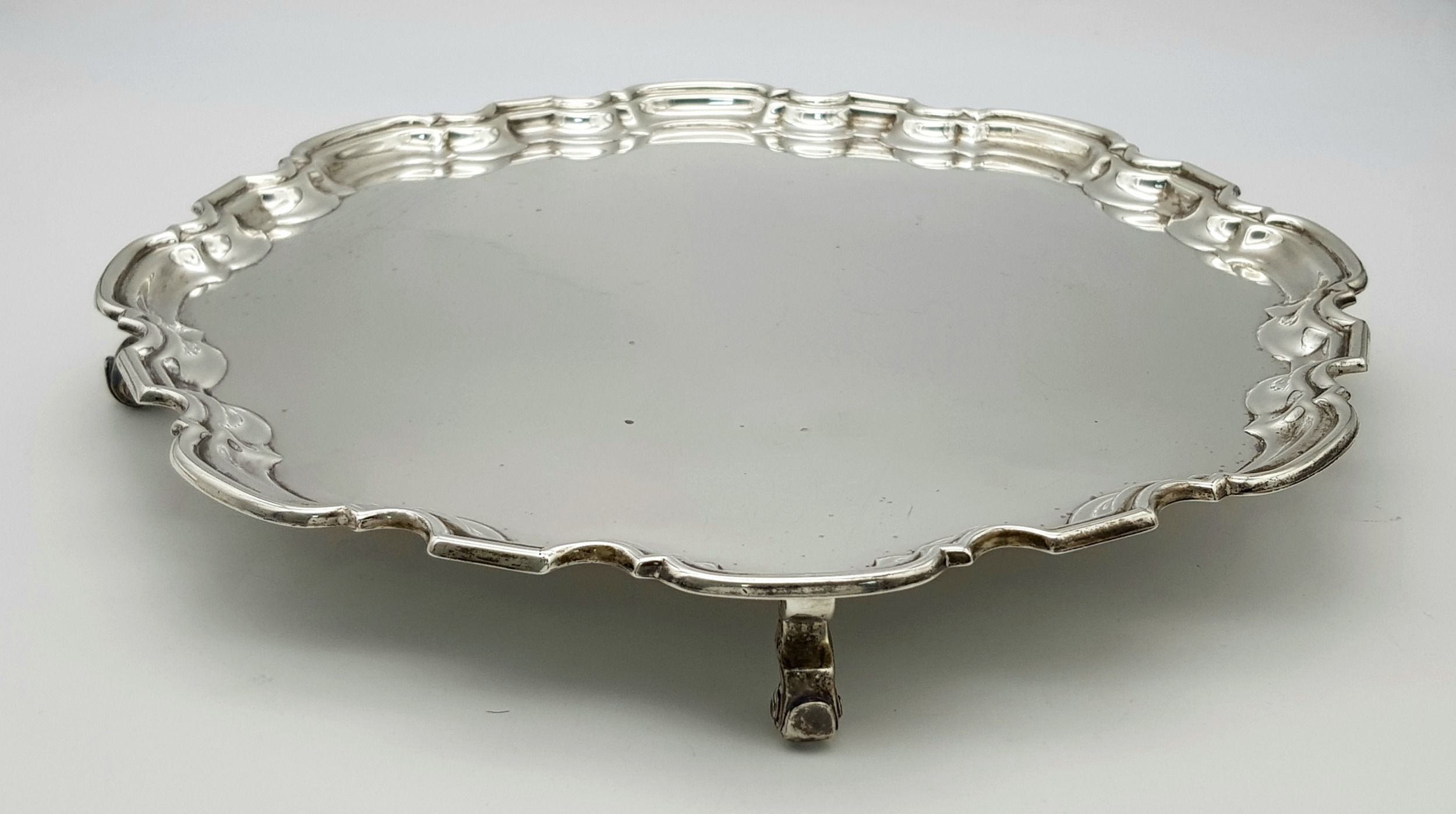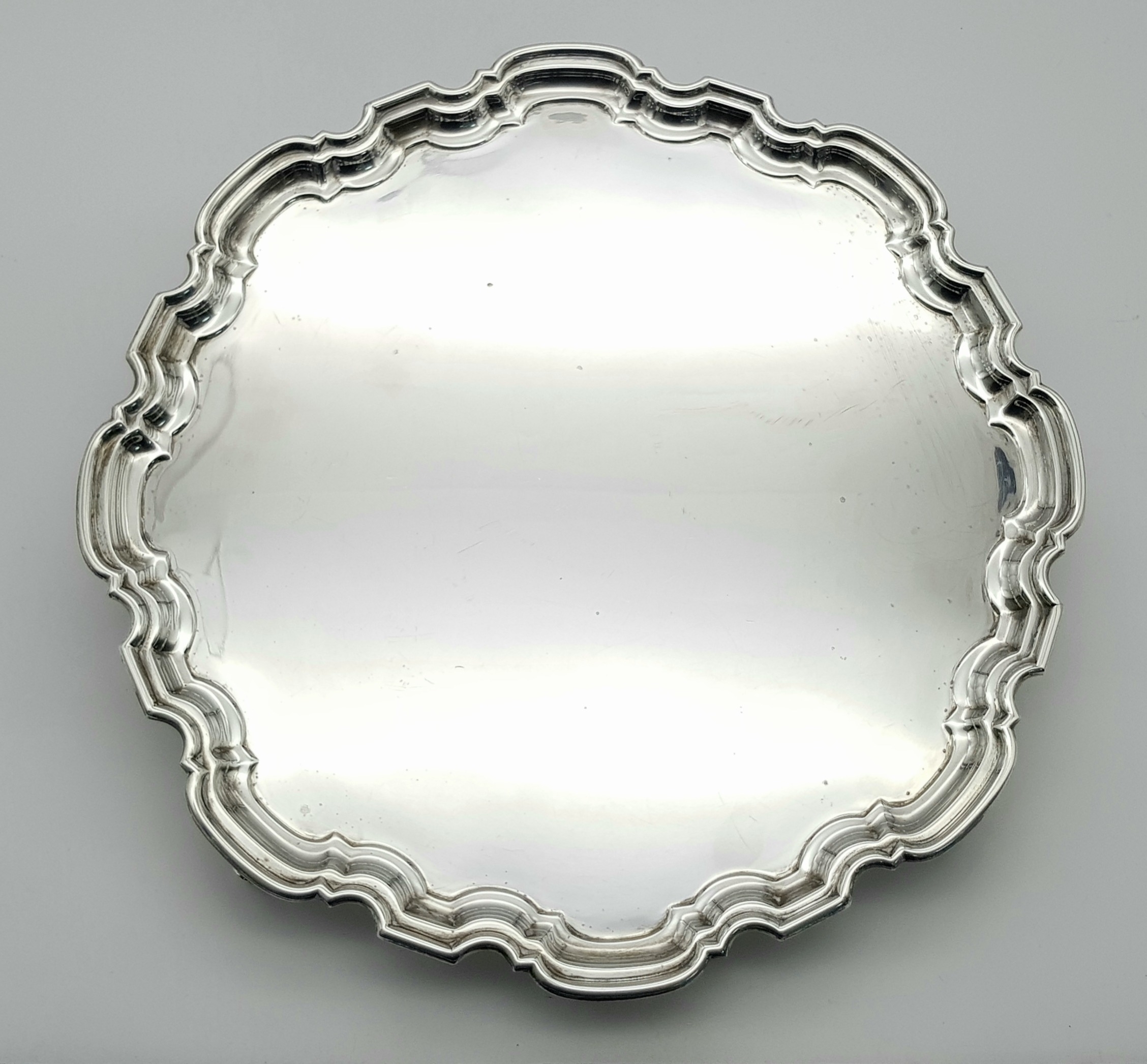 A SOLID SILVER SALVA HAVING A 1961 BIRMINGHAM HALLMARK . 0.86Kilo 32cms DIAMETER