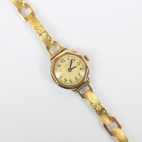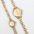 A ladies 9ct Cyma Cymaflex wristwatch, the circular cream coloured dial with baton and Arabic markers and subsidiary dial to 6 o'clock, set to plain polished case, 2.4cm wide (including crown) upon associated 9ct hollow bracelet, approx. 17cm long, with a further 9ct Rotary ladies wristwatch, gross weight 29gms (including movements) (2) (at fault)