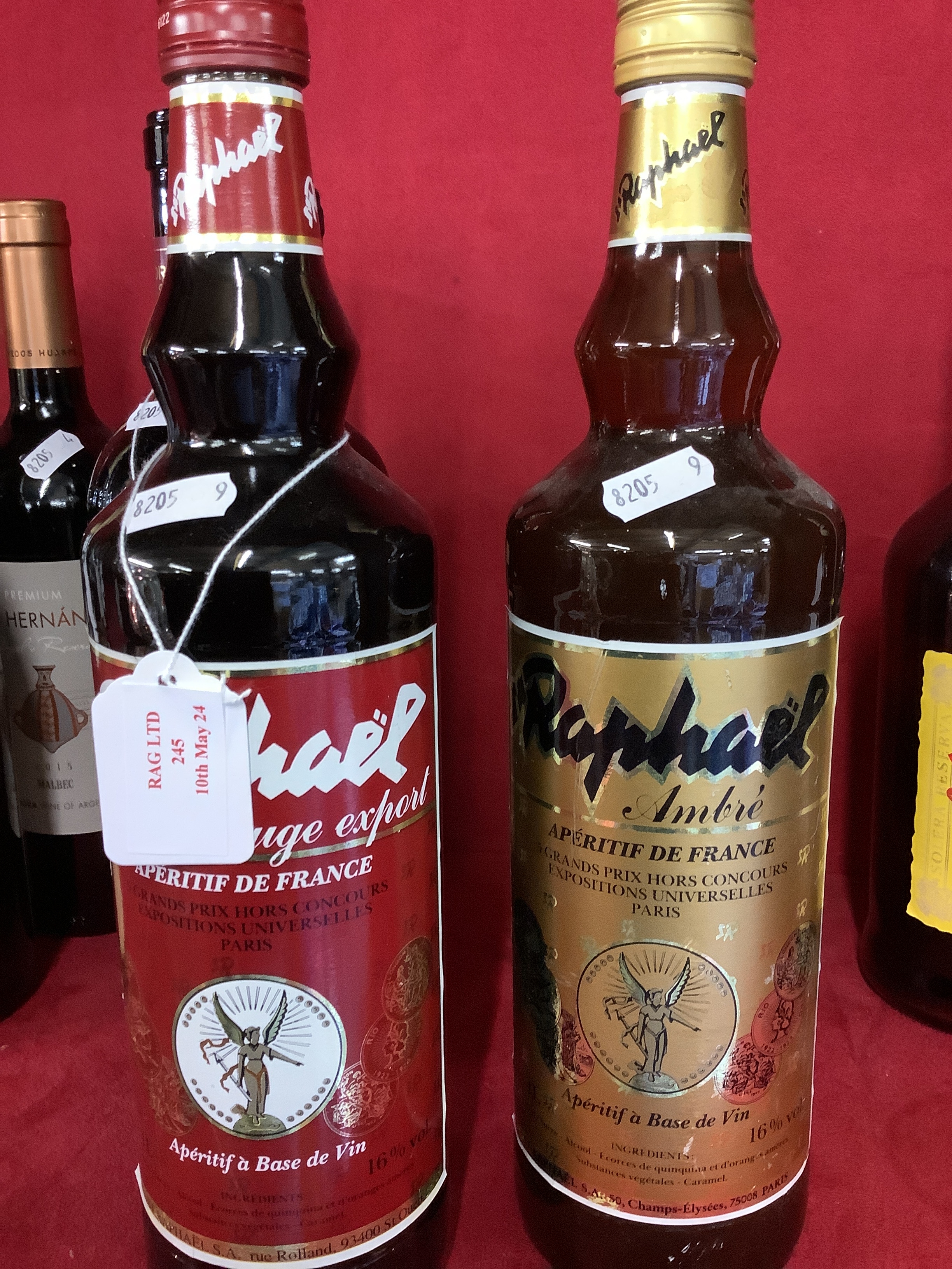 A bottle of Raphael Rouge Export Aperitif de France together with a bottle of Raphael Ambre
