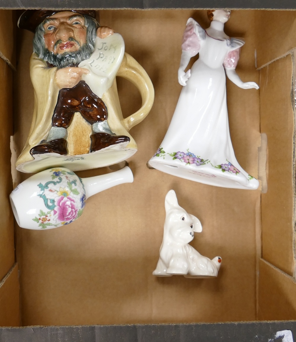 A beswick dog with ladybird on tail: Together with Royal Doulton Booths Floradora vase, jug & figure. (4)