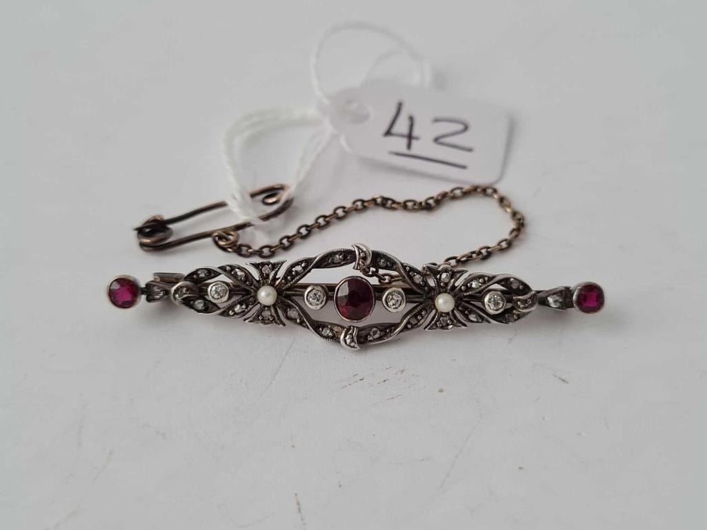 A Victorian ruby and diamond and pearl brooch set in silver and gold