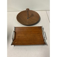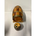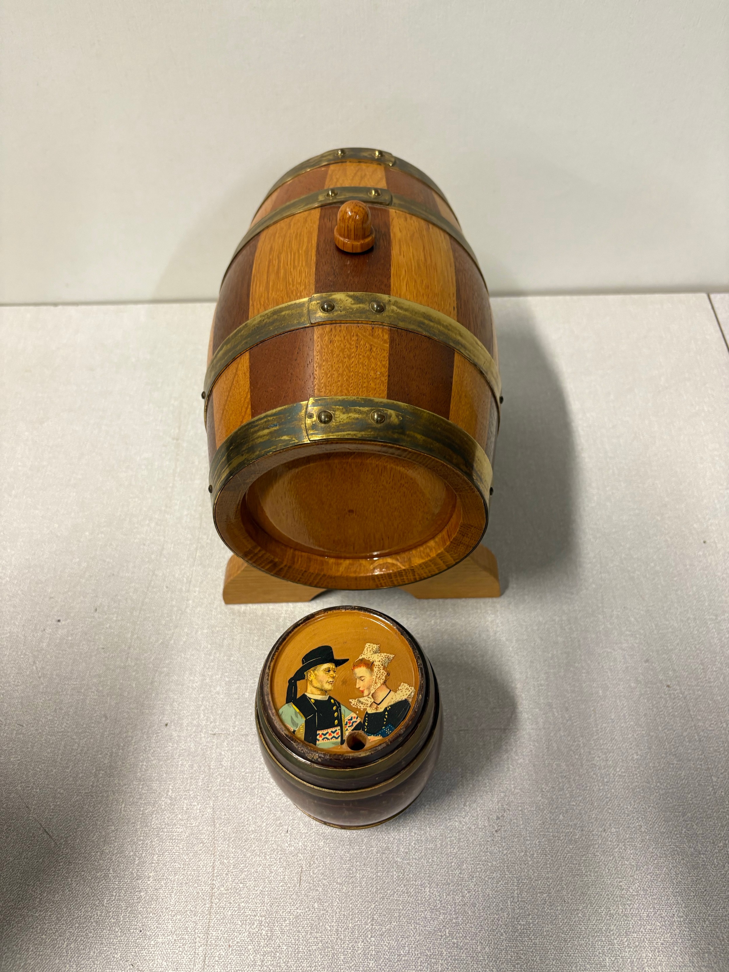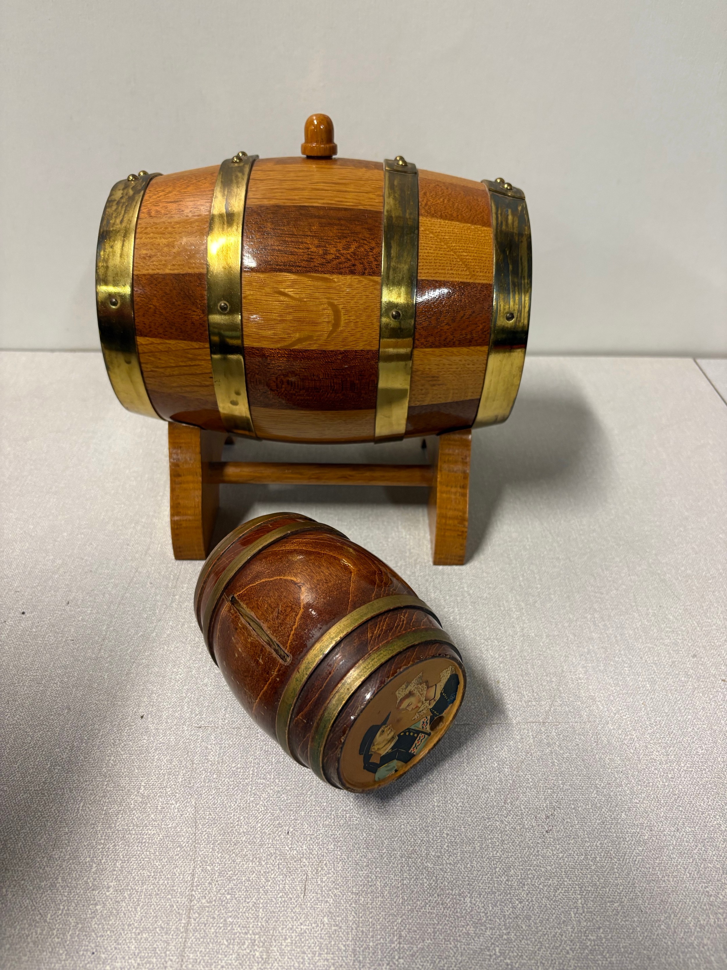 Large oak and brass barrel on stand along with 1 other.