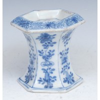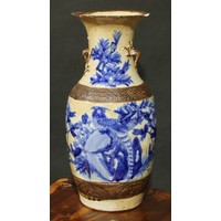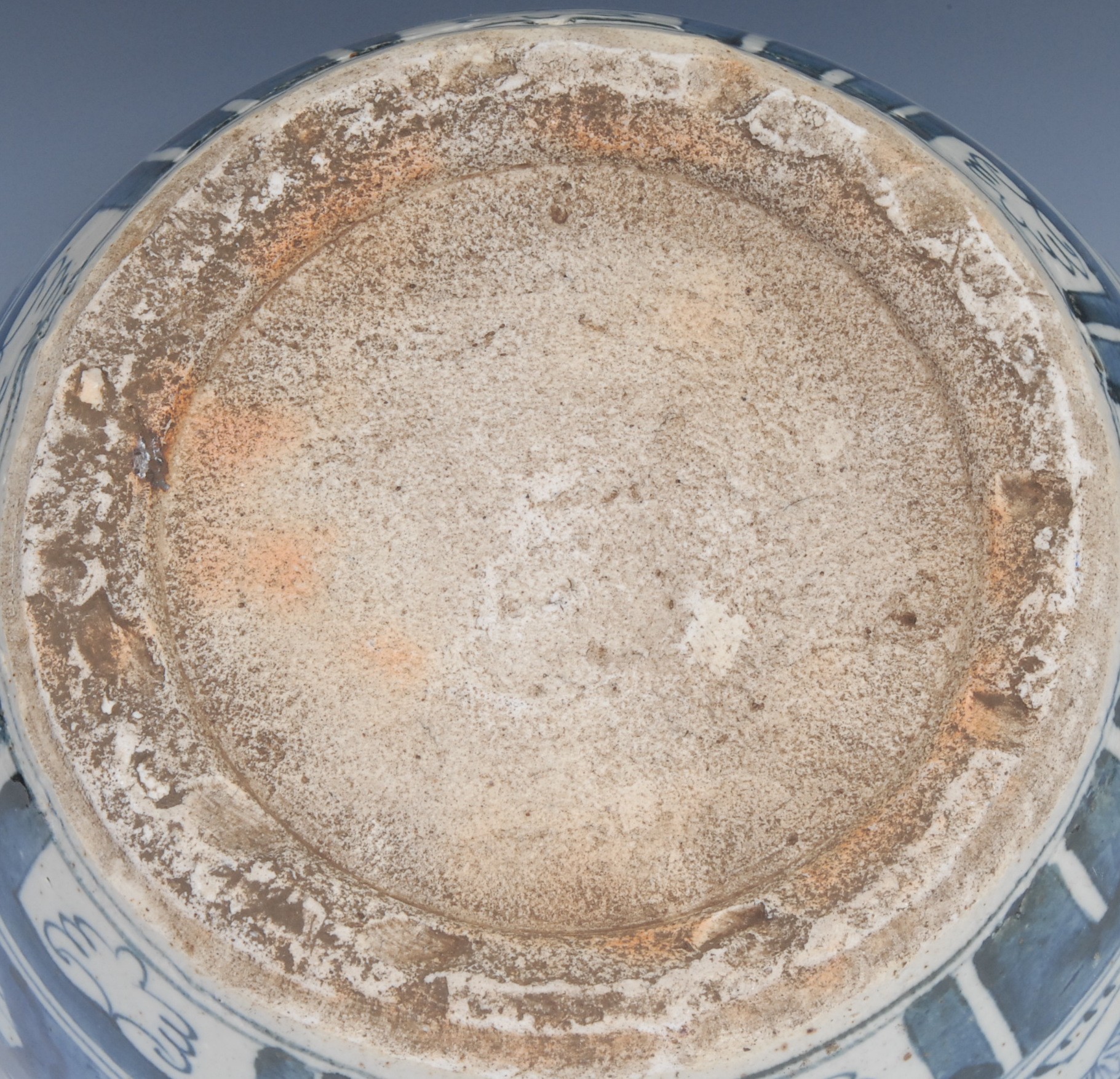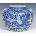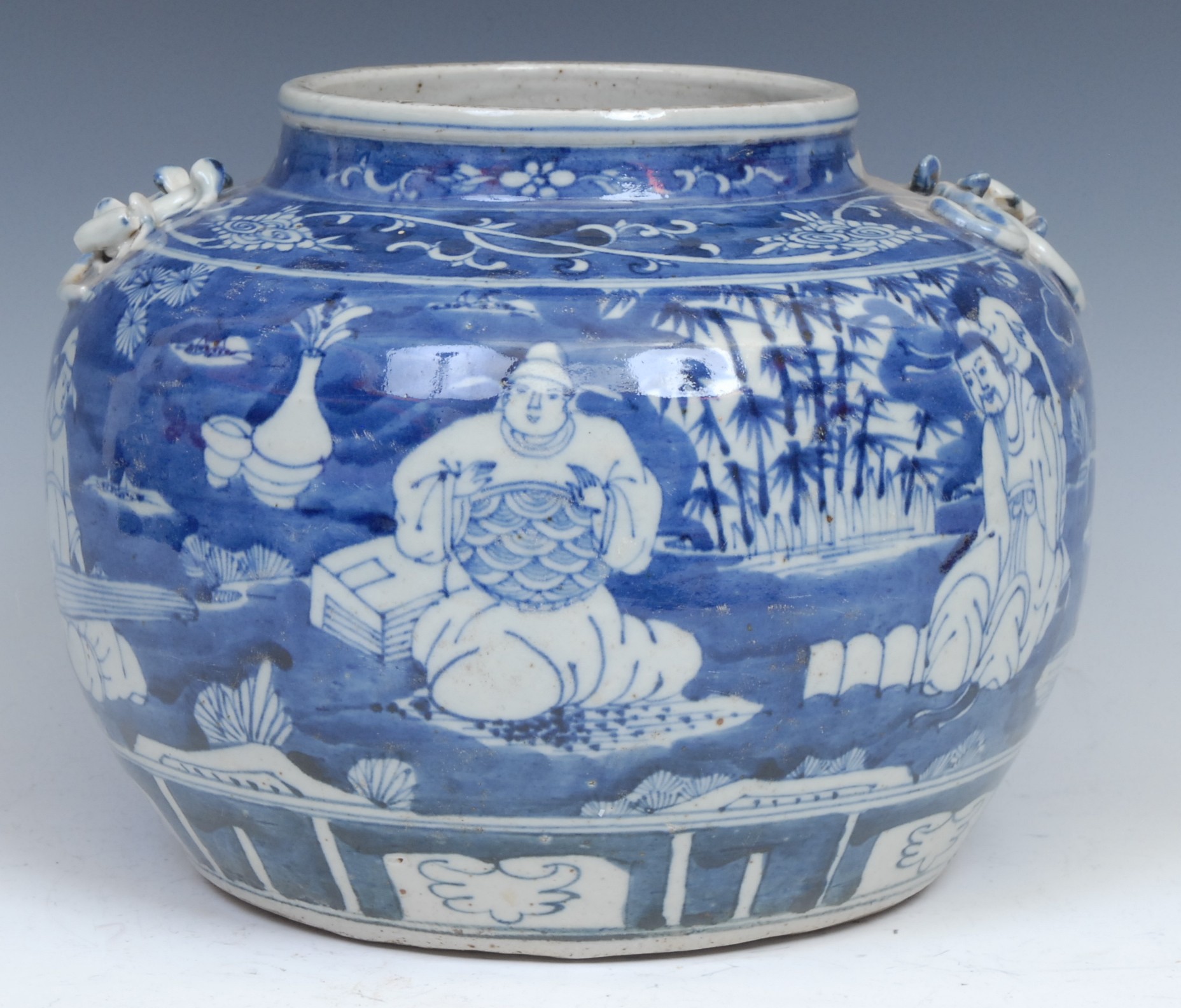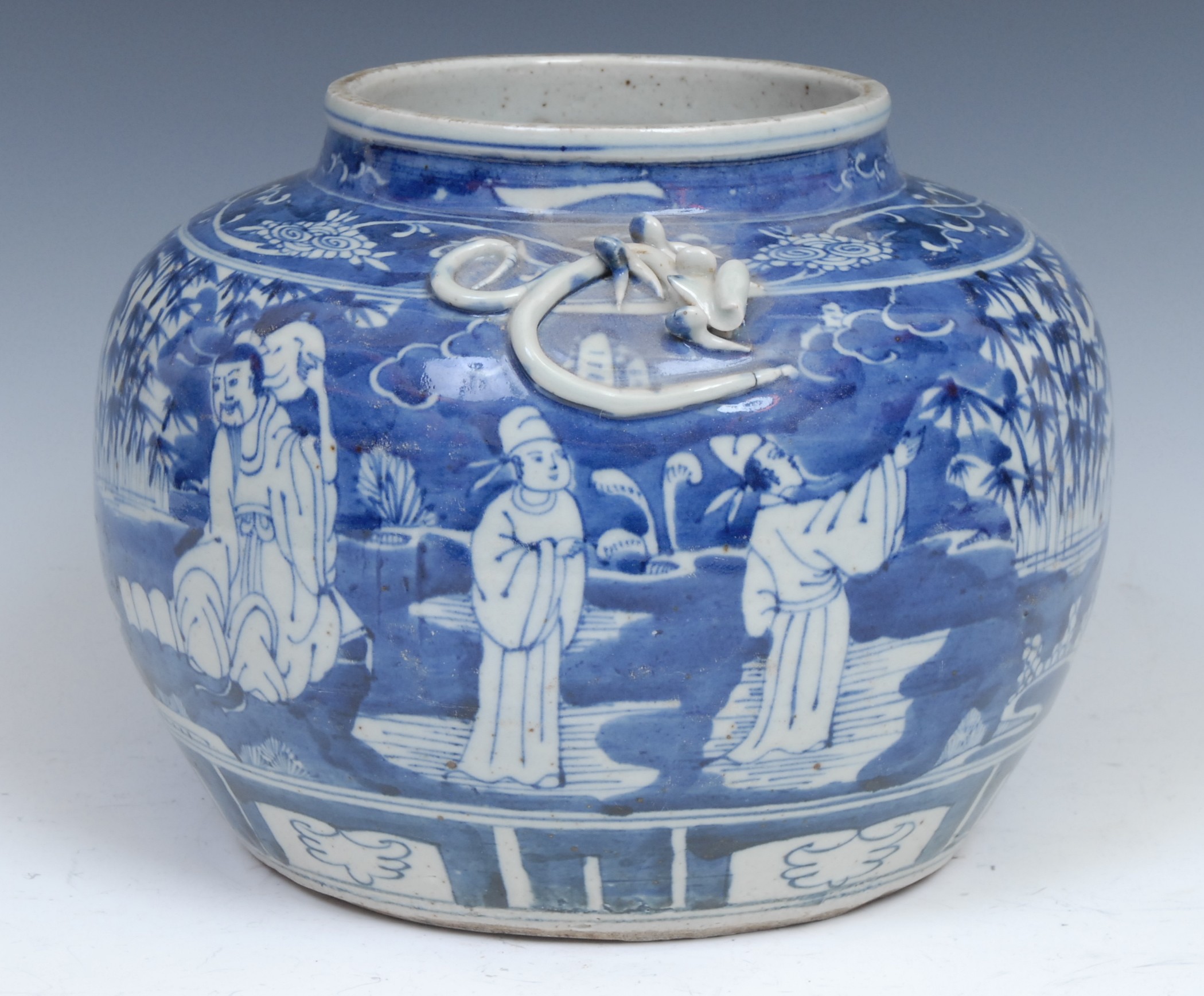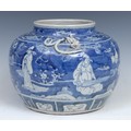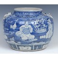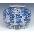 A Chinese ovoid wine jar, painted in tones of underglaze blue with figures in a landscape of bamboo, prunus and scrolls, 21cm high, 19th century