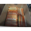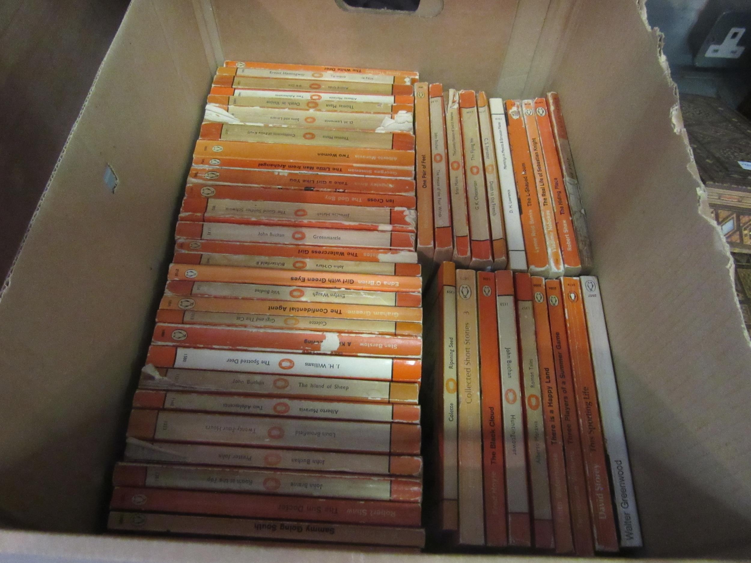 A box containing 45+ vintage Penguin paperbacks, all orange (fiction), circa 1950's and later, including D.H. Lawrence, Tennessee Williams, Alberto Moravia, Vladimir Nabokov, etc.