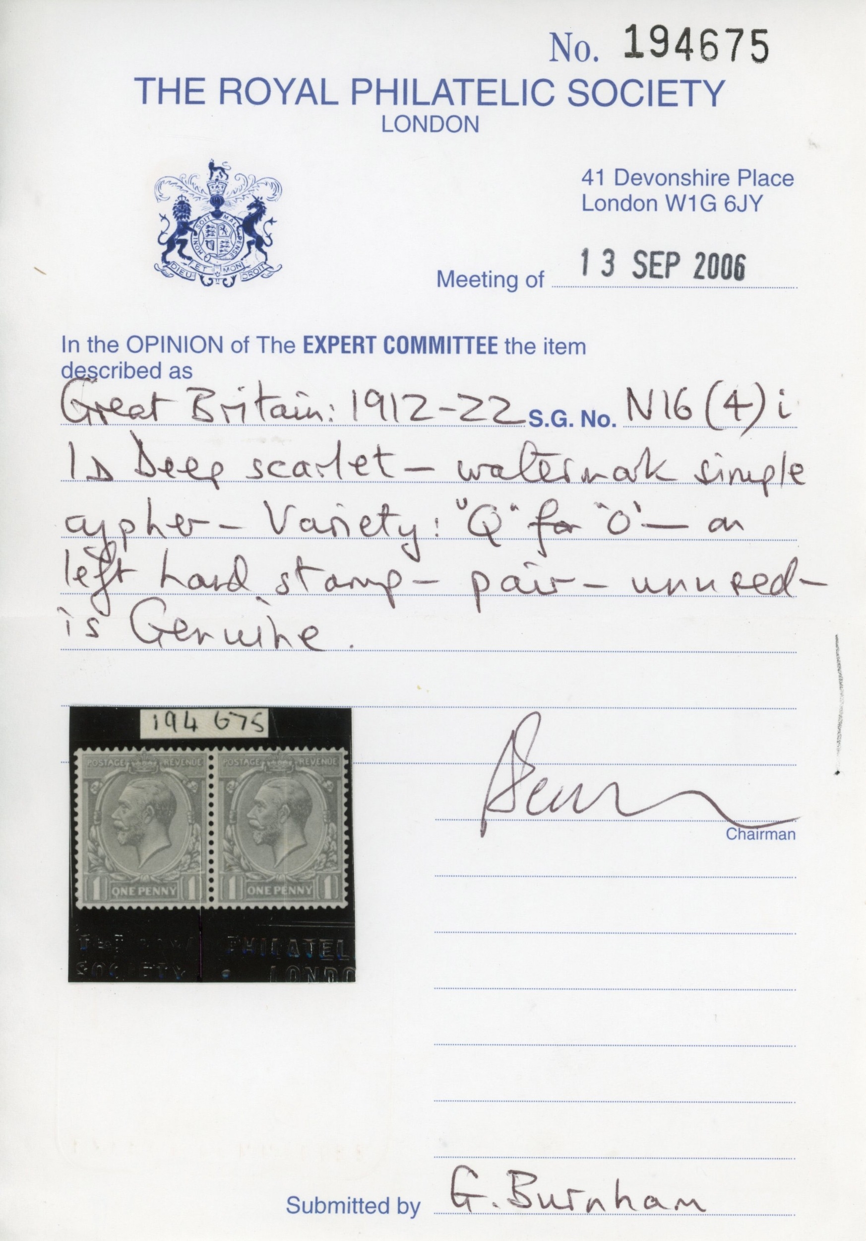 1912-24 Royal Cypher 1d deep scarlet, mint o.g., horizontal pair, left stamp with variety â??Qâ?? for â??Oâ?? (control T22, R 4/11). Attractive deep colour. RPS Certificate (2006). SG 357ab var, Spec