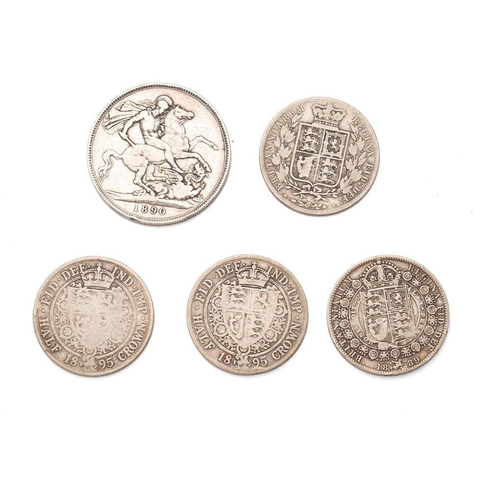 UK silver coinage to include Victorian Full Crown 1890, together with four Half Crowns, 1884, 1895, 1895 and 1889, (5), 82.7g.