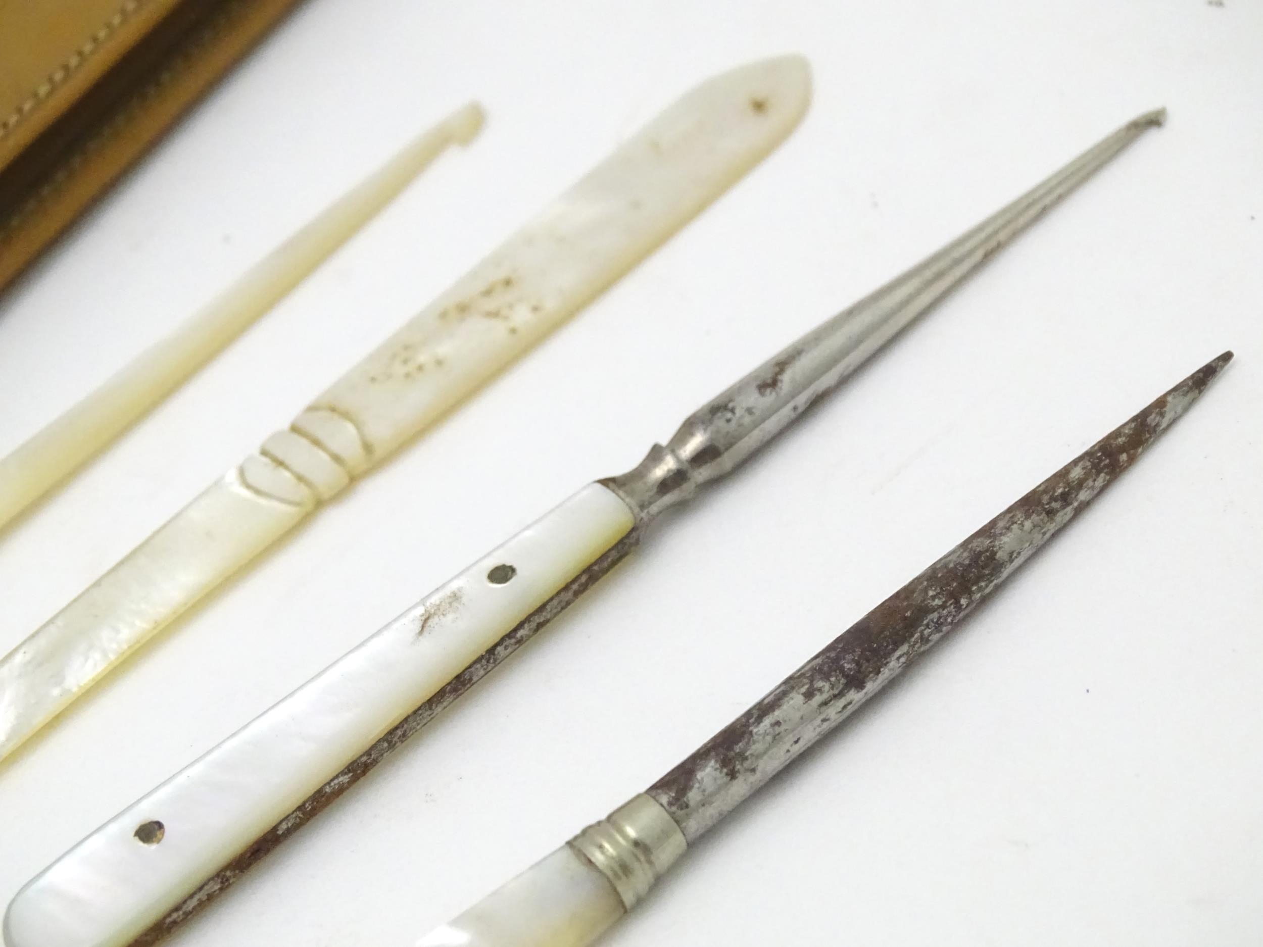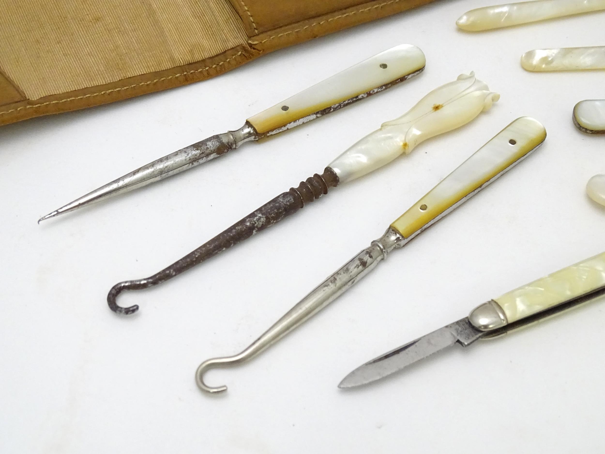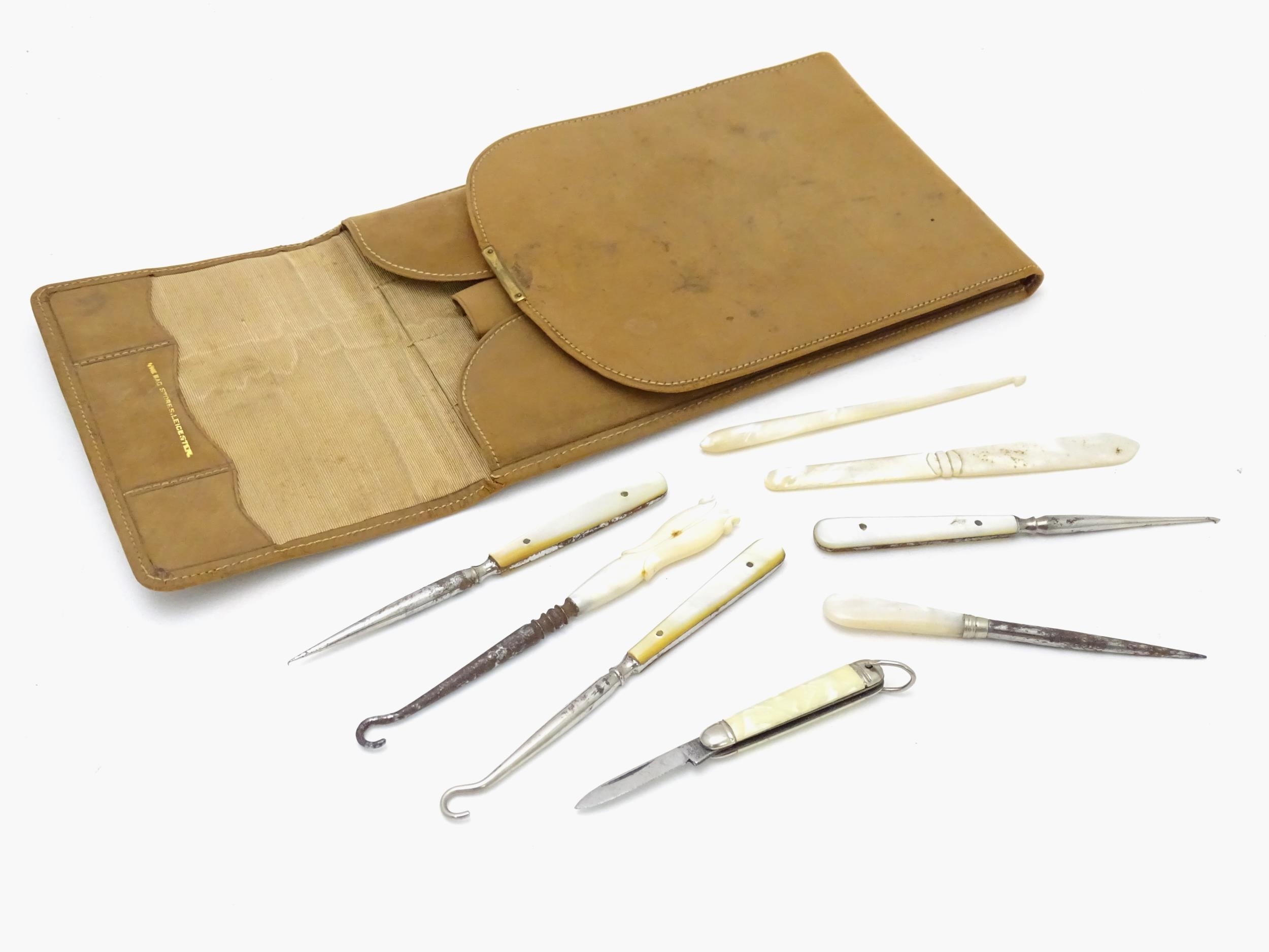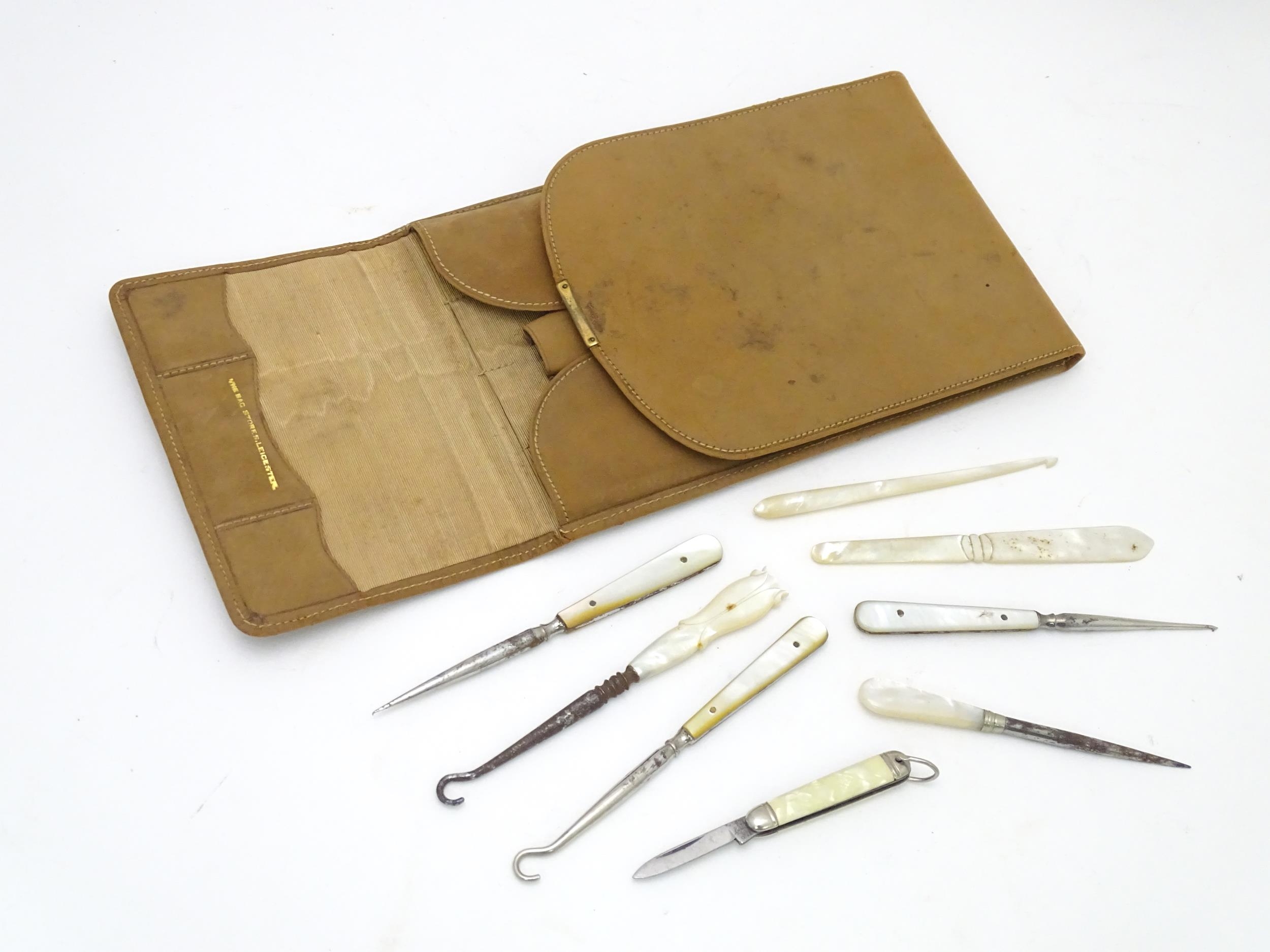 A quantity of early 20thC mother of pearl / mother of pearl handled tools to include button hooks, sewing awl, etc. Contained within a calfskin manicure tool case marked The Bag Stores, Leicester. Largest button hook approx. 4 1/2" long