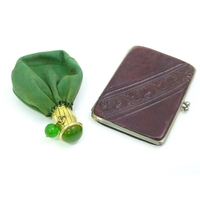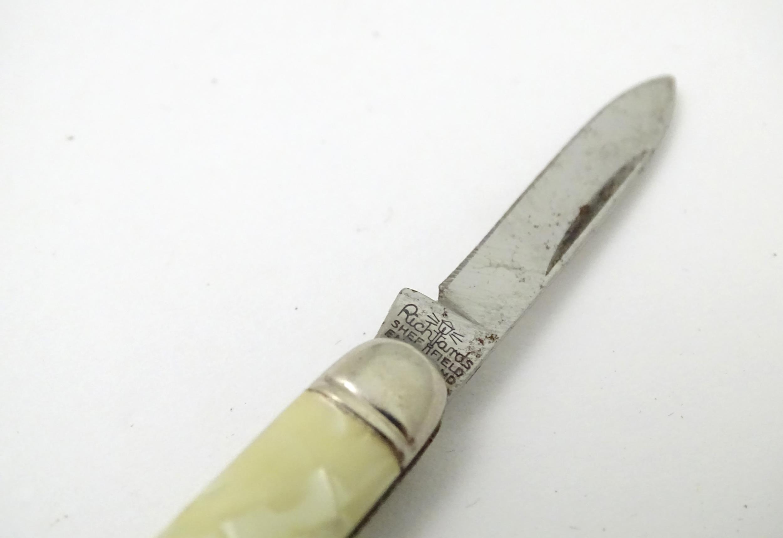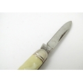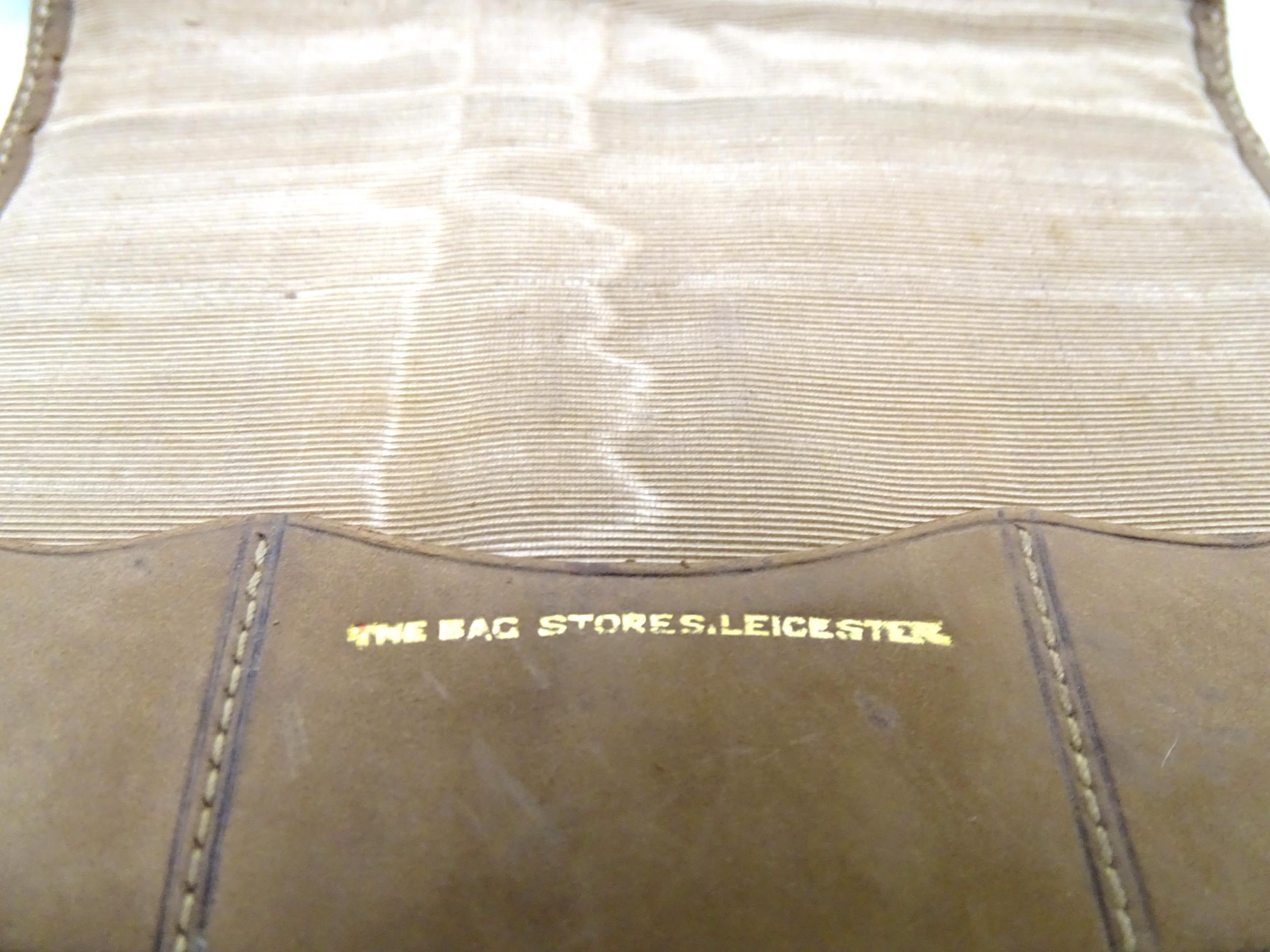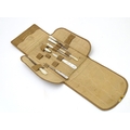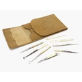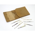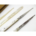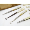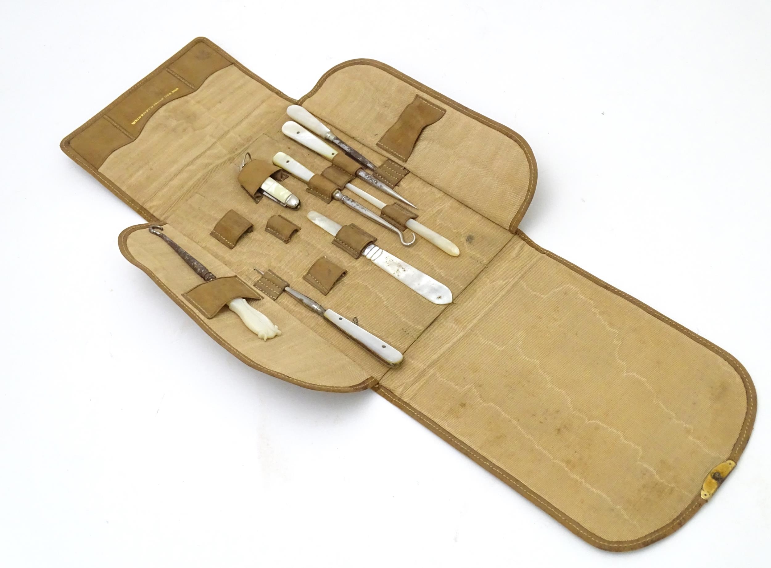 A quantity of early 20thC mother of pearl / mother of pearl handled tools to include button hooks, sewing awl, etc. Contained within a calfskin manicure tool case marked The Bag Stores, Leicester. Largest button hook approx. 4 1/2" long