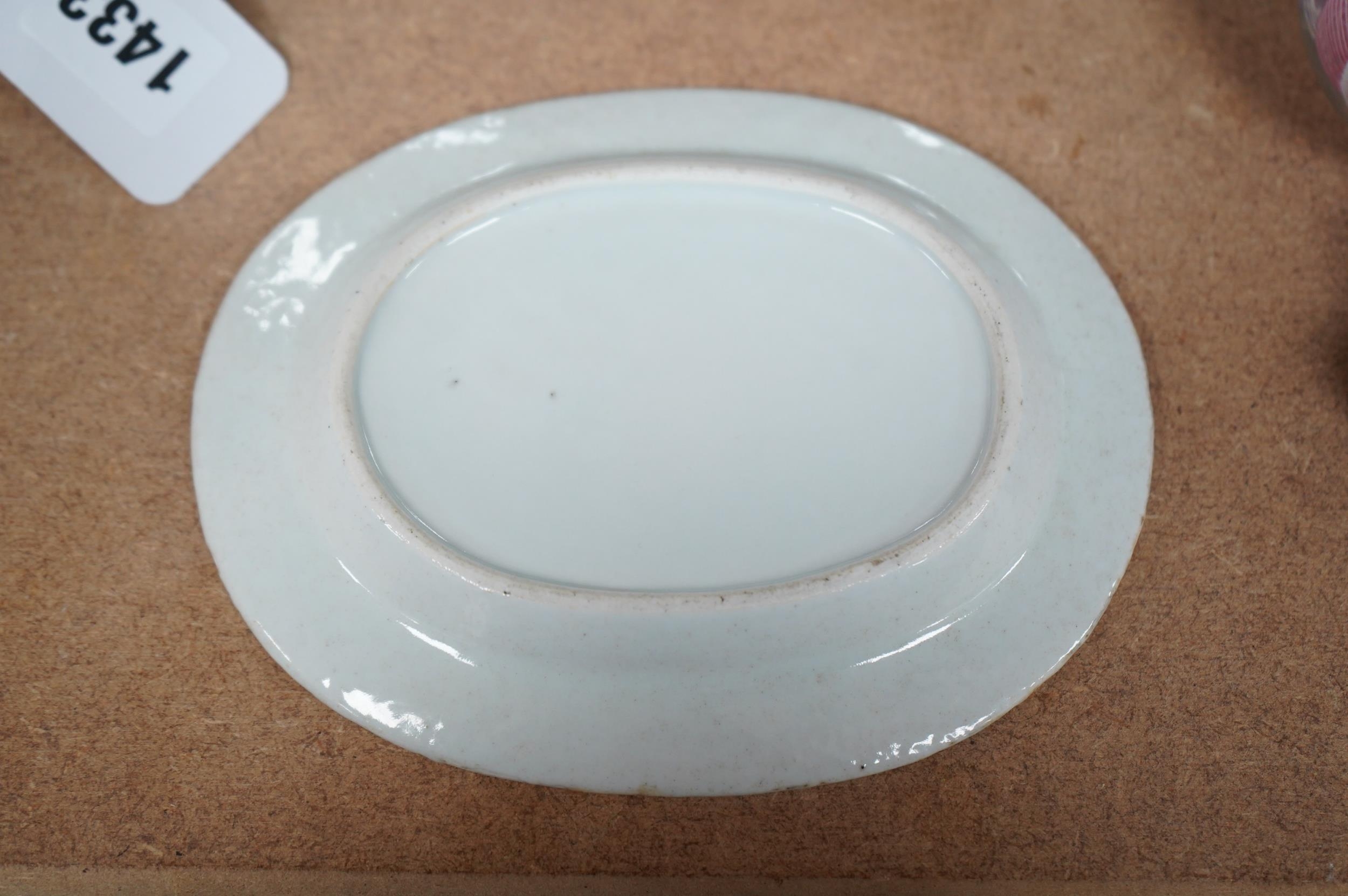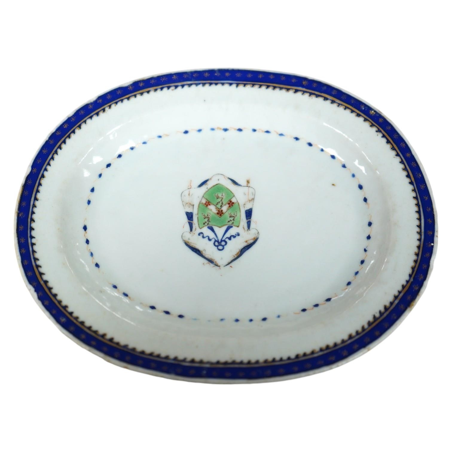 A small 18th century Chinese armorial porcelain oval dish, 16cm. Condition - fair