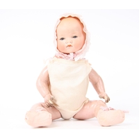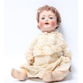 A Simon & Halbig bisque head and composition bent limb body doll, sleeping blue glass eyes, painted features, open red lips revealing two small upper teeth and tongue, brown wig, impressed marks 'Simon Halbig Germany 126 46' 49cm tall