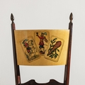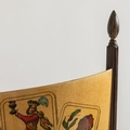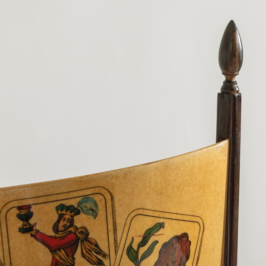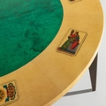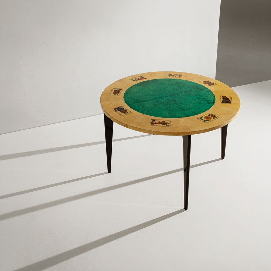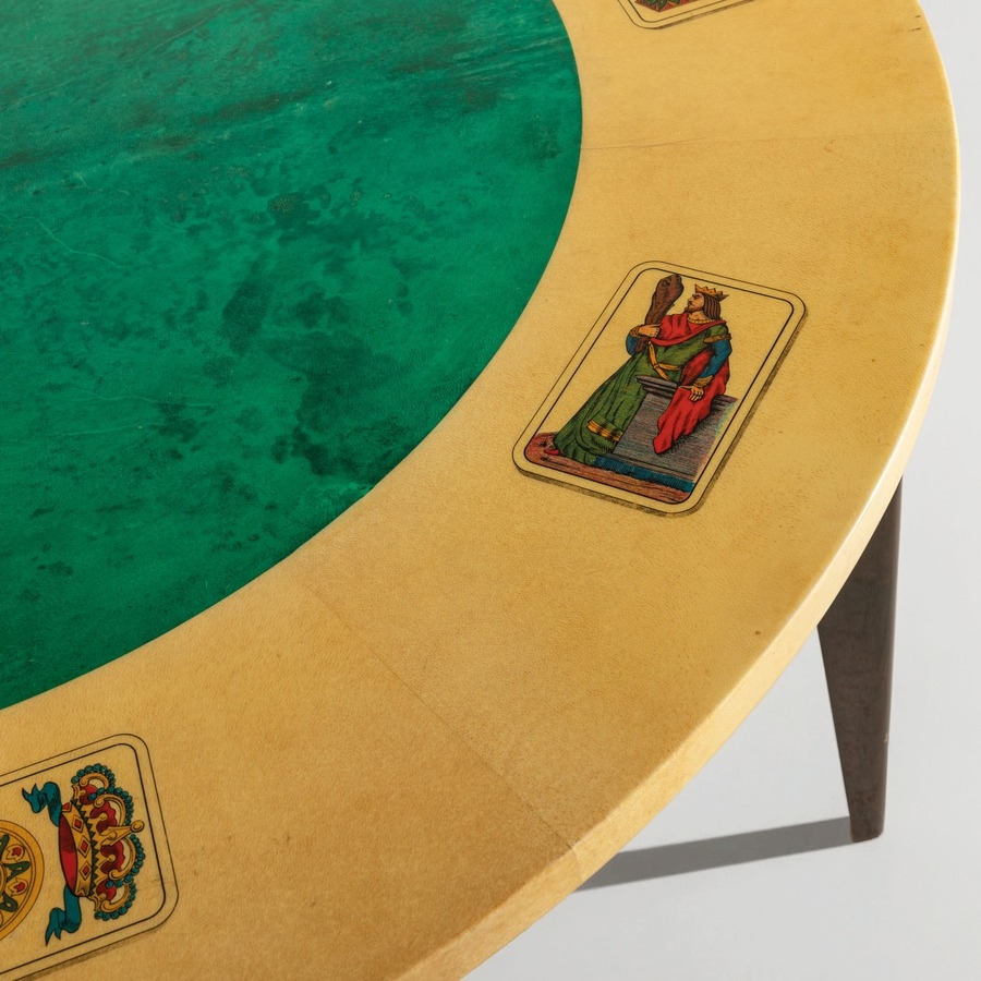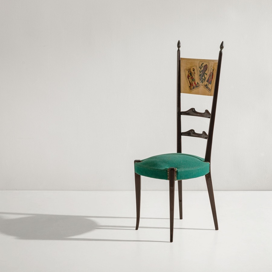 Quattro sedie e un tavolo. Legno rivestito in pergamena, tessuto imbottito. Produzione Tura anni '50.