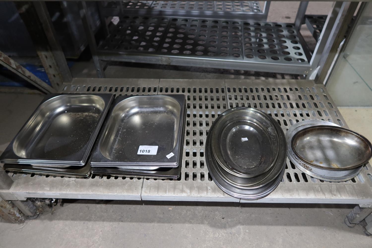 A quantity of shallow stainless steel gastronorm trays and oval serving trays
