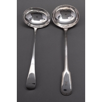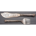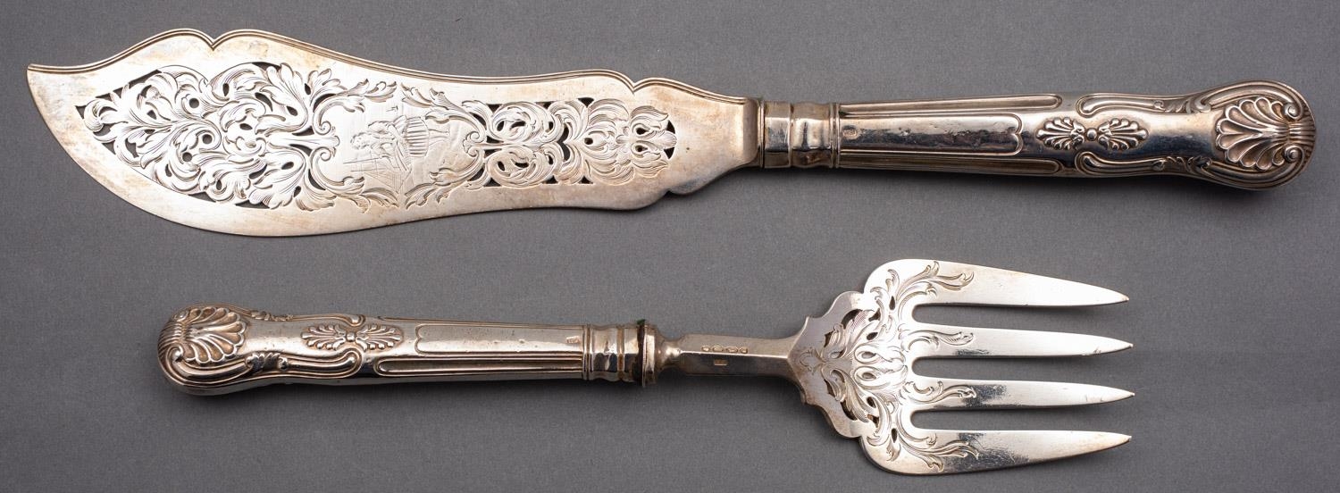 A pair of Victorian silver fish servers by Francis Higgins II, London 1854, Kings pattern handles, pierced and engraved blades with a scene of a fishing boat and a woman holding a basket of fish, knife 33cm. (12.9ins.), 314.gms., (10.1ozs.)