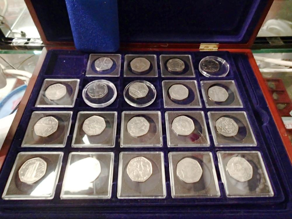 Coin display case with nineteen 50p pieces including Benjamin Bunny. UK P&P Group 2 (£20+VAT for the first lot and £4+VAT for subsequent lots)