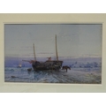 George Wolfe (1834-1890) BEACHED PENZANCE TRAWLER WITH FIGURES, HORSES AND CART Signed watercolour, 29 x 47.5cm.