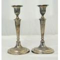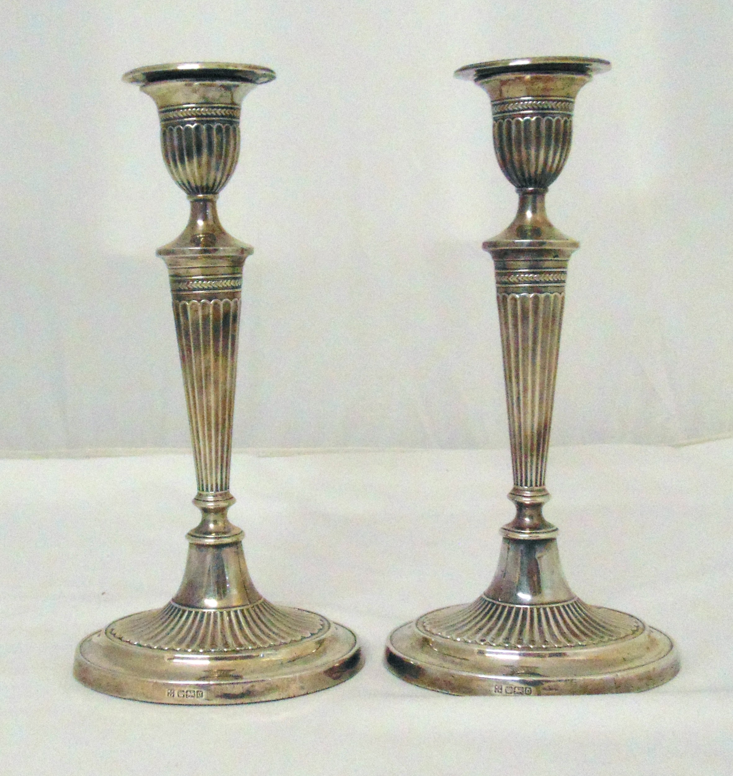 A pair of Edwardian hallmarked silver candlesticks of oval neoclassical Adam design with tapered reeded stem and gadrooned weighted base, Fordham & Faulkner Sheffield 1906, 30cm (h)