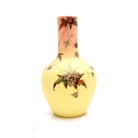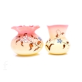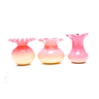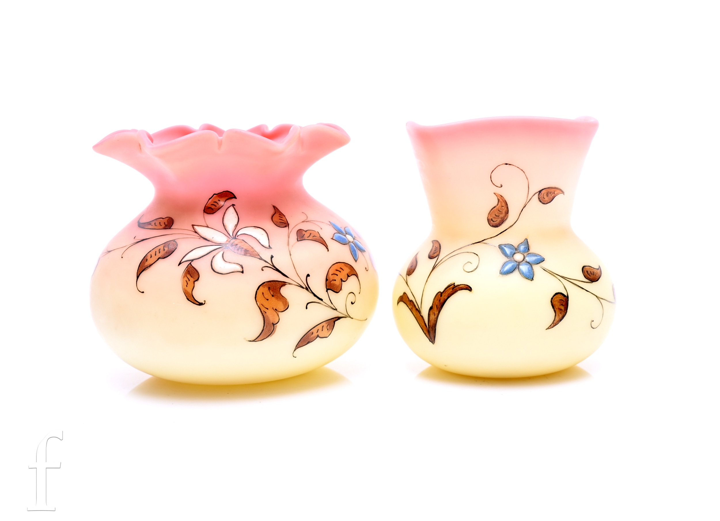 A late 19th Century Thomas Webb & Sons Queen's Burmese posy vase of compressed globe form with wave rim, decorated with a stylised flowering bough, height 7.5cm, together with a similarly decorated posy vase, of squat globe form with raised square collar, both unmarked, height 7cm. (2)