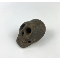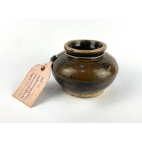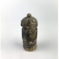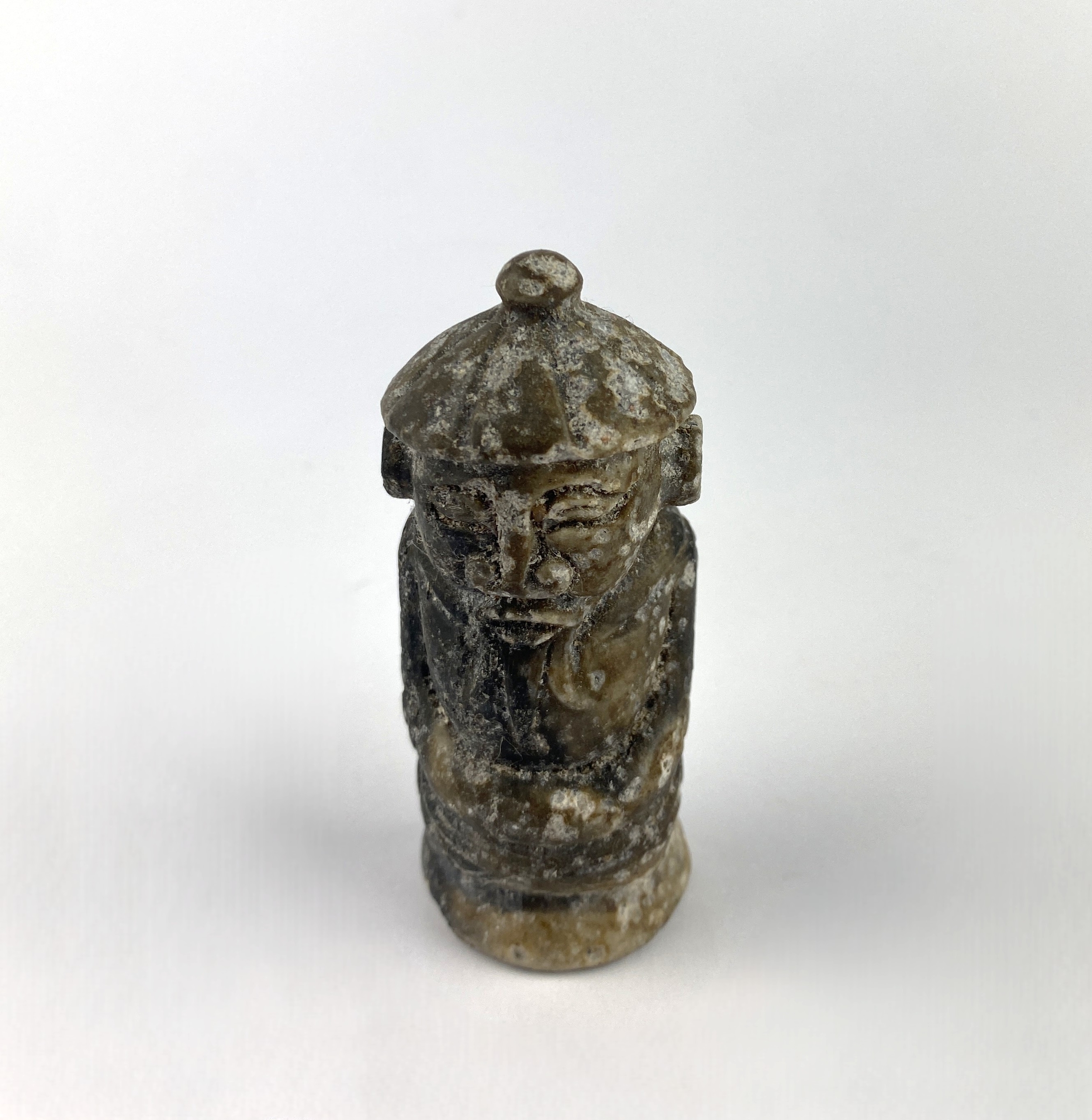 A Chinese carved stone figure depicting a peasant worker wearing a douli, believed to be Han Dynasty (206BC - 220AD), when viewed up close lots of fine details are visible through the ageing, wear and patination, 8.5cm high.