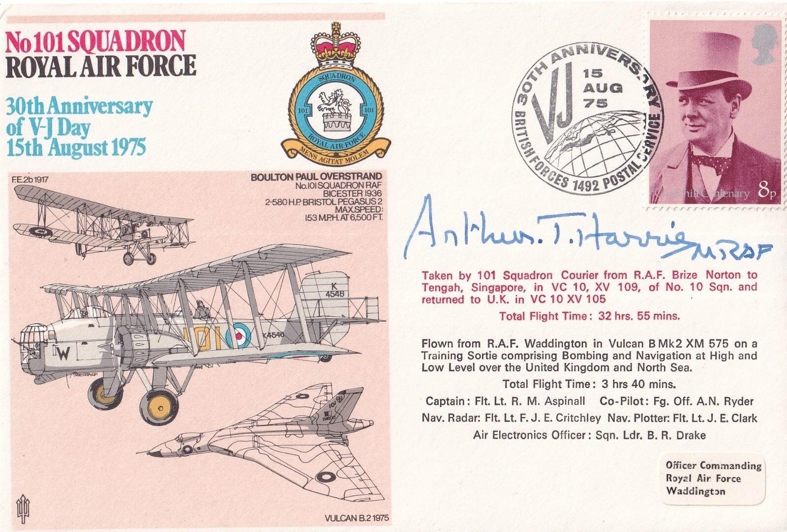 RAF35c 30th Anniversary of VJ Day signed MRAF Arthur ( Bomber ) Harris. 15 Aug 75 BFPS 1492 30th Anniversary of VJ Day Special Postmark No 101 Squadron Royal Air Force. 30th Anniversary of VJ Day Flown from RAF Waddington in Vulcan B Mk2 XM575 on a Training Sortie. Personally Signed Marshall of the RAF Sir Arthur Bomber Harris WW1 Pilot. Harris led RAF Bomber Command in World War Two, earning him the nickname 'Bomber Harris'. His implementation of the policy of 'saturation' or 'area' bombing of German cities has made him a hugely controversial figure. Leaving England at the age of 16, he travelled to Rhodesia where he worked on a farm becoming the manager by the age of 21. Having fought in South-West Africa, he returned to Britain and joined the RFC, gaining his RAeC Certificate (No 2015) on 6 November 1915. In March 1916, one of his flight, Lt W Leefe-Robinson, brought down the first Zeppelin over England for which he was awarded a VC. With No 45 Sqn he gained his five victories, thereby raising him to 'ace' status. It was in India that he saw the deplorable state of the RAF in the area and at one point even threatened to resign his commission over the situation. He has often been 'credited' with start 'area bombing', but this decision was made before he took over Bomber Command. However, having been given the task, he carried it out with vigour. He also attempted increase the profile of the command and within months of taking over command had managed to mount three '1000 Bomber' raids against Cologne, Essen and Bremen. After the war, shunned by the British authorities, he returned to South Africa and became Managing Director of the South African Marine Corporation (Safmarine). He was eventually honoured when Churchill returned to Downing Street in 1953, but at his own request was awarded a baronet rather than a peerage. He died on 5 April 1984. Certified Copy No 1174 of 1250. Good condition. All autographs come with a Certificate of Authenticity. We combine postage on multiple winning lots and can ship worldwide. UK postage from £5.99, EU from £7.99, Rest of World from £9.99