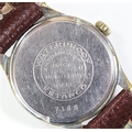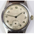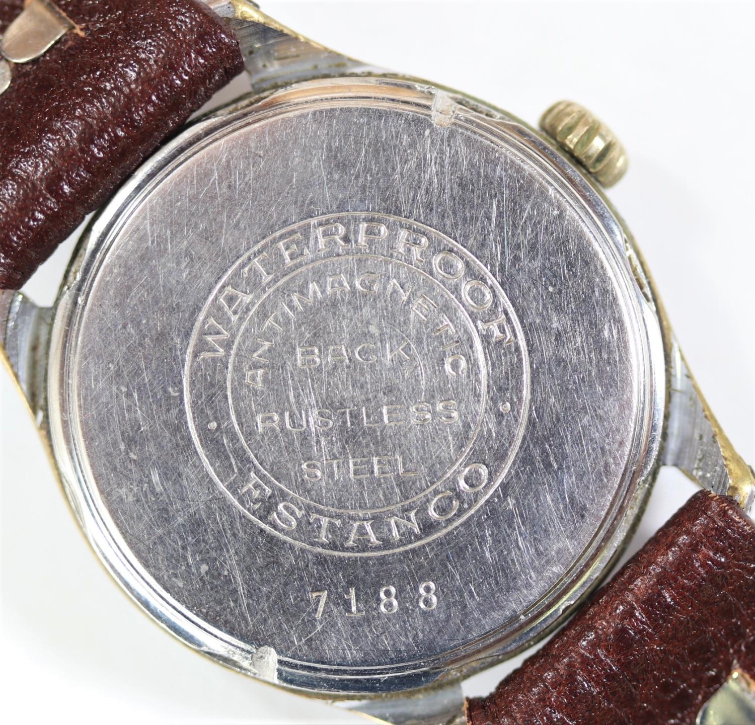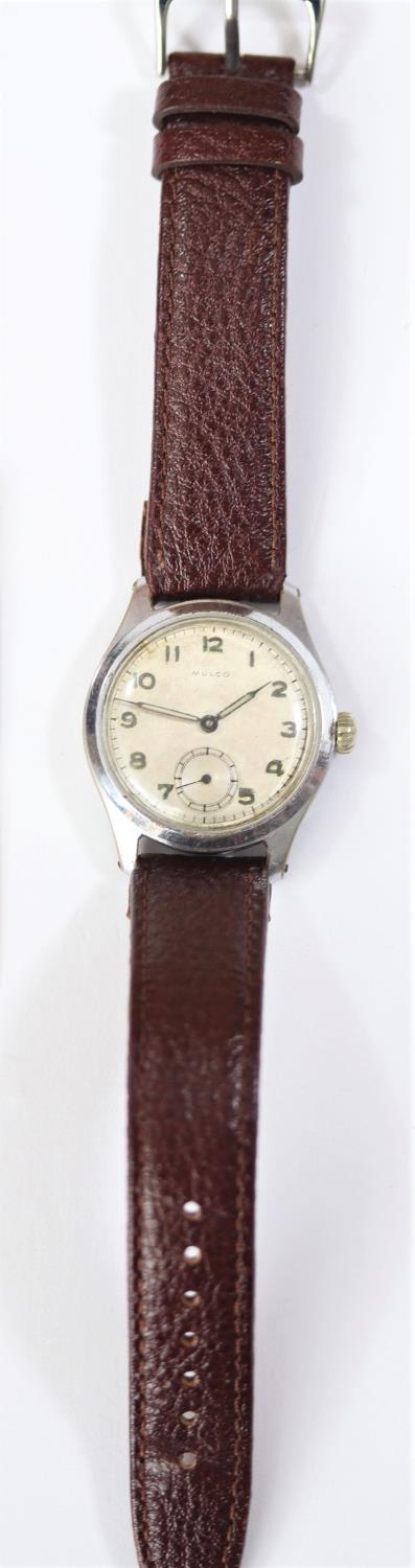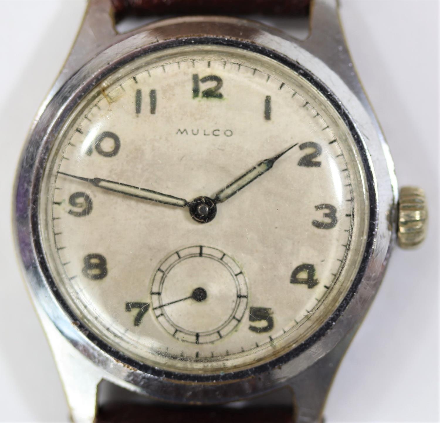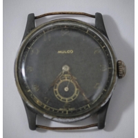 Mulco wristwatch. Plated case, brushed finish, wear to plating, 32mm without crown. Screw caseback, marked F.Stanco, Waterproof, with antimagnetic back, rustless steel in centre. Inner caseback marked Swiss made, model depose. Has been notched to accept non-original case tool. Silvered dial has some staining, luminous material on hands and dial appears original. Unsigned AS1130 movement, marked Swiss, 15 jewels, running condition. Movement retaining ring present. QCG
