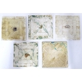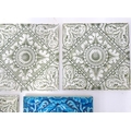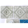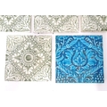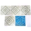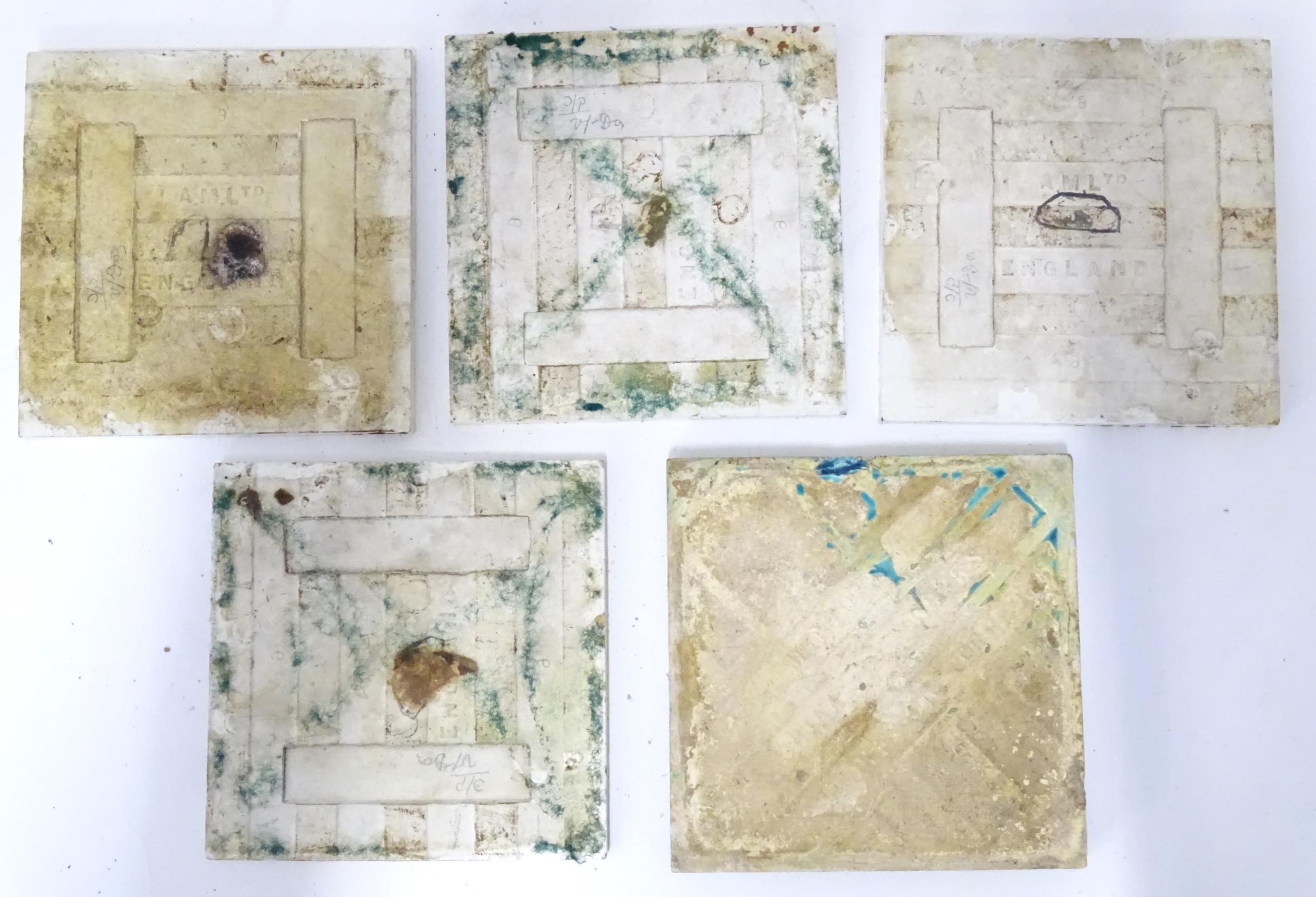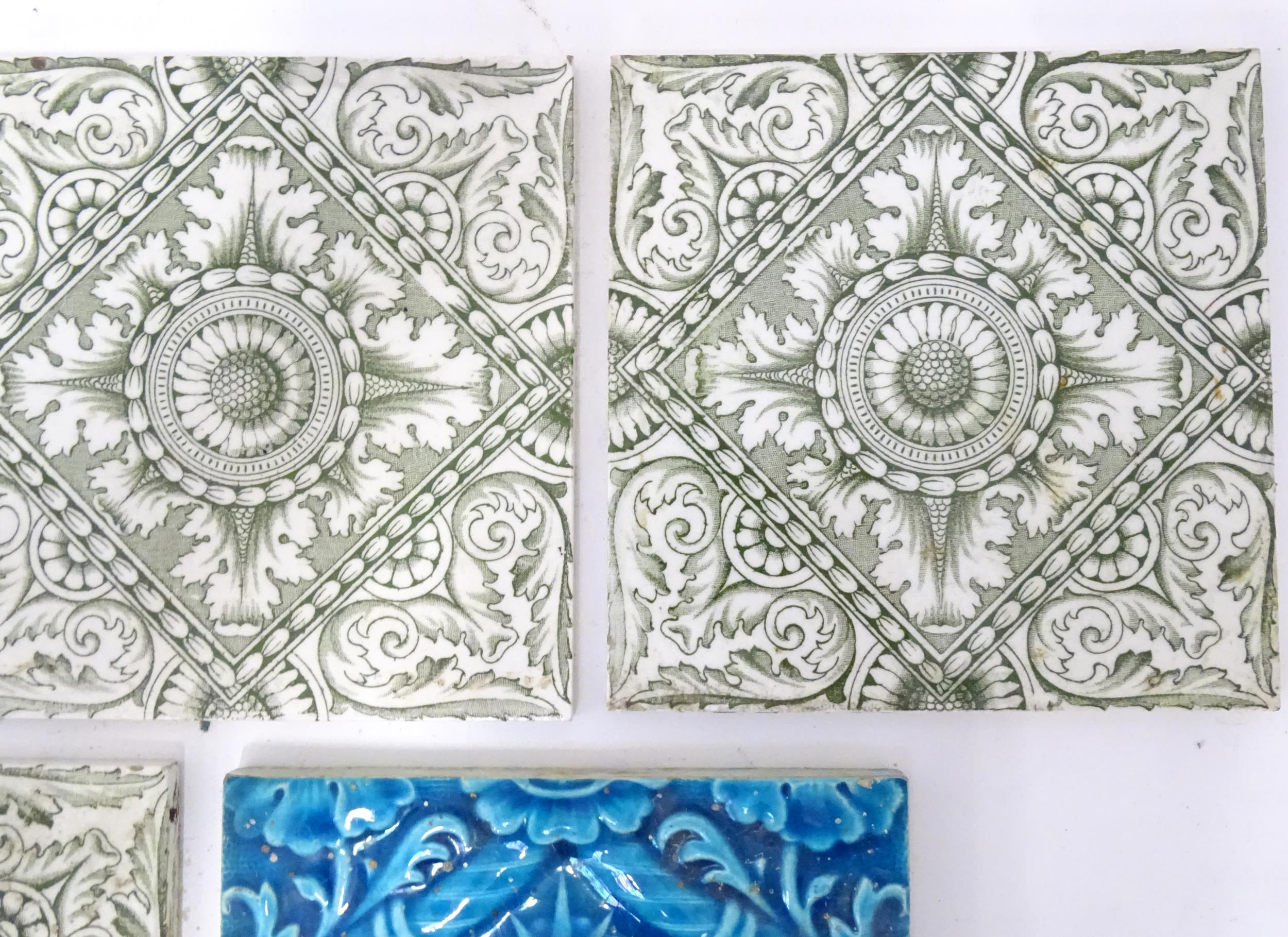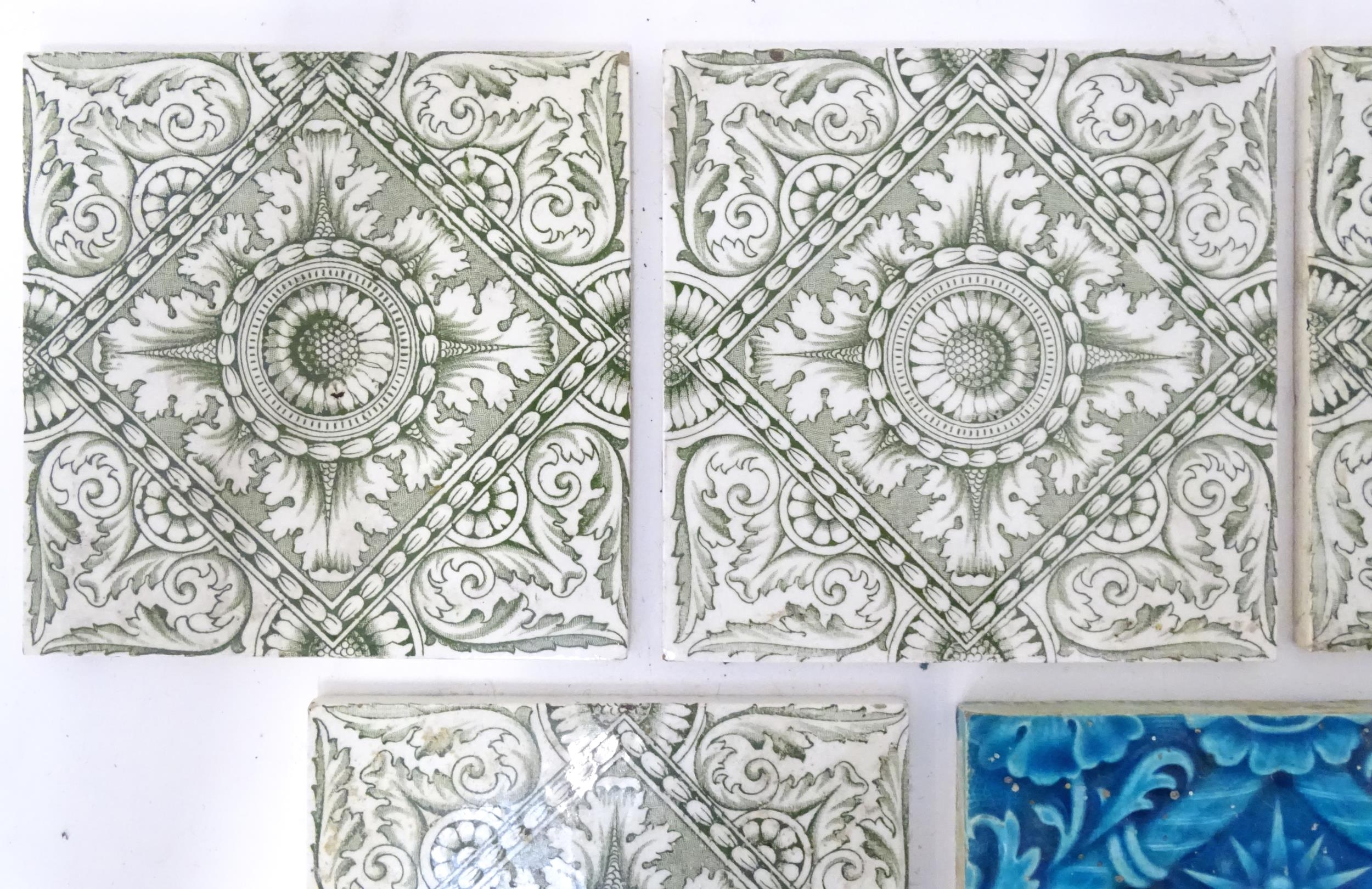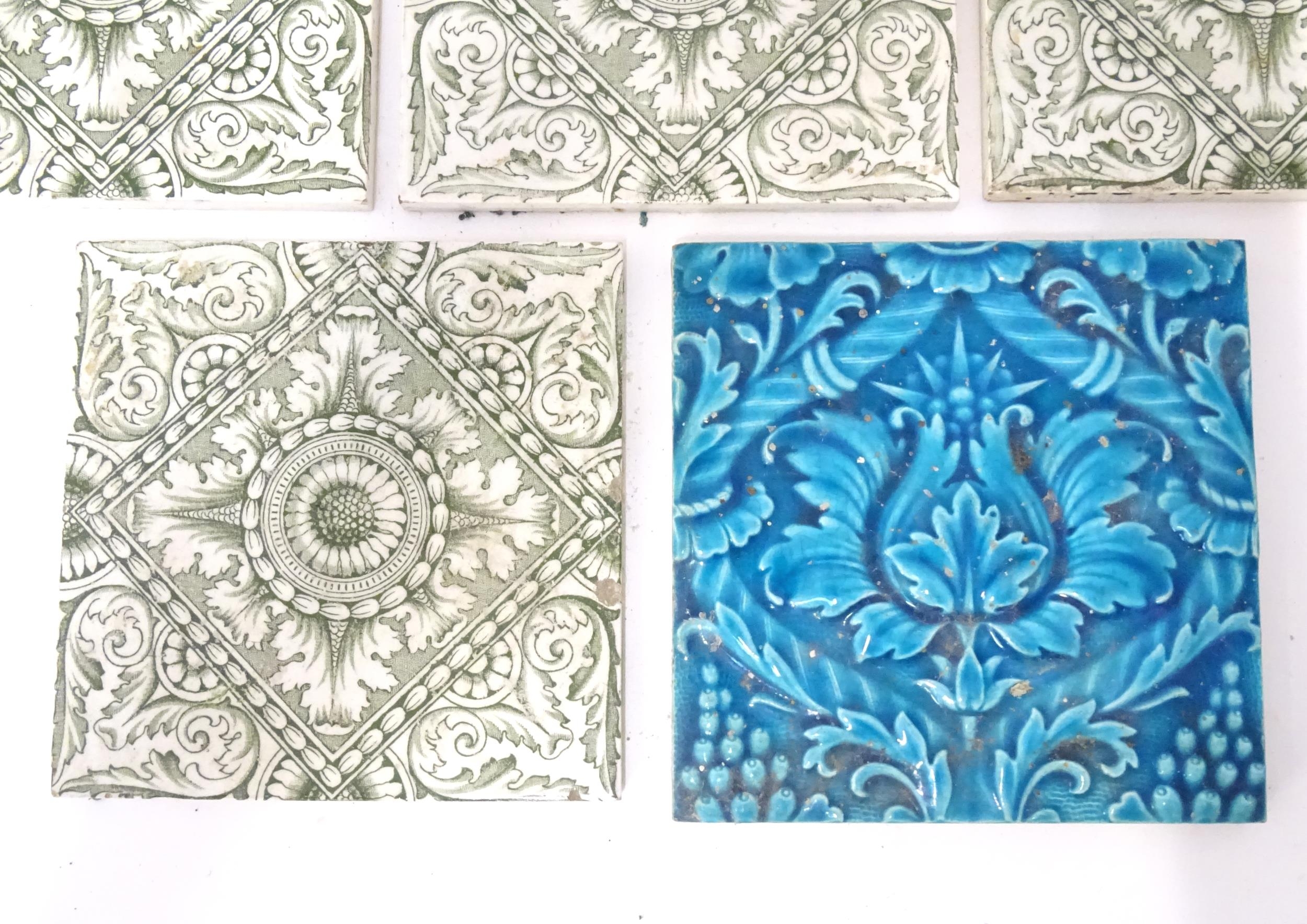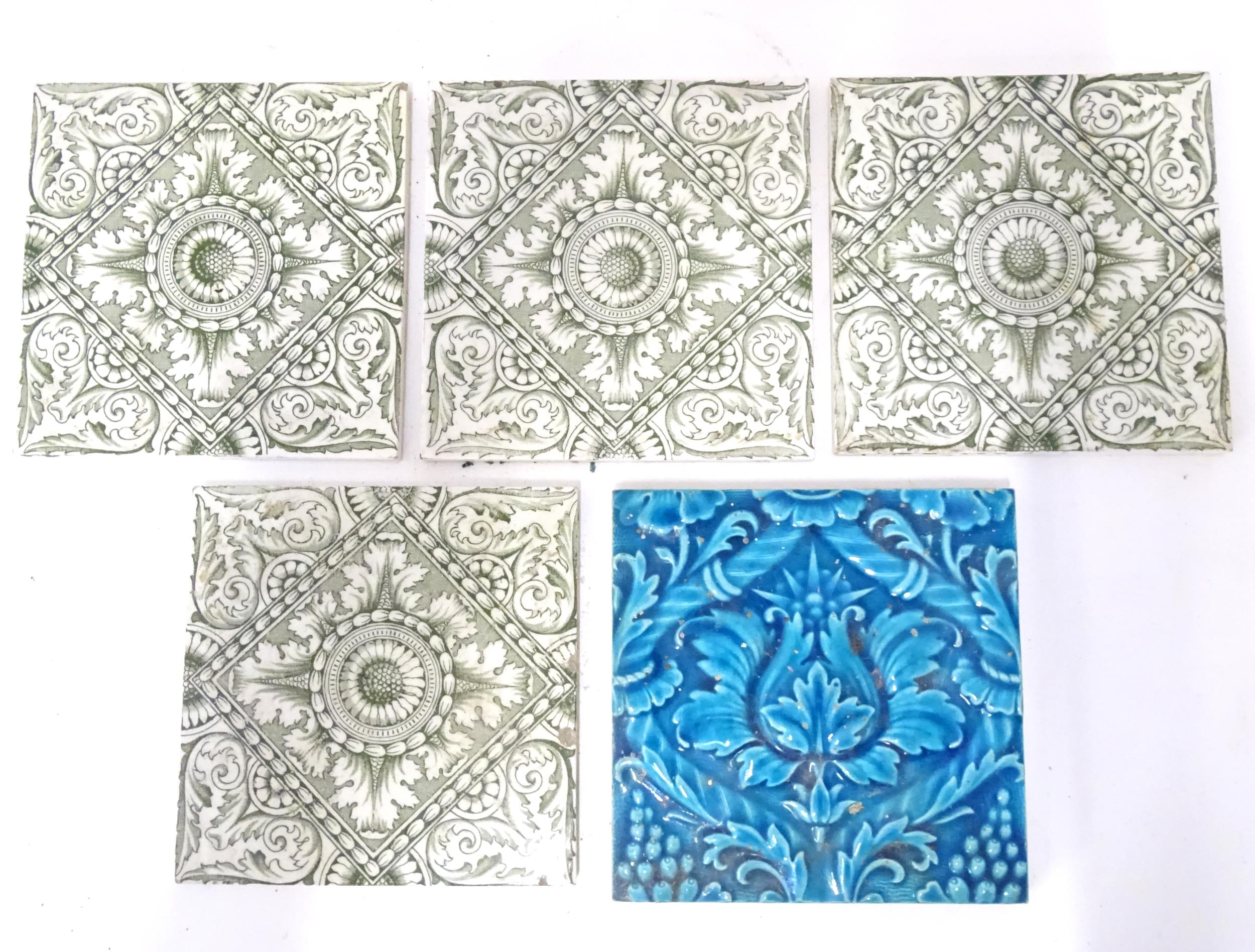 Four late 19th / early 20thC tiles decorated with acanthus scroll detail. Marked A.M. Ltd. Together with a Minton tile with blue glaze and foliate detail. Approx. 6" x 6" (5)