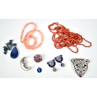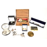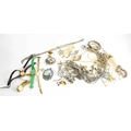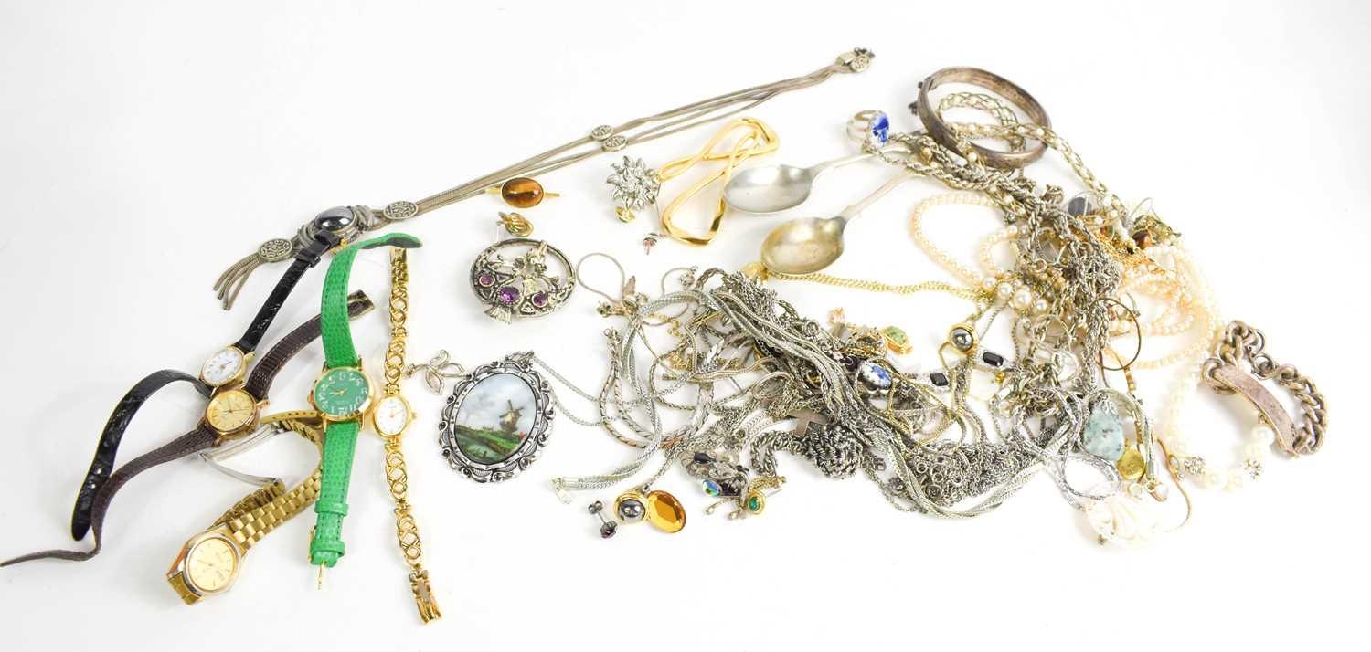 A selection of silver and other jewellery, to include identity bracelet, bangle, marcasite set earrings, Delft pottery set ring, a silver necklace with niello work ovals and hematite cabochon pendant, five wristwatches, and various other examples.
