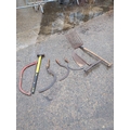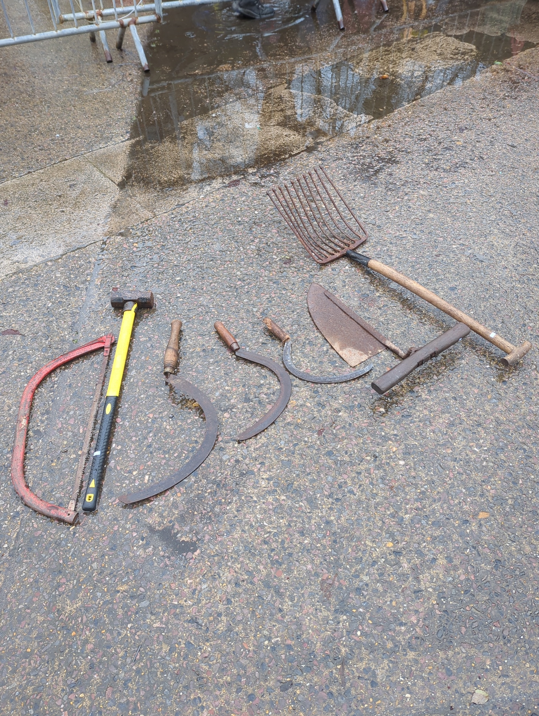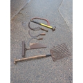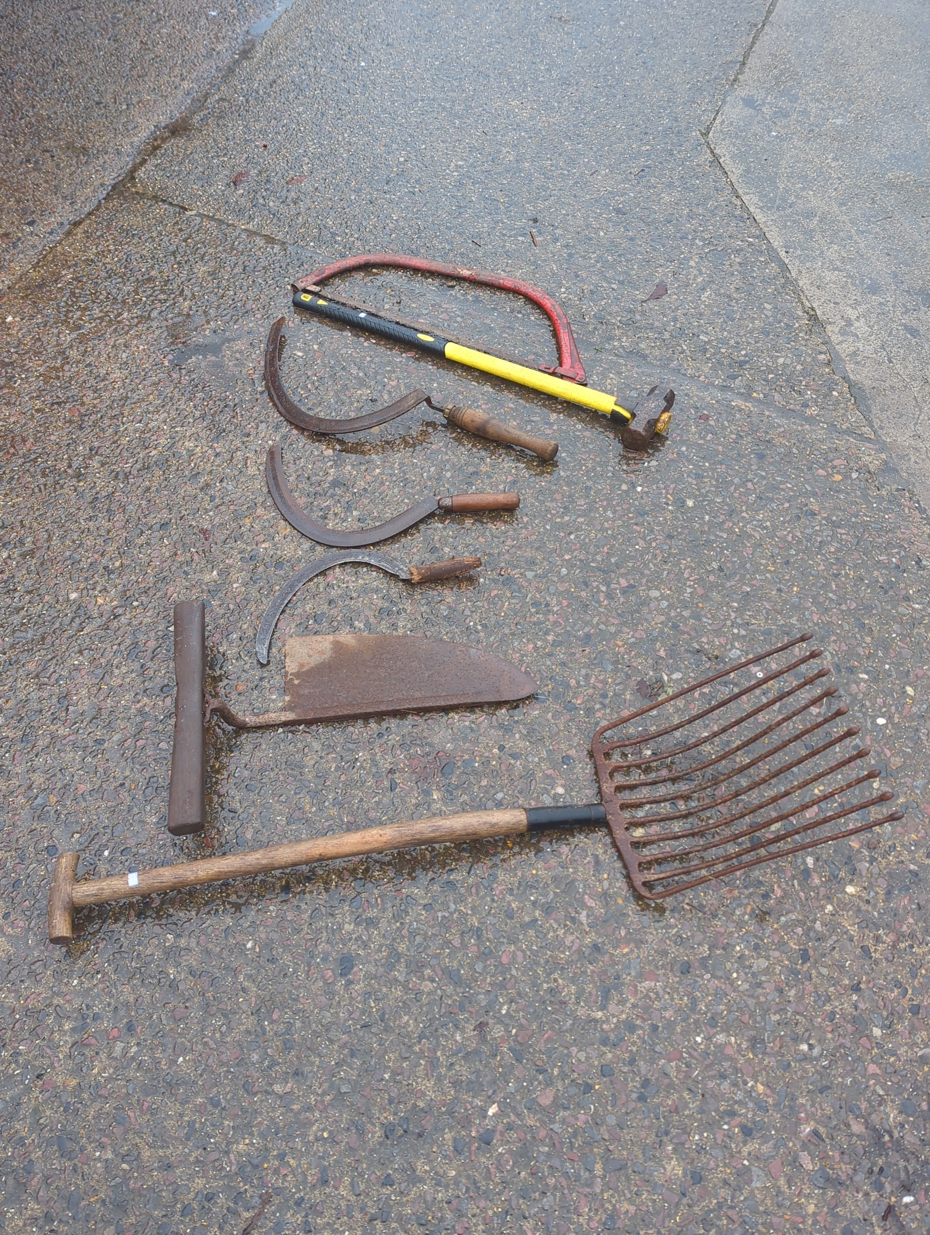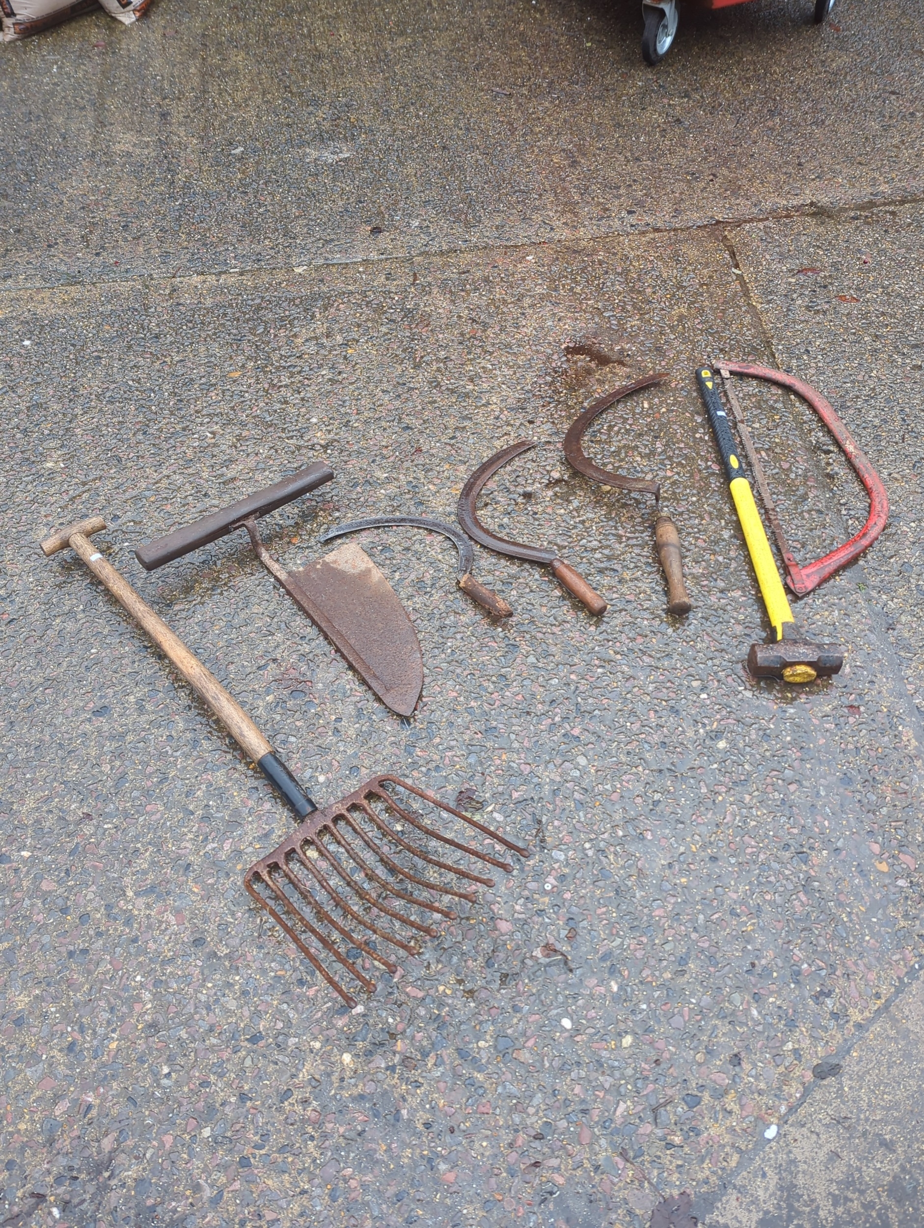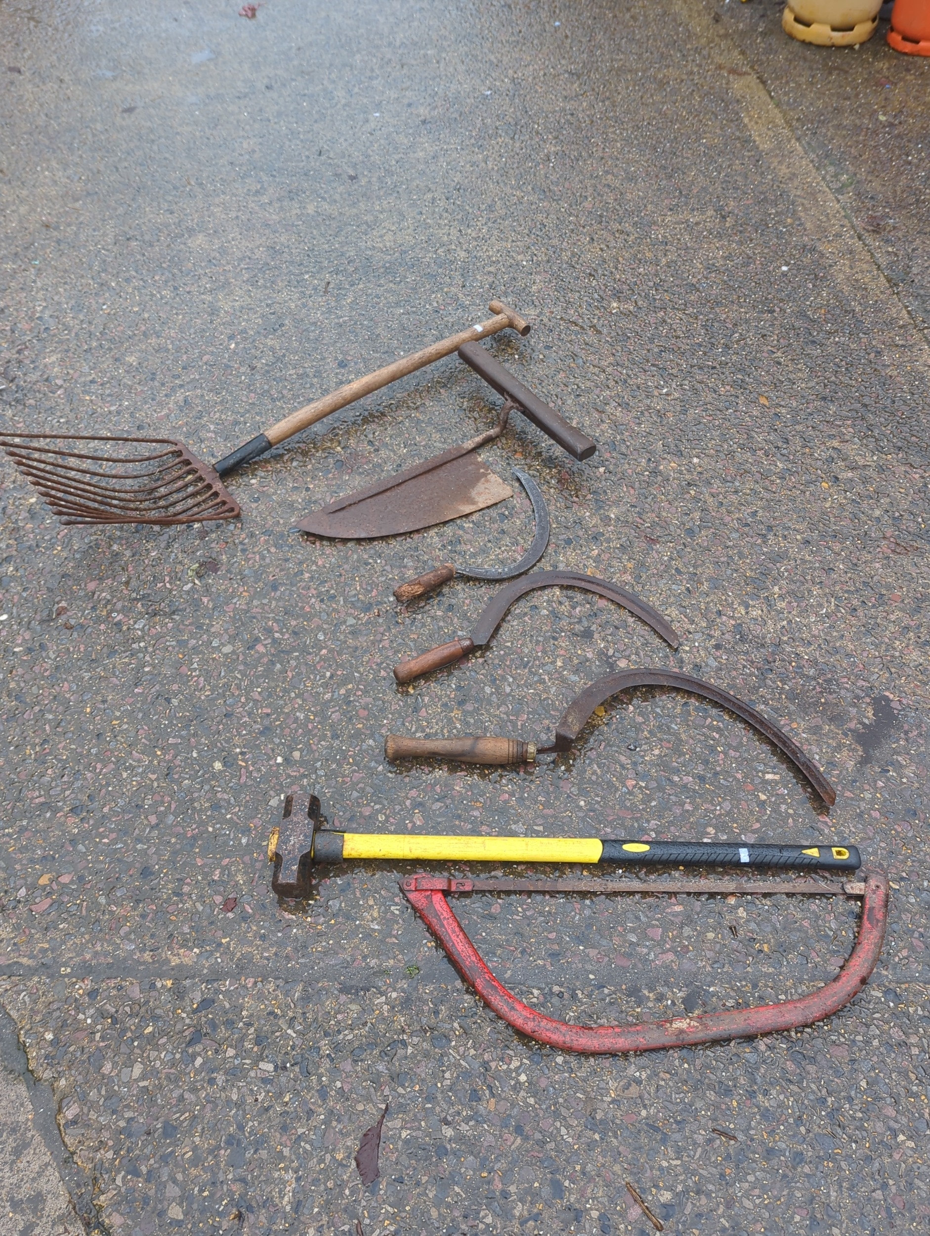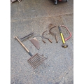 This selection includes a variety of garden tools, notably featuring a rake and a sickle, suitable for various outdoor tasks. The tools include wooden handles for a classic grip and metal components showing aged patina. Ideal for gardening enthusiasts or as rustic decor items, these tools provide both functionality and vintage charm.