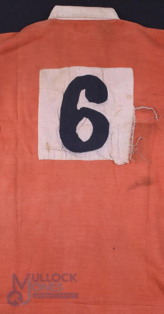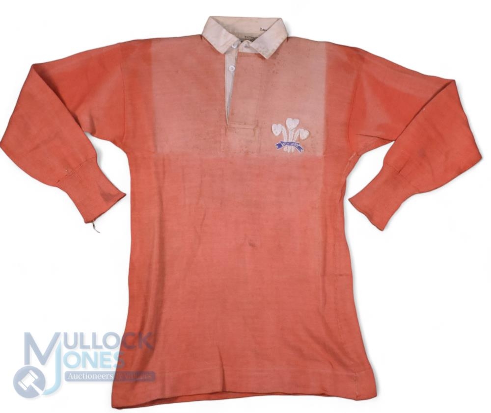 1930s Wales Matchworn International Rugby Jersey: A splendid Welsh international jersey of Harry Bowcott, Cambridge, Cardiff, London Welsh, Wales and the 1930 British Lions. Eight times capped 1929-1933, including captaining his country and also winning for the first time at Twickenham, the versatile back also played in five Lions tests, and became a noted administrator, selector and President of the WRU. Bowcott's name tag is sewn to collar and twice written on it too, it is in good condition with rectangular fading to the front, St Margaret's make, three feathers badge and black 6 (for fly-half) on rear white patch. Not to be missed