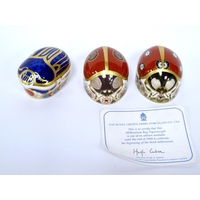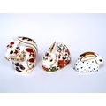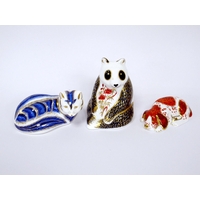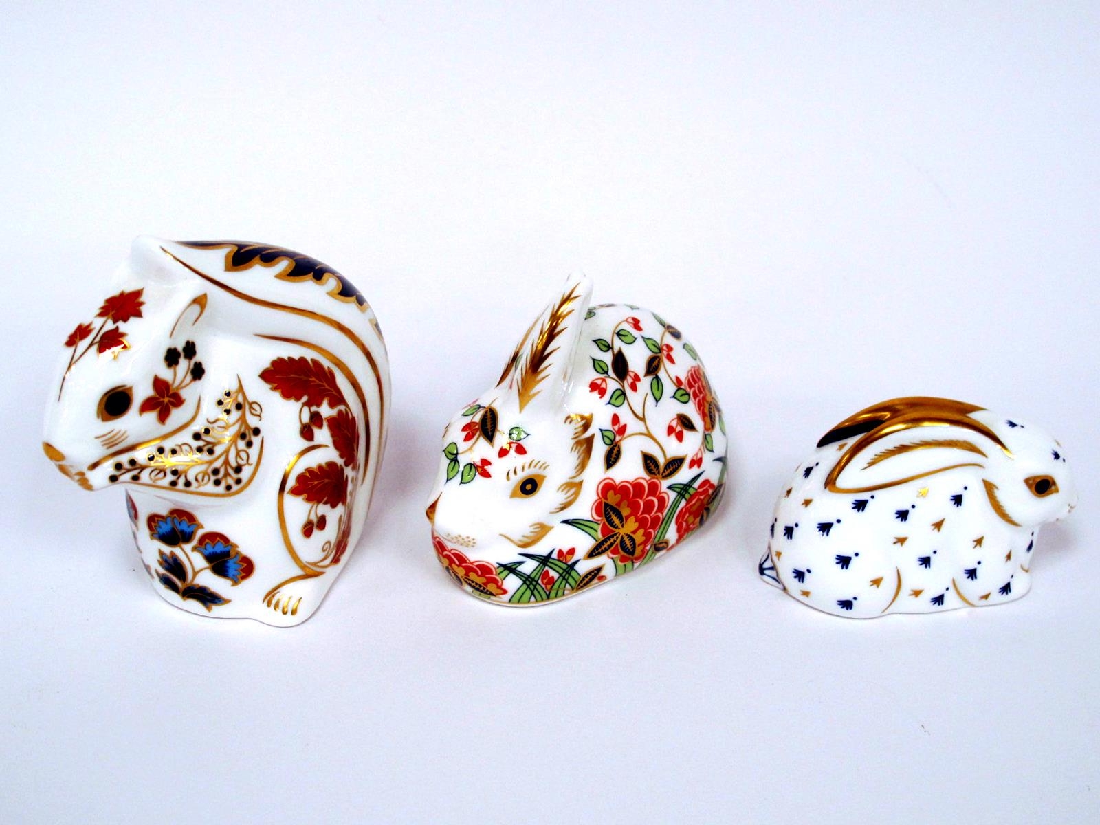 Three Royal Crown Derby Porcelain Paperweights; 'Squirrel', 'Meadow Rabbit' and 'Rabbit', all gold stoppers, 3.5 - 9cm high. (3)