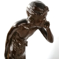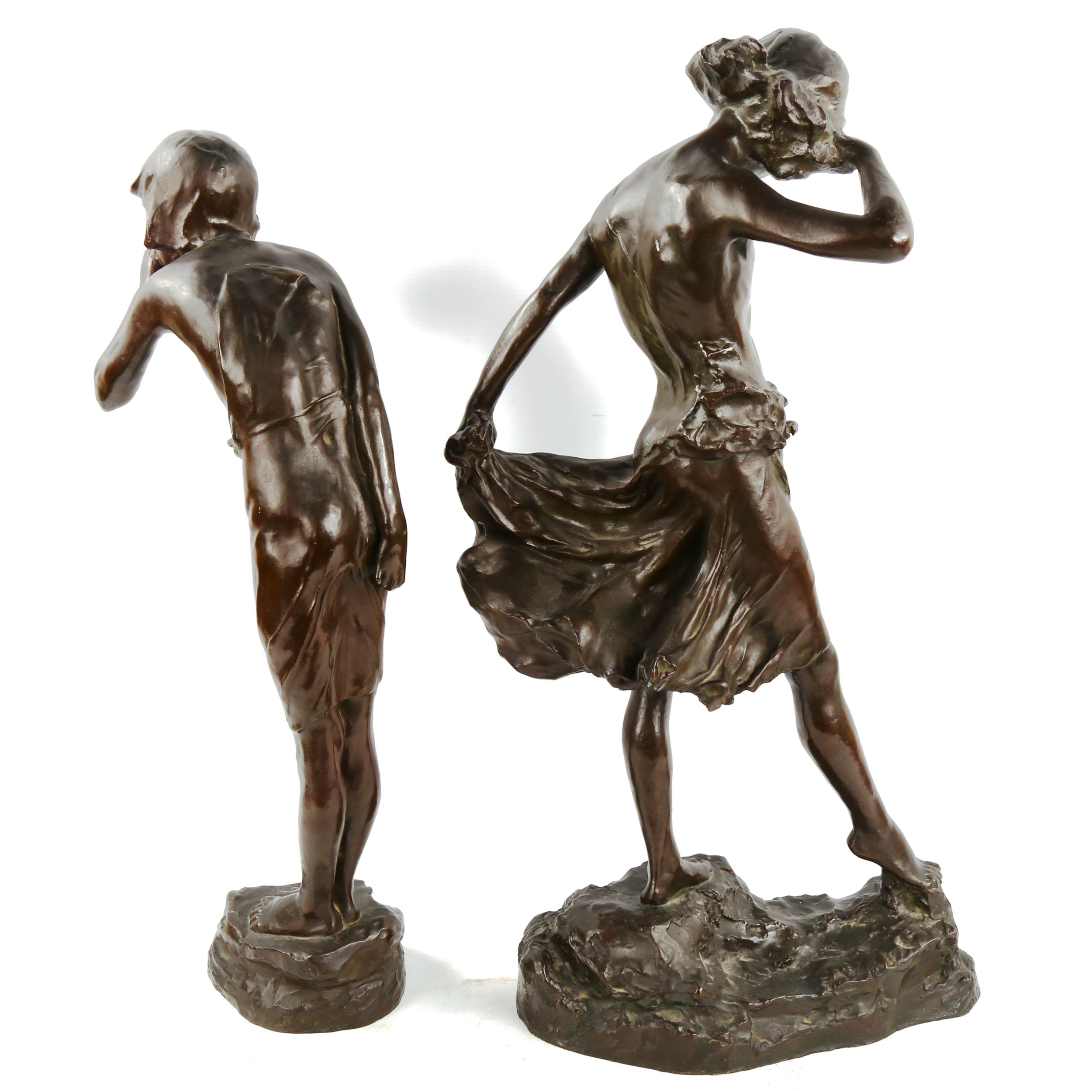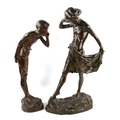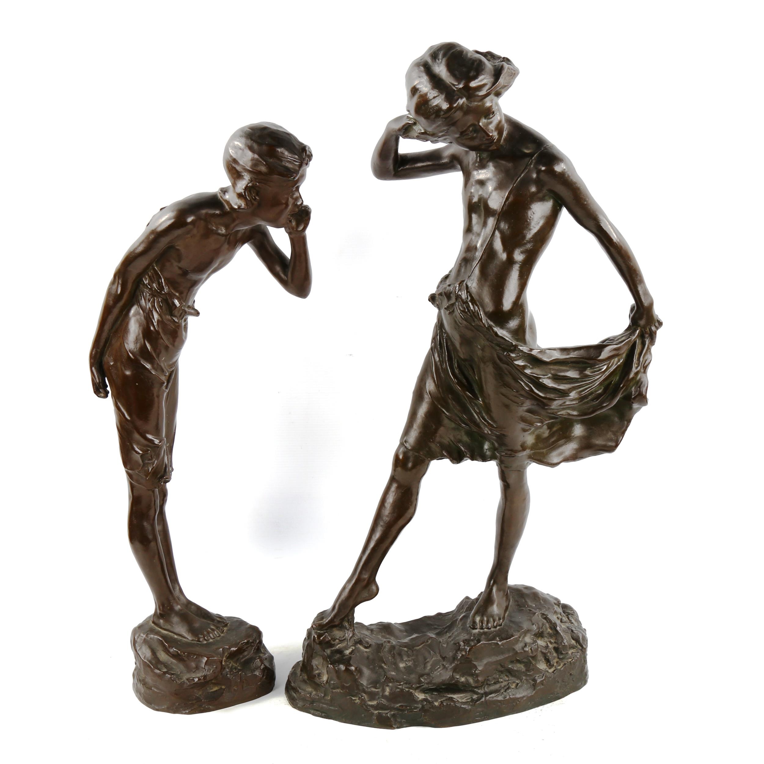 A pair of patinated bronze sculptures of whispering children, early 20th century, unsigned, largest height 64cm