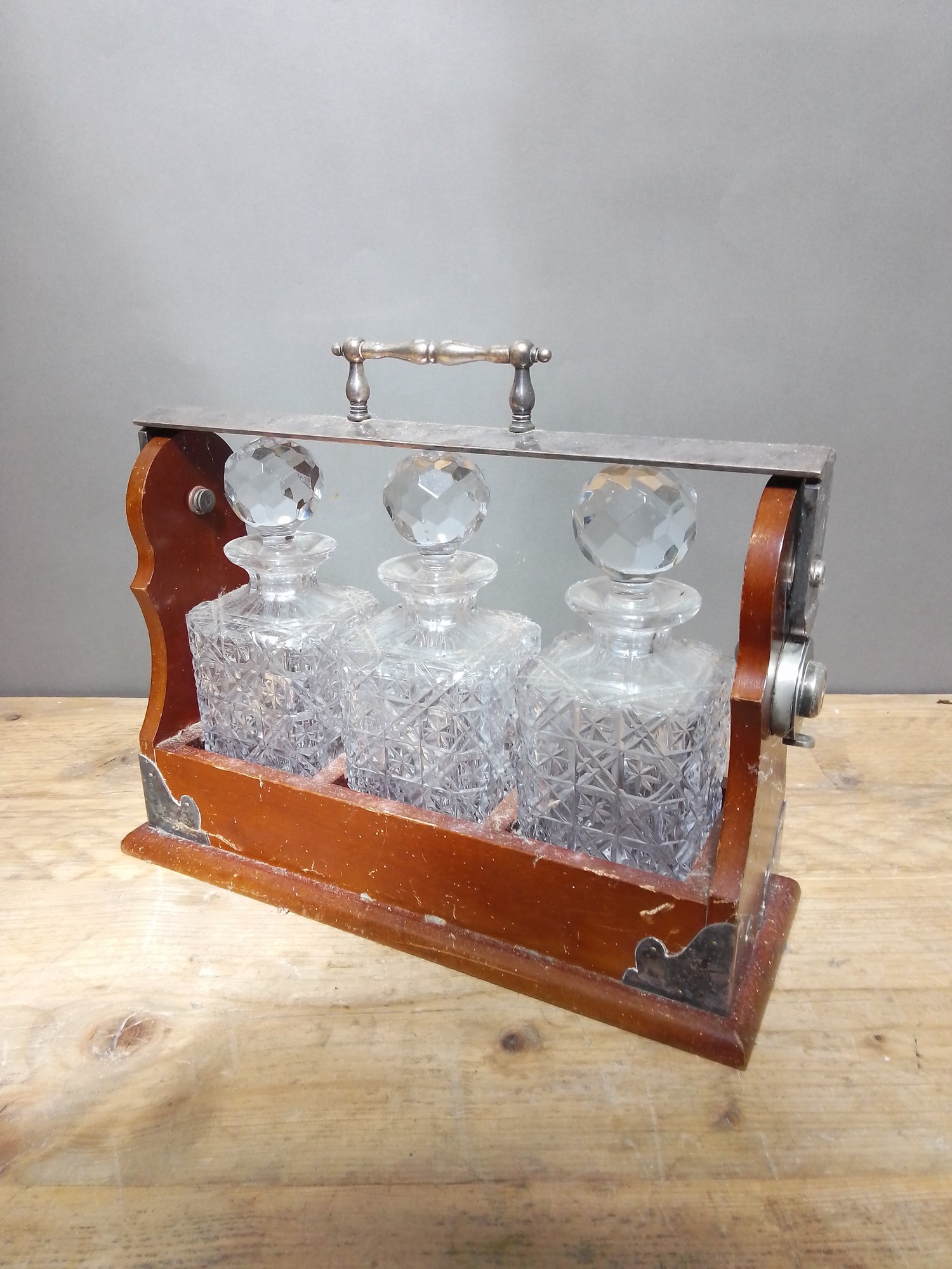 A silver plated tantalus with three cut glass decanters.