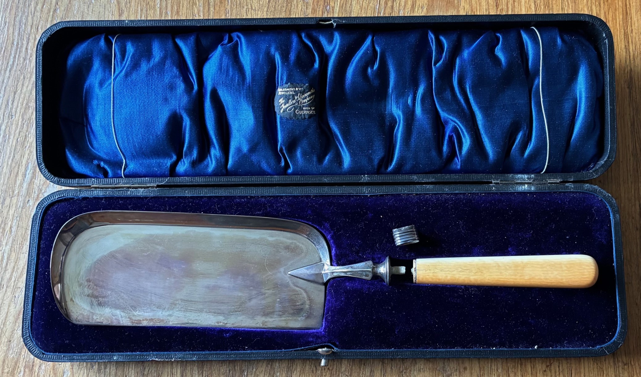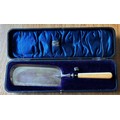 Silver crumb tidy, Sheffield 1894 by George Howson, with bone handle in a fitted box, together with a silver circular trinket box, Birmingham 1916 by A. & J. Zimmerman, combined silver weight 195 grams.
