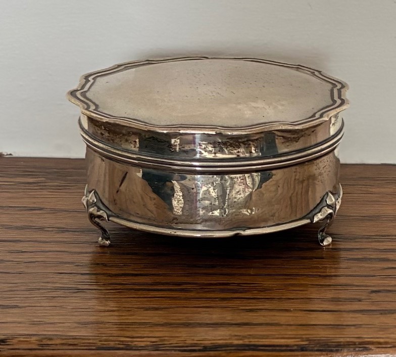 The crumb tidy has become detached from its handle. The trinket box has a few dents and faults commensurate with age.