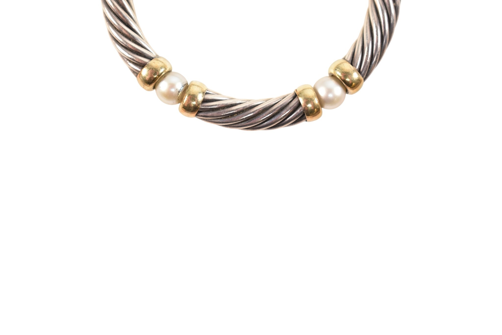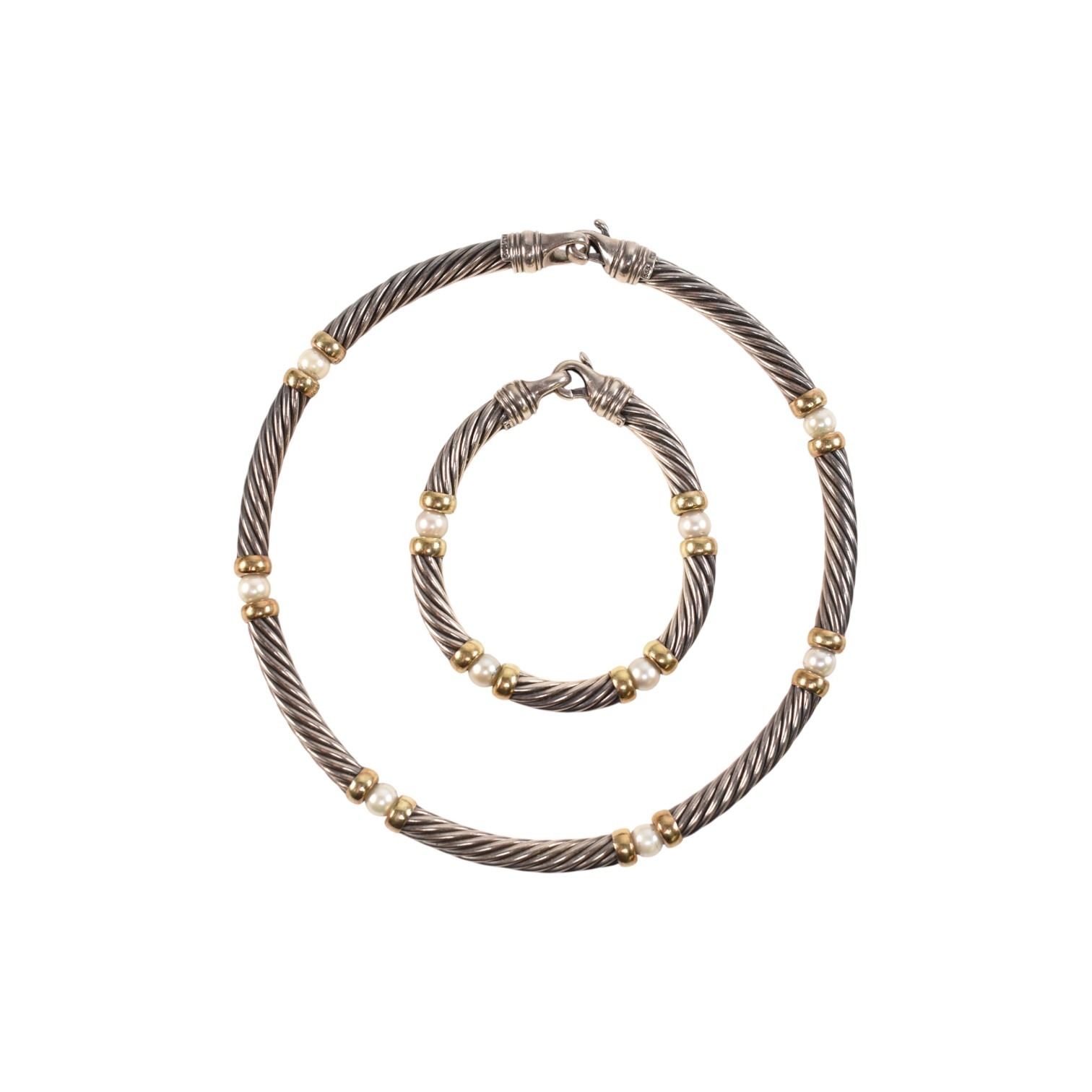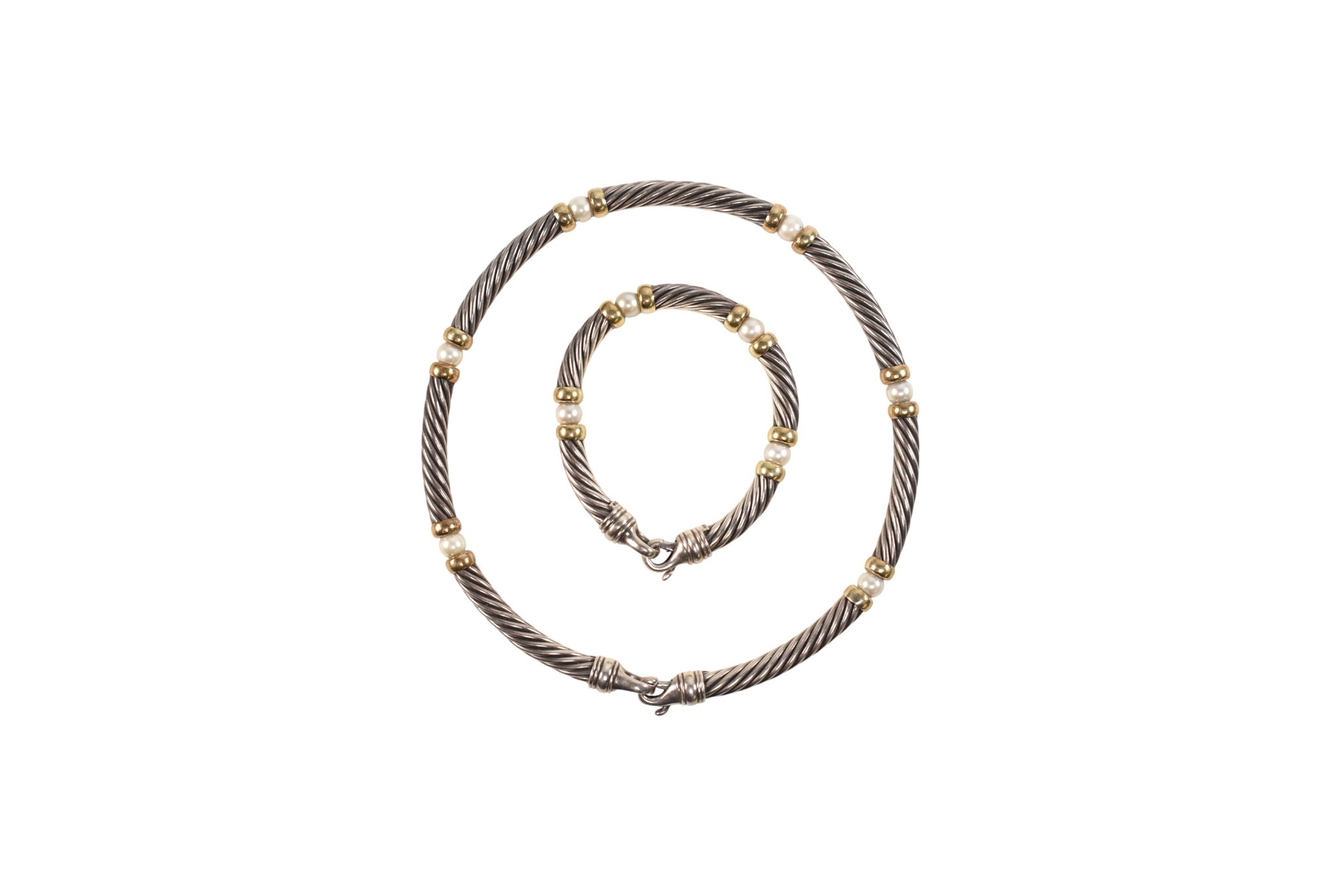 A David Yurman Hampton silver and 14ct gold and pearl necklace and earring suite. Signed 925 585 D.Y. Weight 140g. Measures Bracelet 19cm, necklace 40cm.