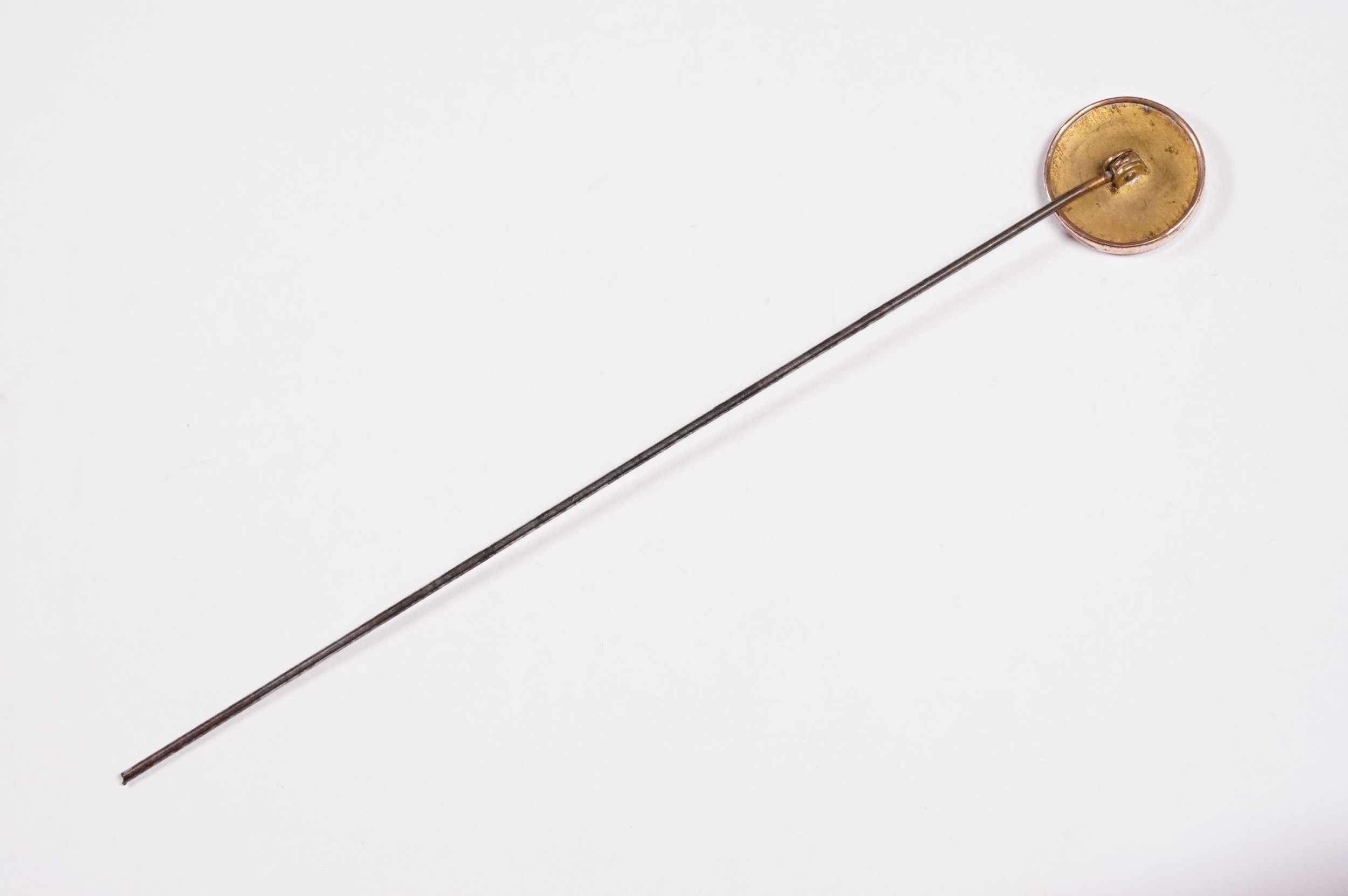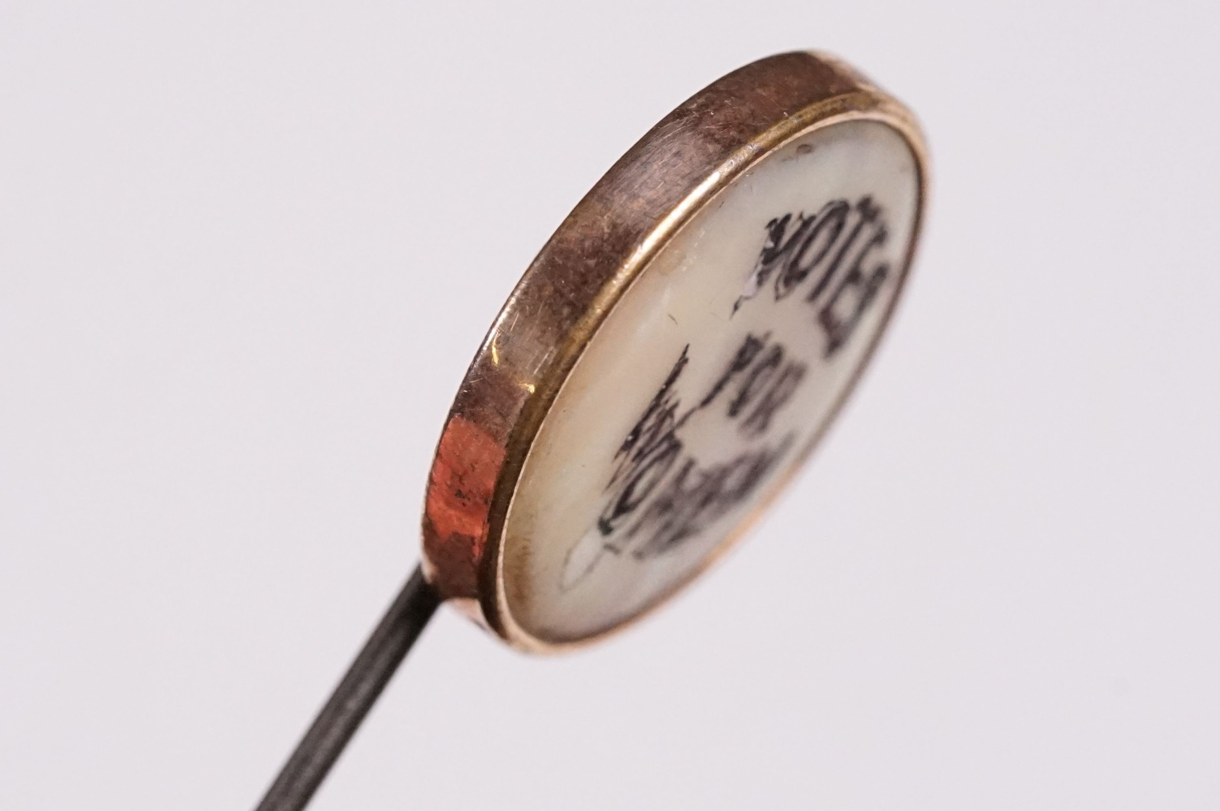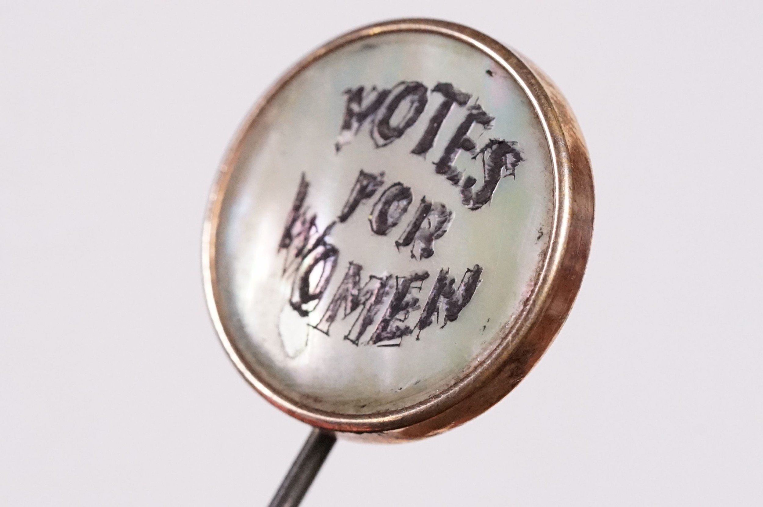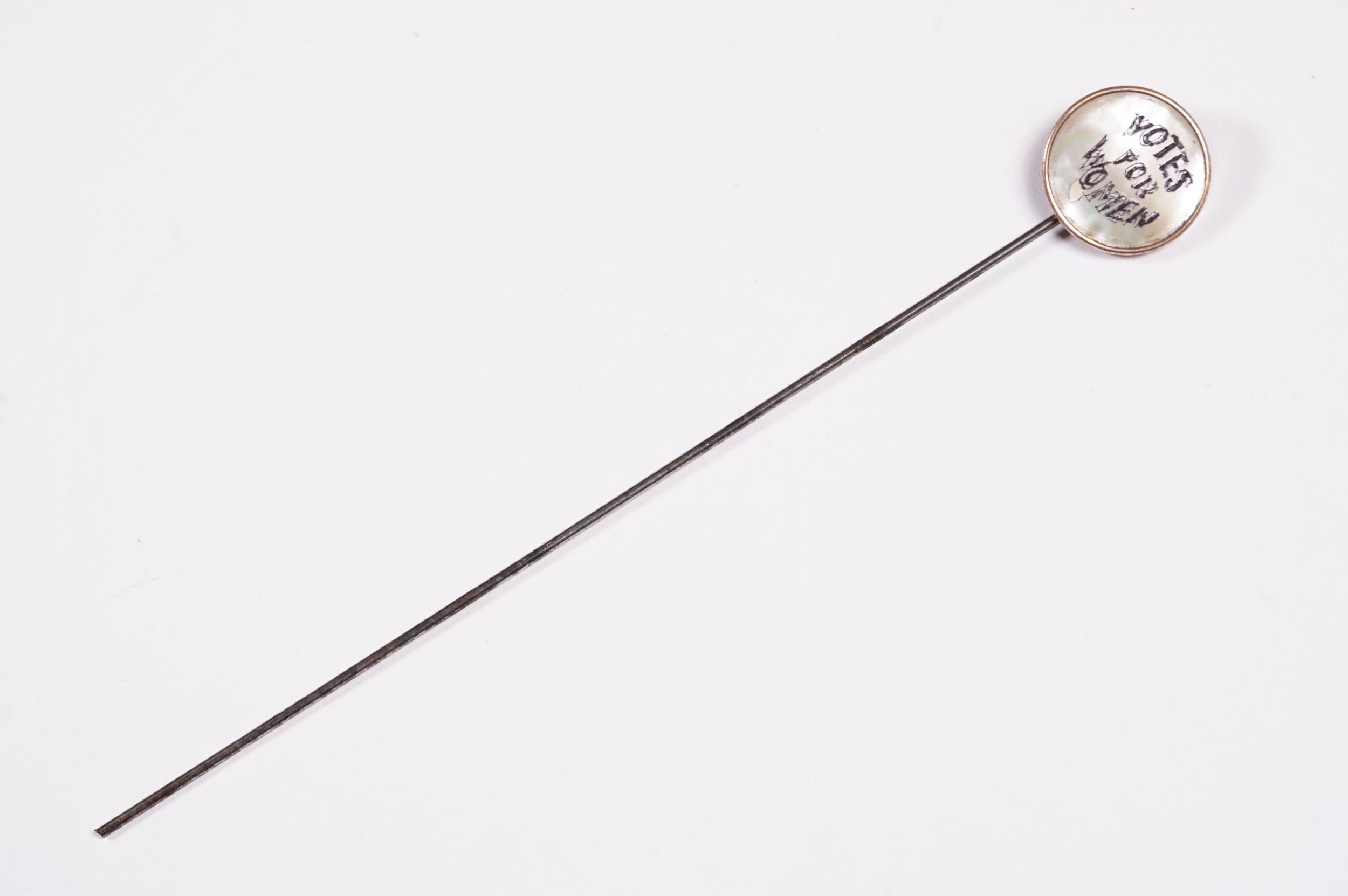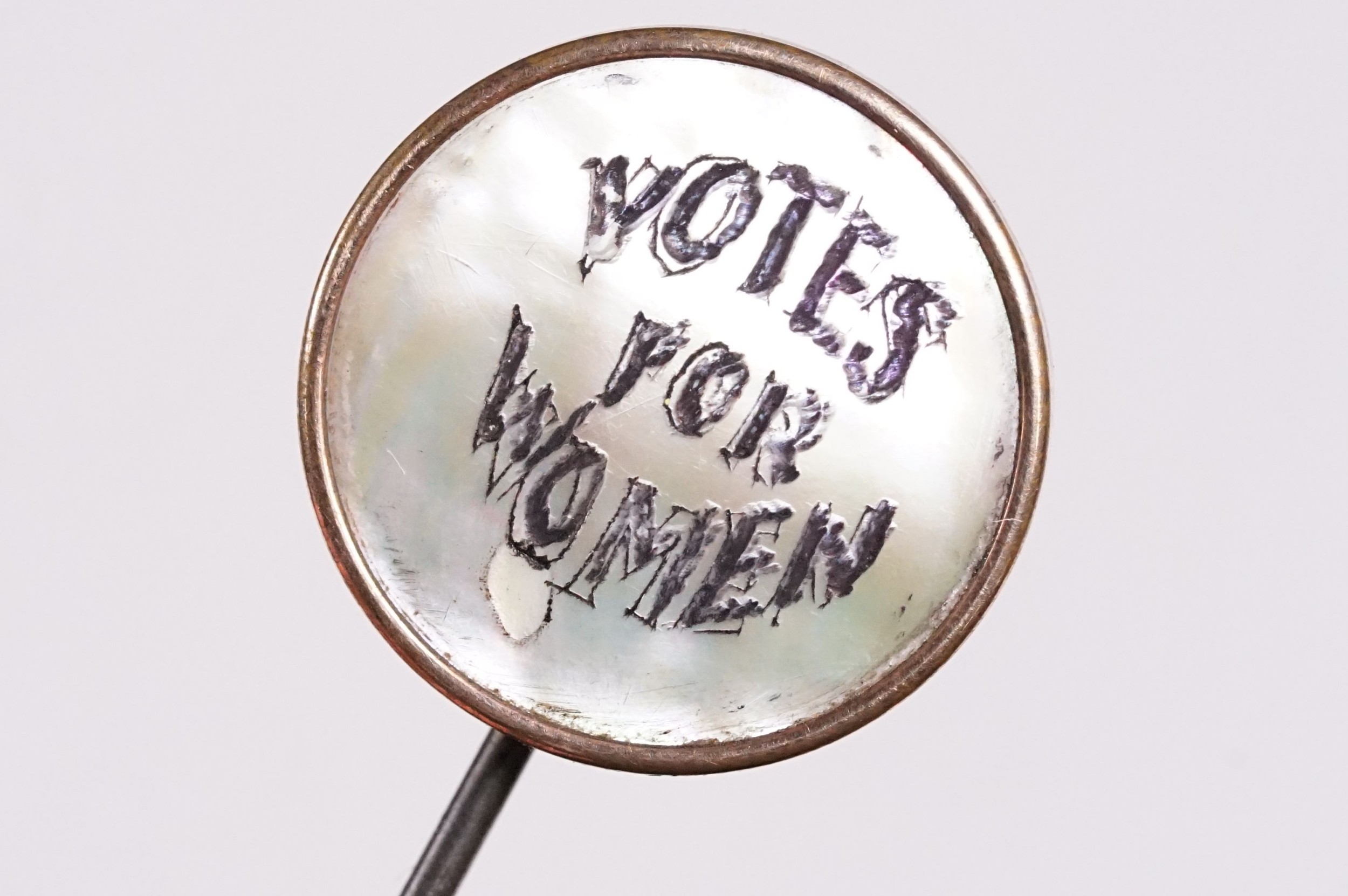 Suffragette Interest - Early 20th Century 'Votes For Women' WSPU brass hat pin with mother of pearl finial with engraved 'Votes For Women' inscription, measures approx 17cm long