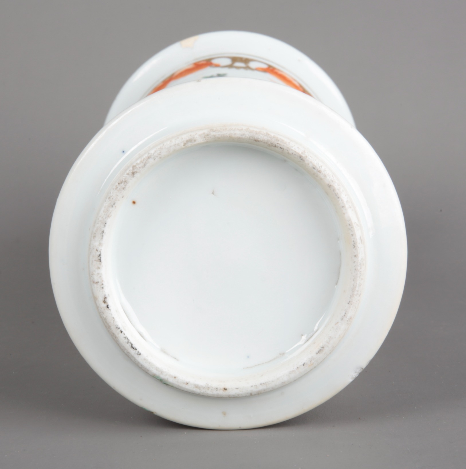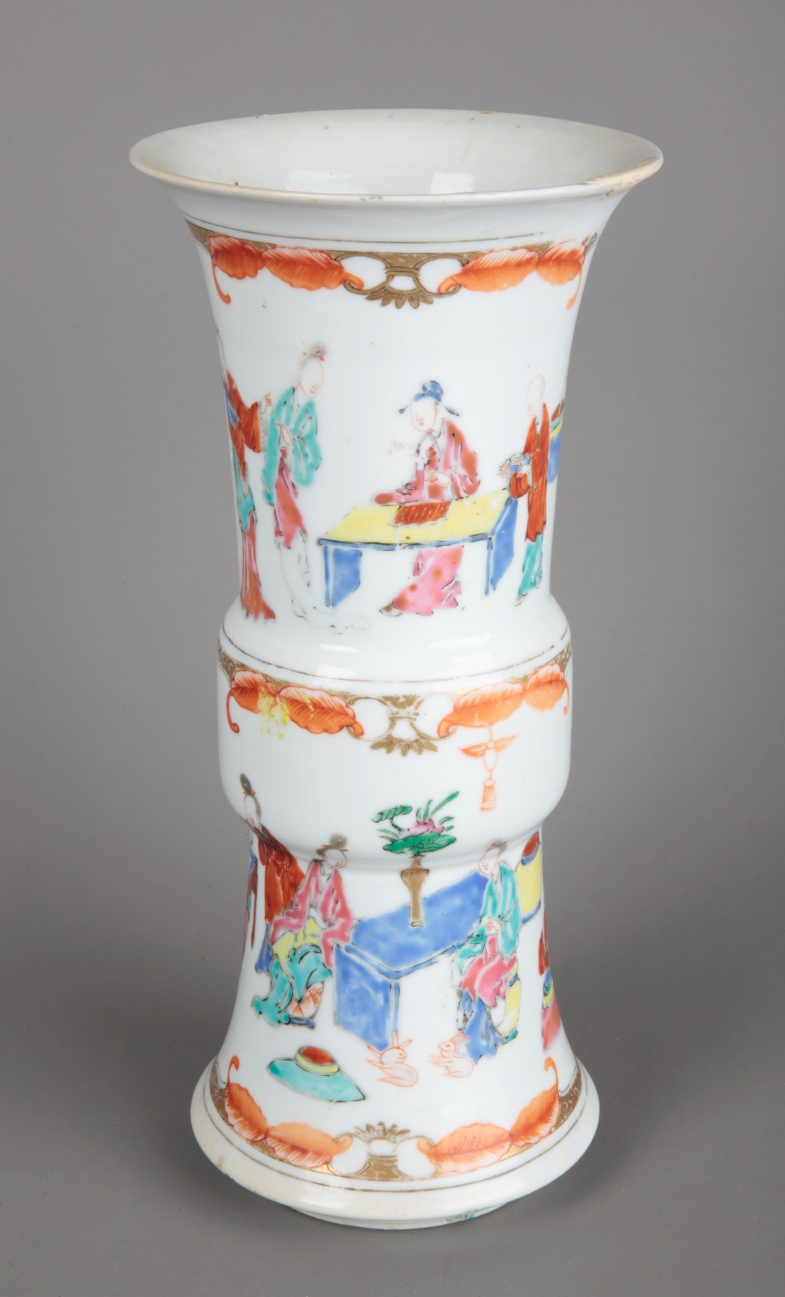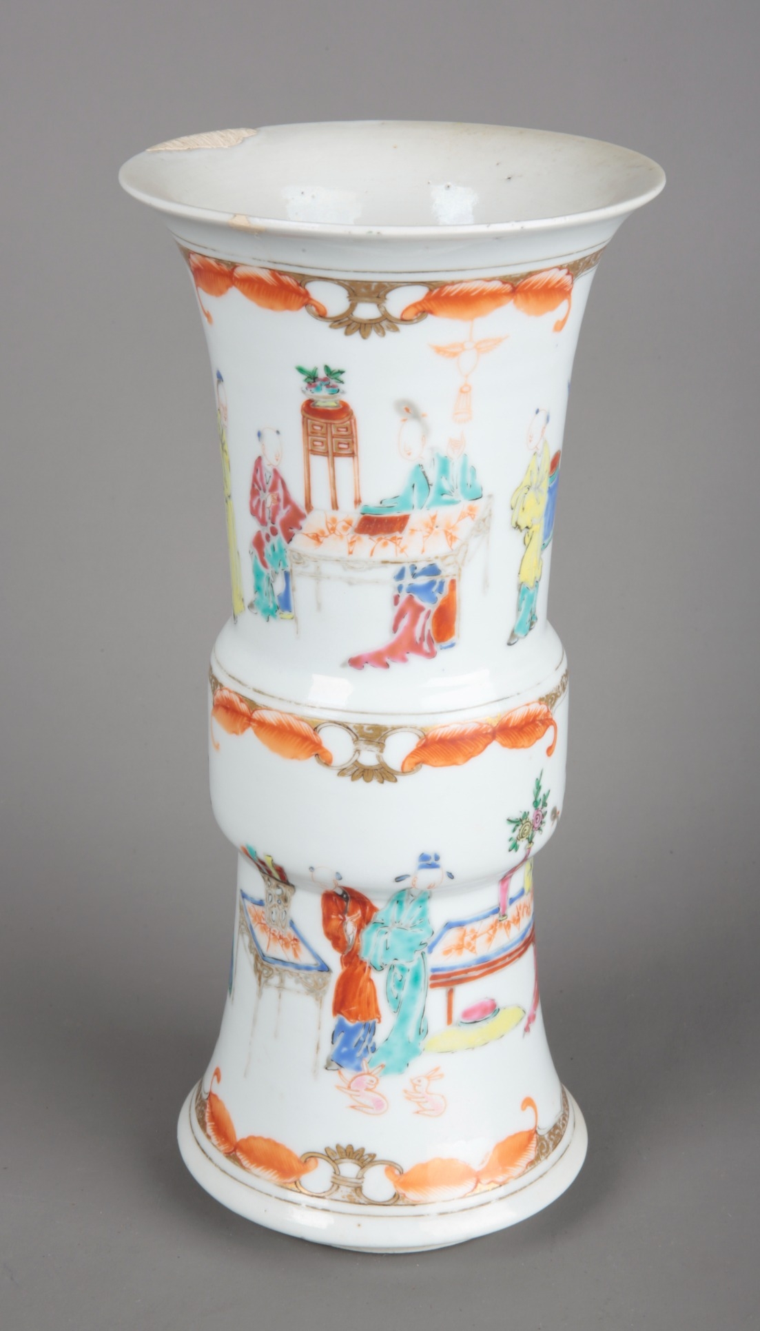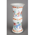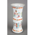 A CHINESE PORCELAIN FAMILLE ROSE GU FORM VASEQing dynasty, decorated with figures in luxurious interiors, 25.5cm high x 12cm diameter