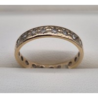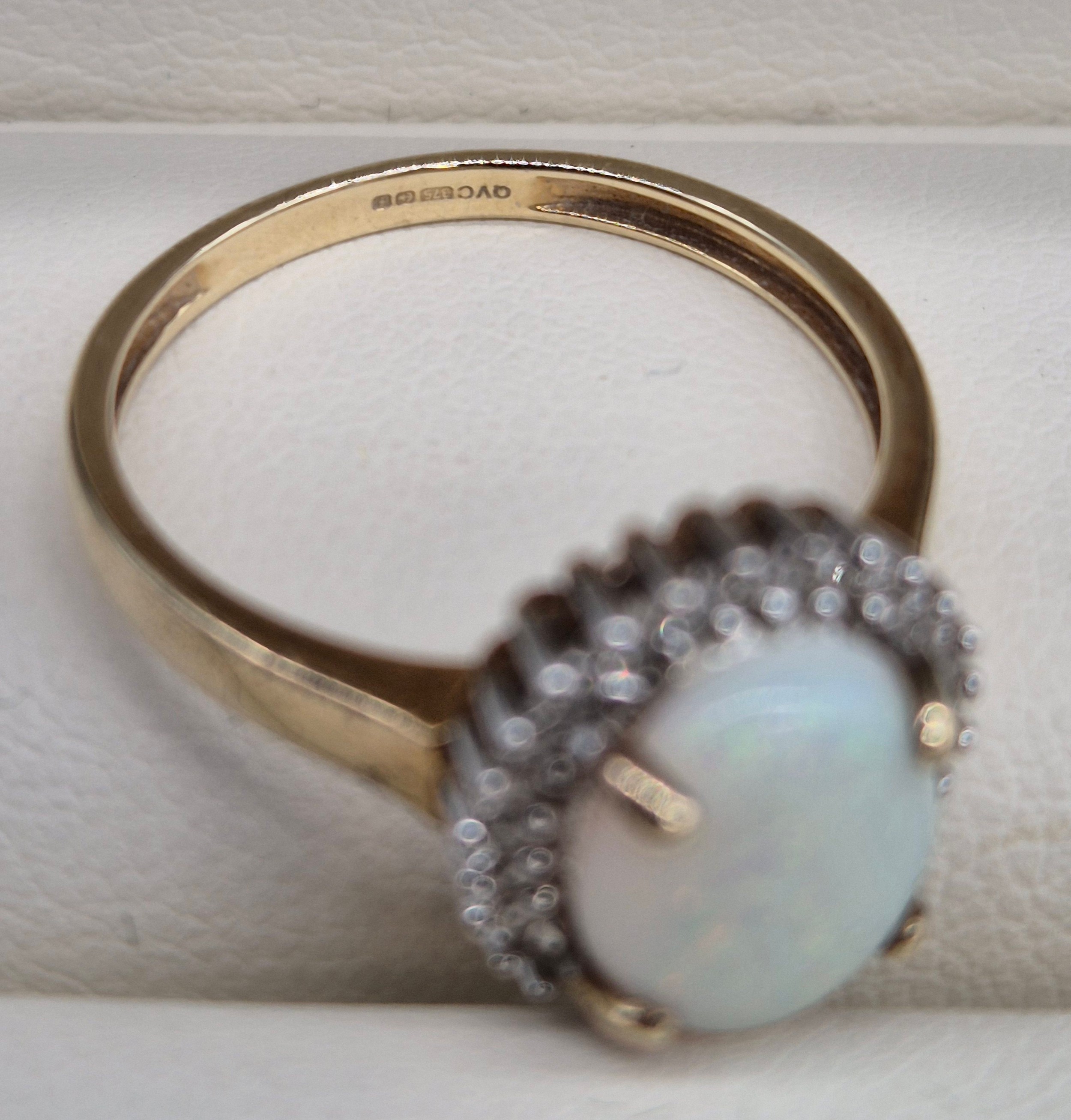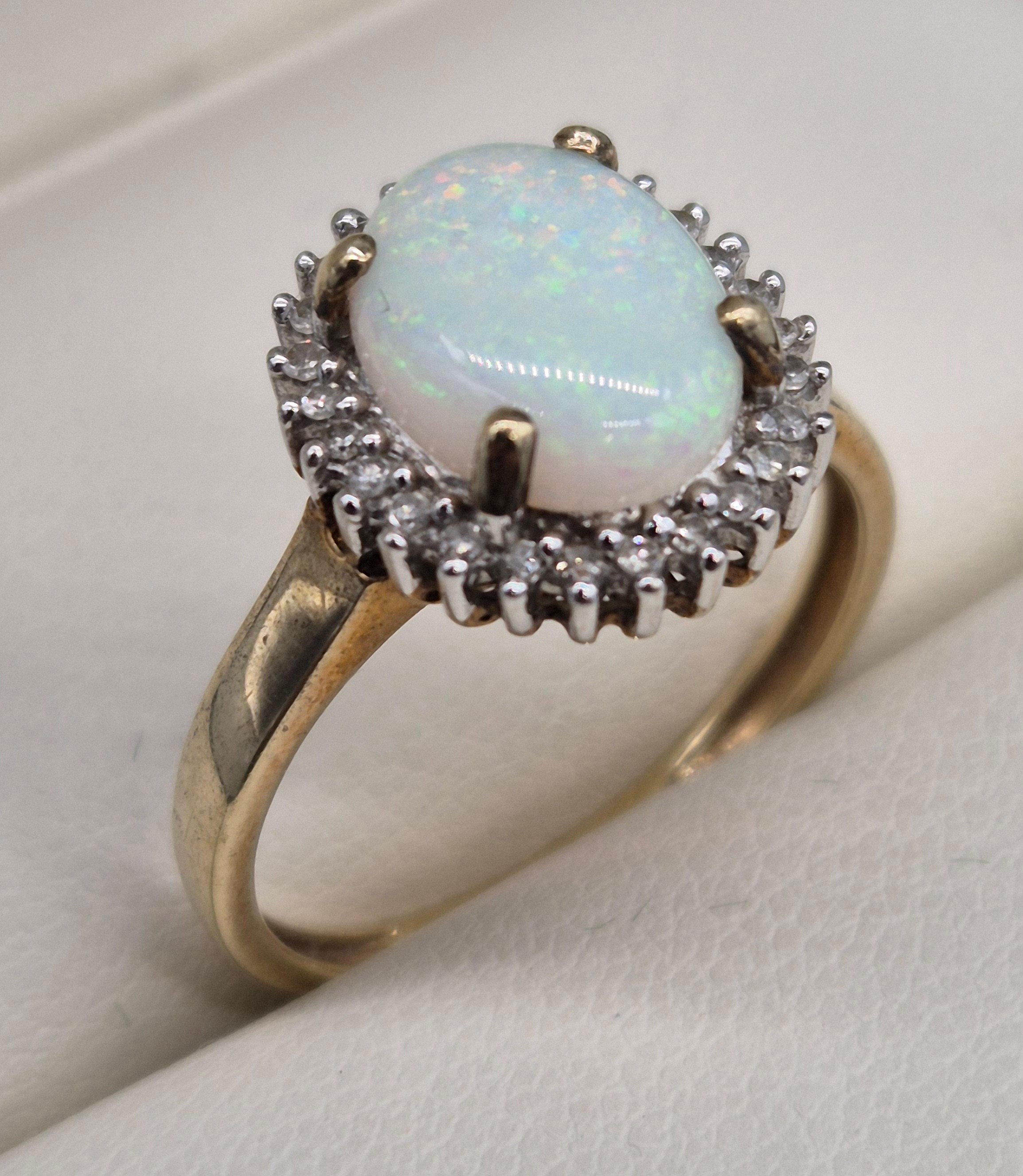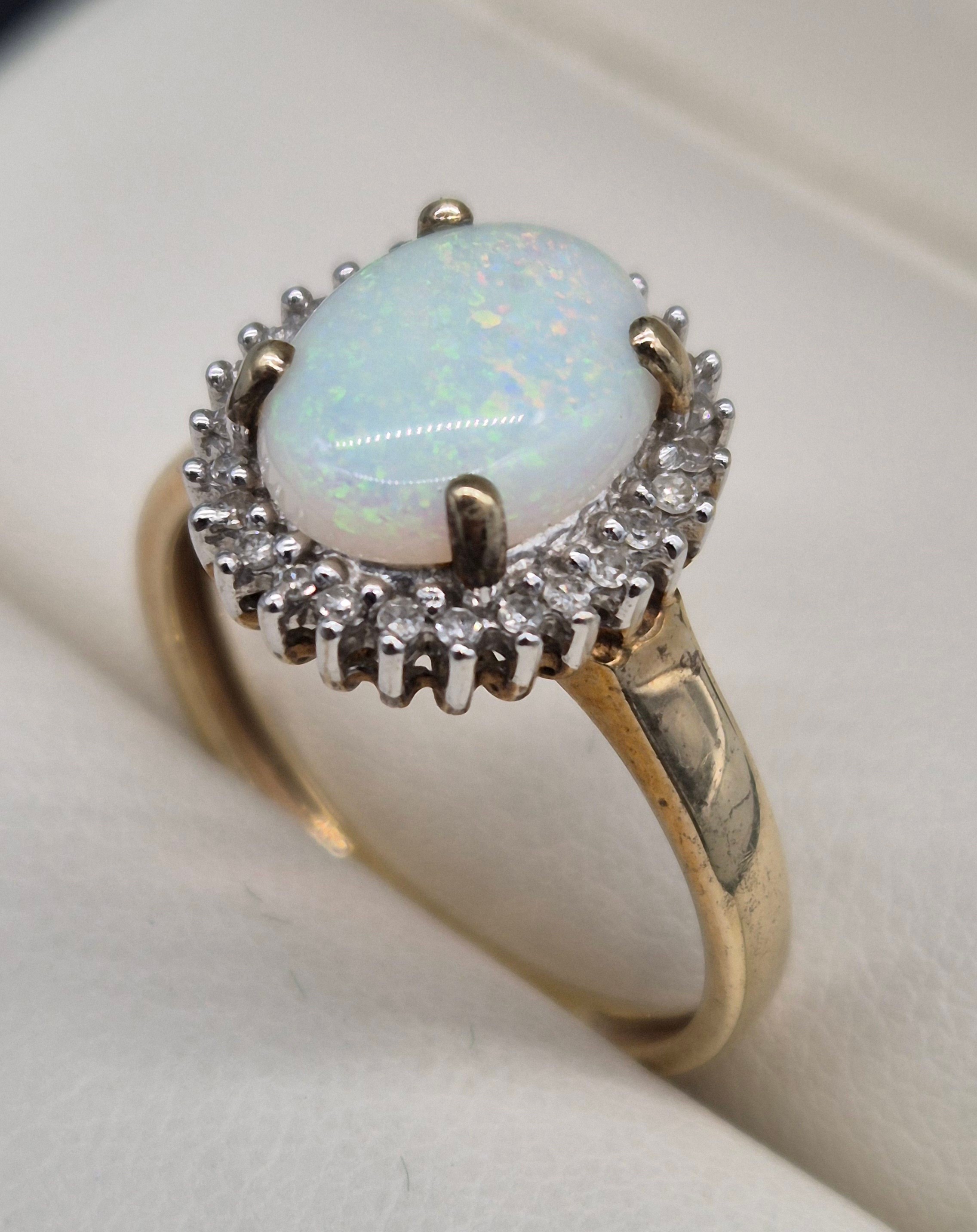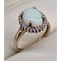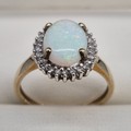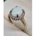 9ct yellow gold, opal and diamond stone ring. Large cabochon opal gem stone surrounded by round cut diamonds. 2.75Grams. Ring size P.