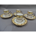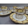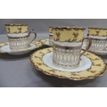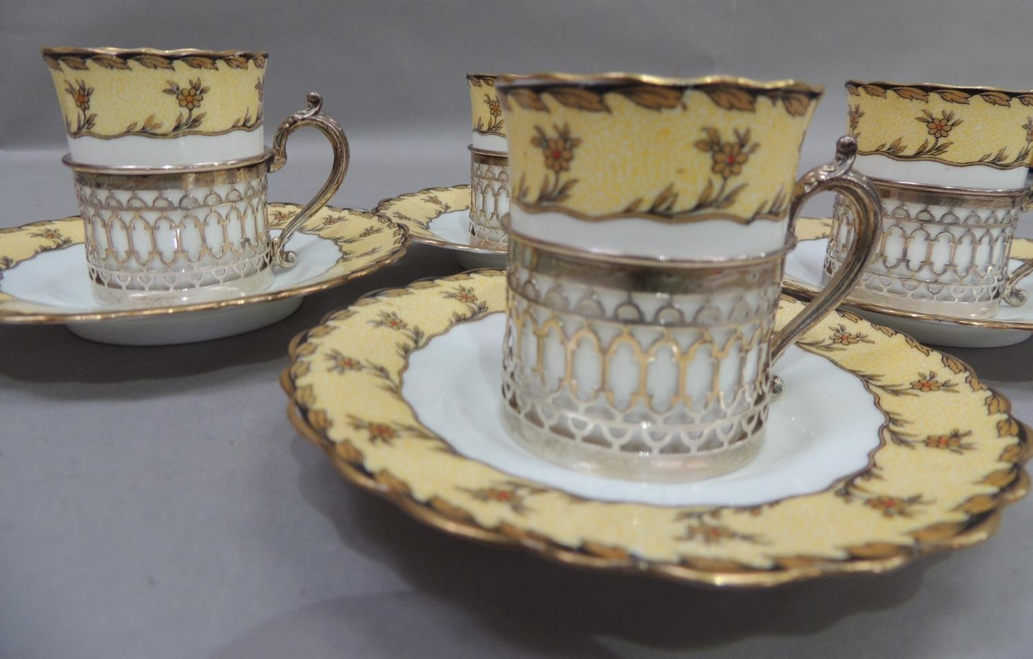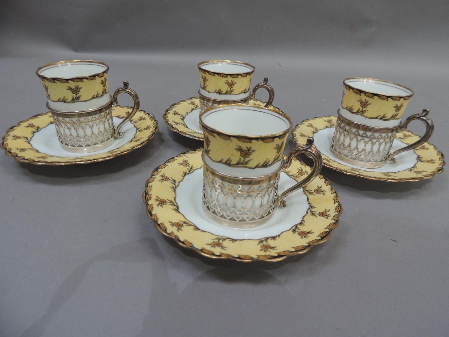 A set of four Aynsley porcelain coffee cans and saucers, the cans set within pierced silver cylindrical mounts with moulded scrolling handles, printed marks in green no b931 in grey, the cans and saucers decorated with flowers and leafage in brown on a yellow ground