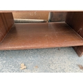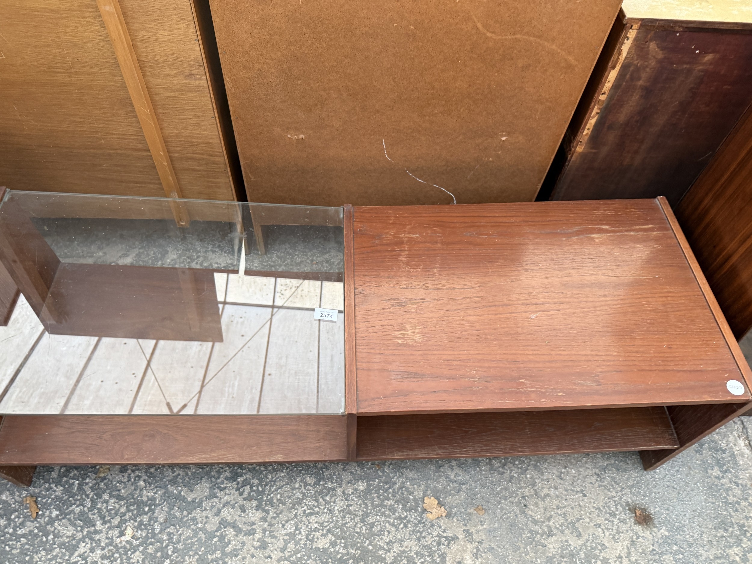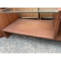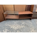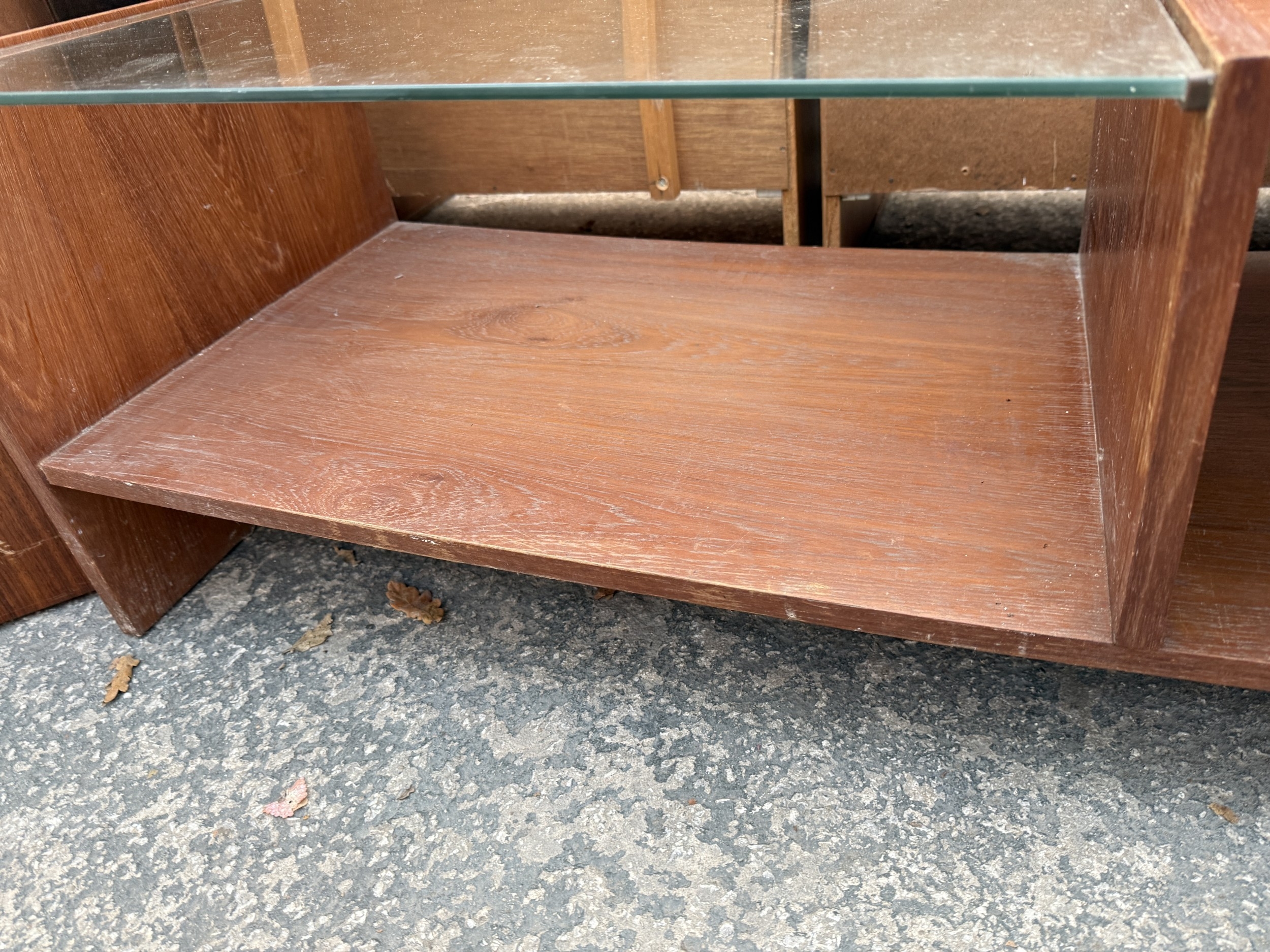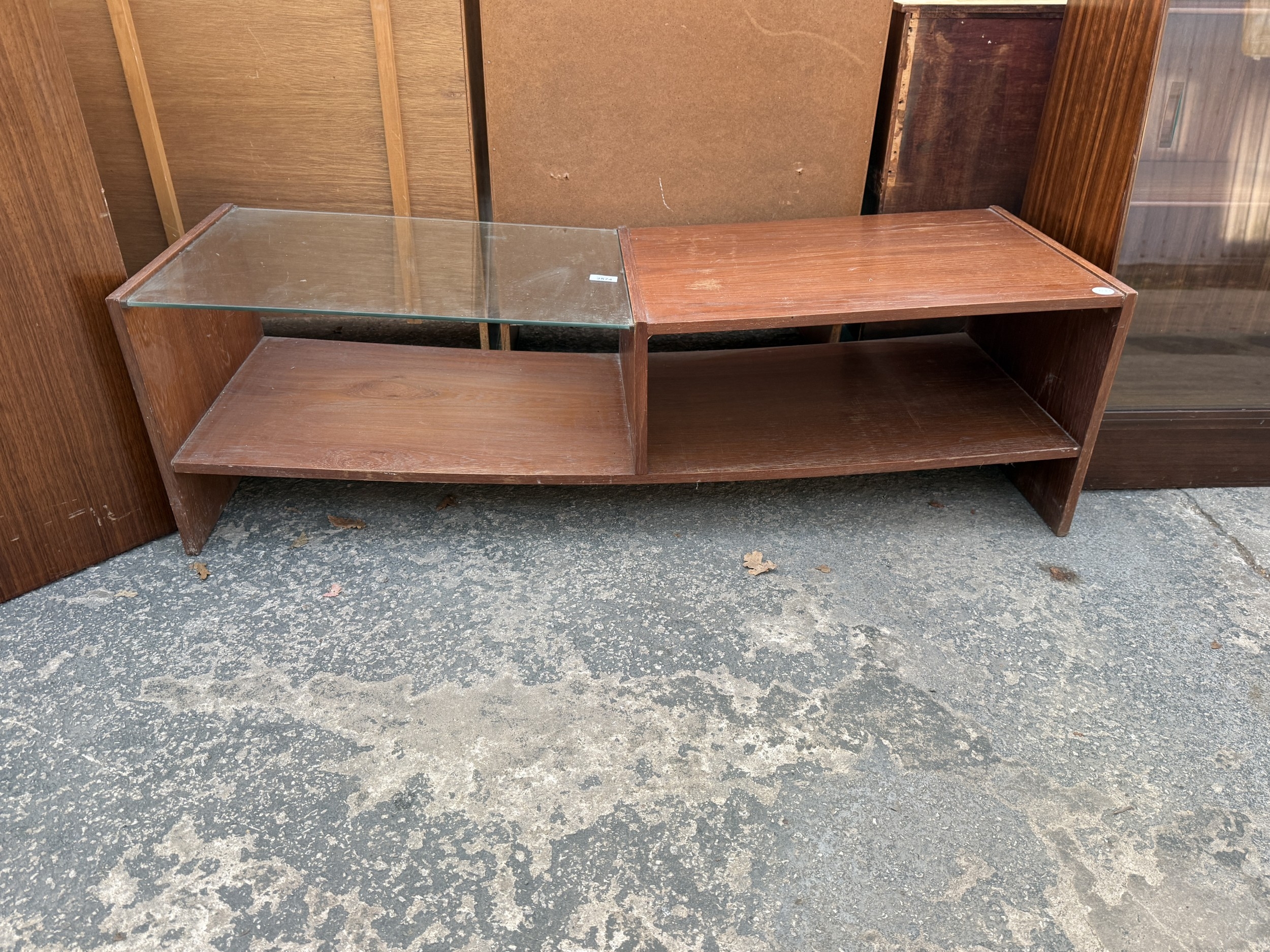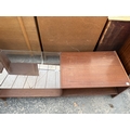 A RETRO TEAK COFFEE TABLE WITH PARTIALLY GLAZED TOP, 50" X 17"