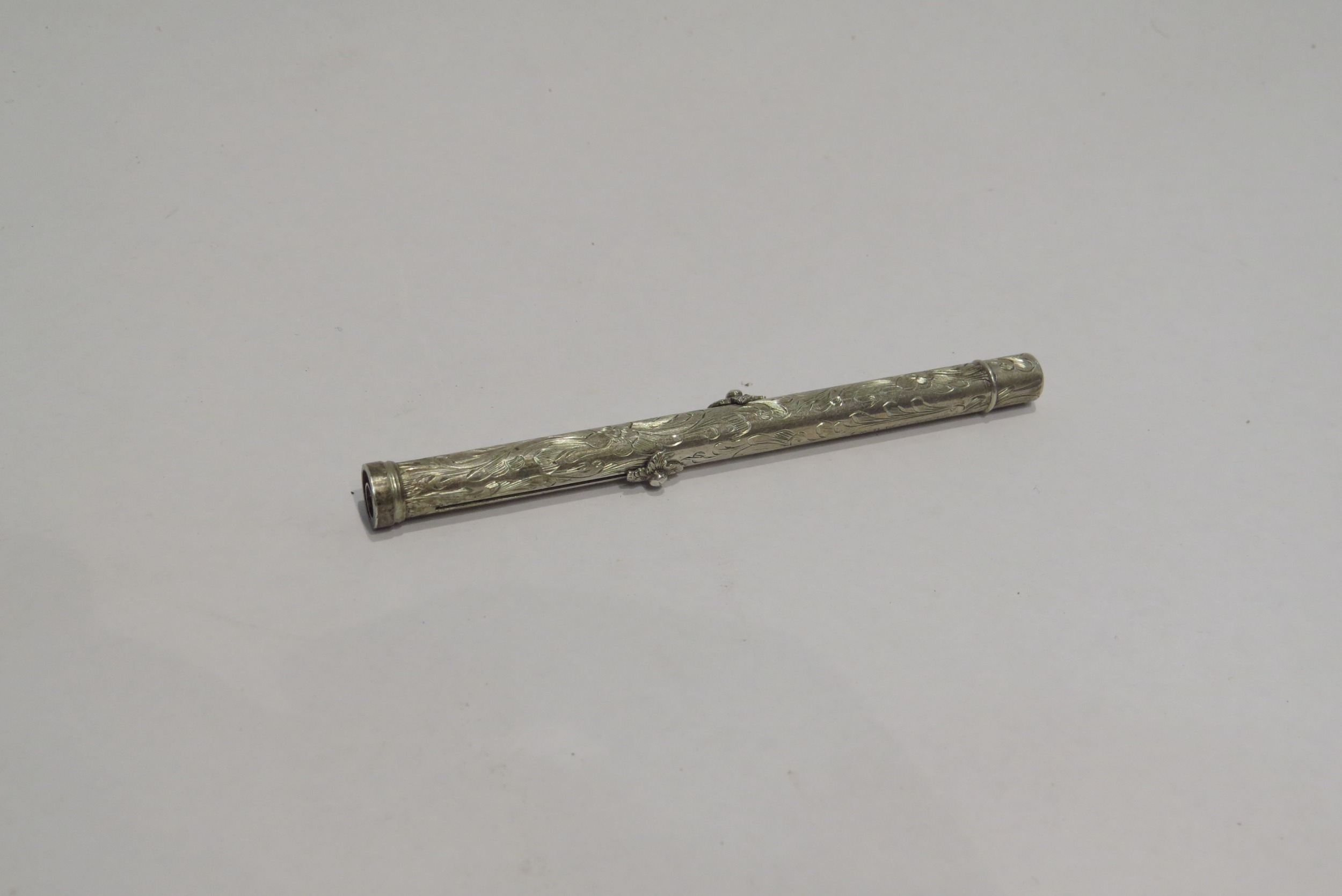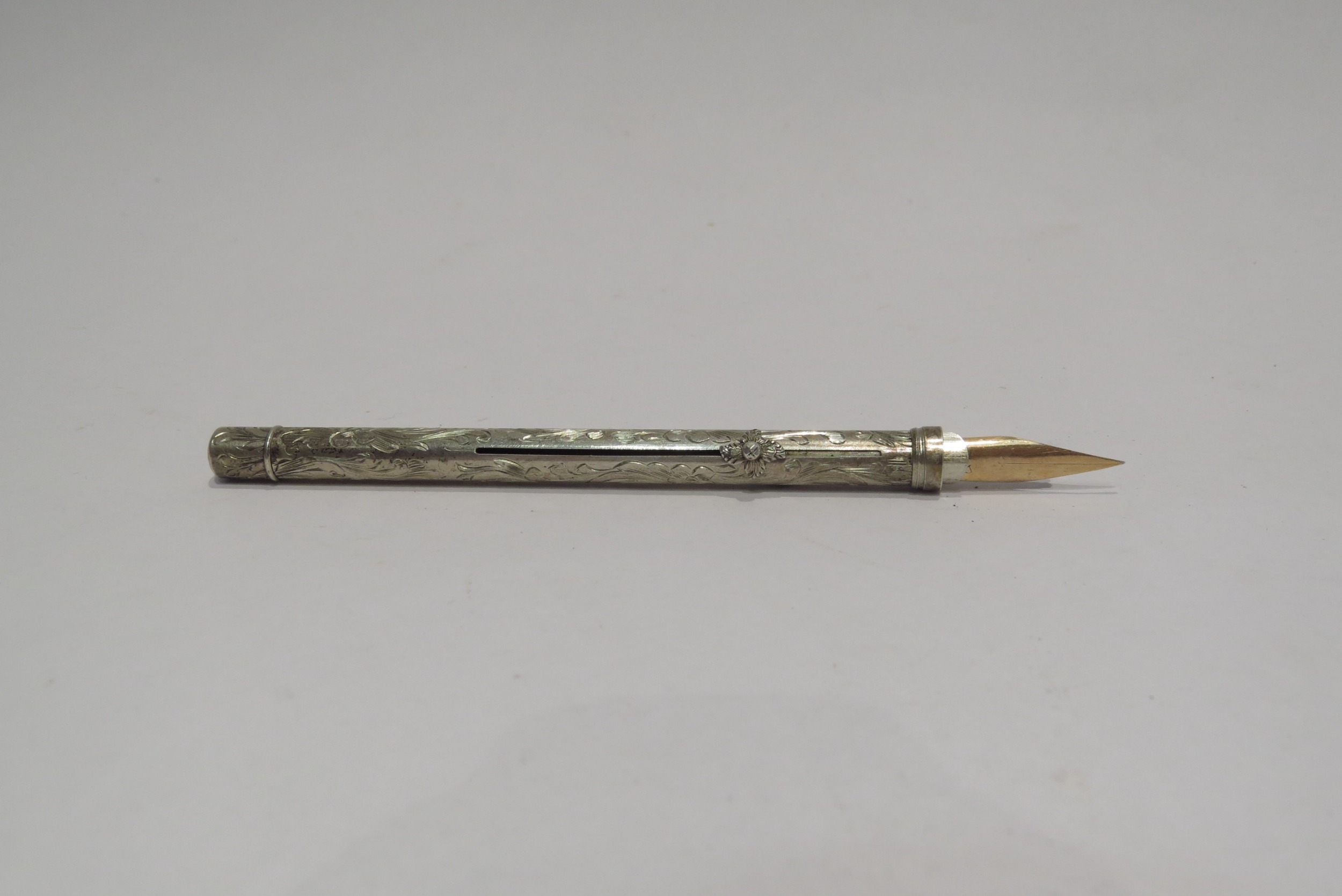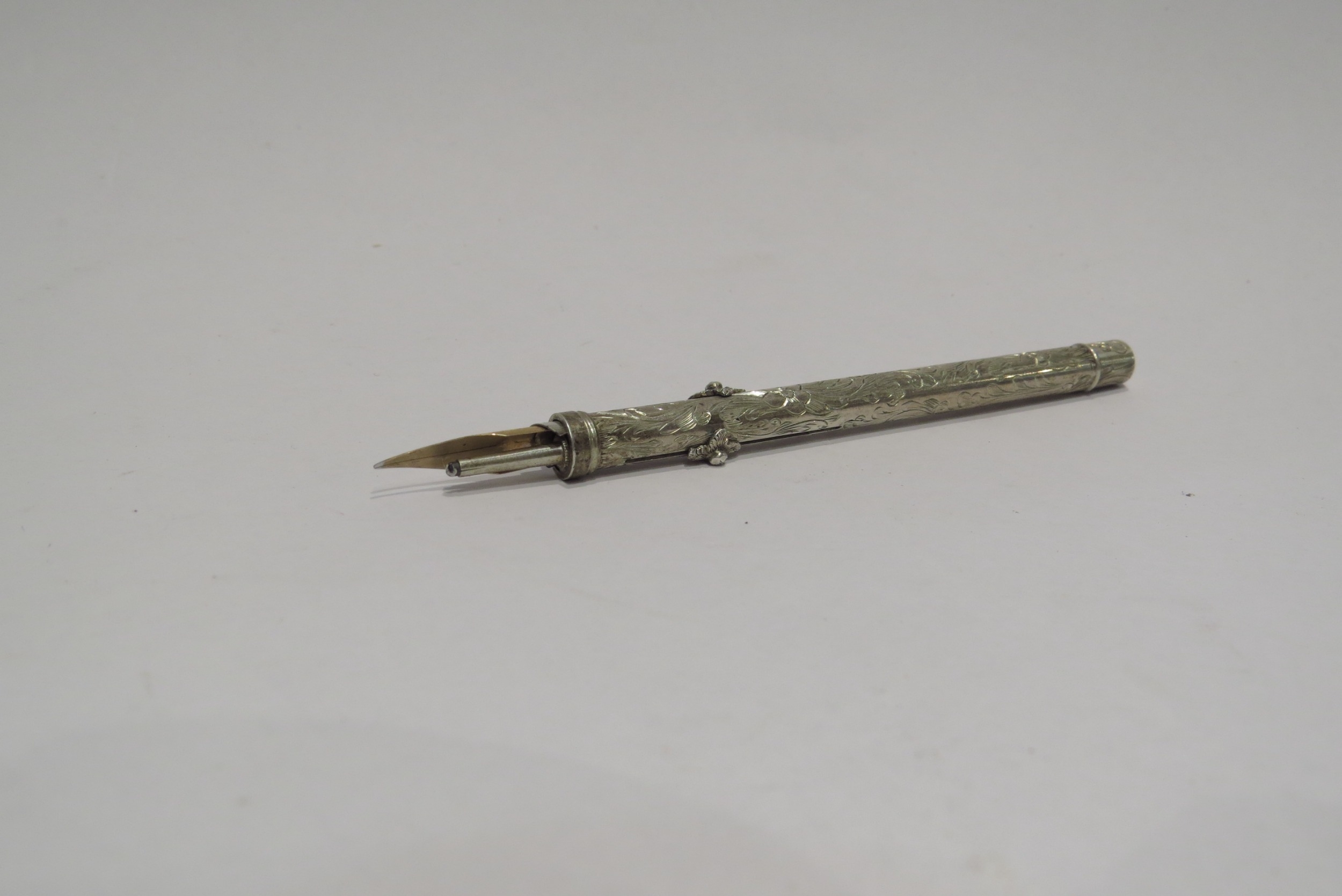 A white metal combination propelling pencil and dip pen, florally engraved (C)