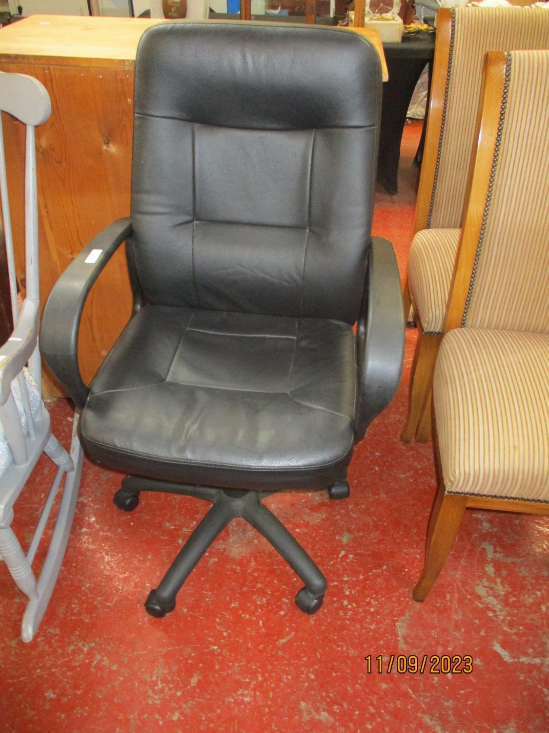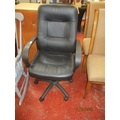 A revolving directors chair upholstered in black faux leather